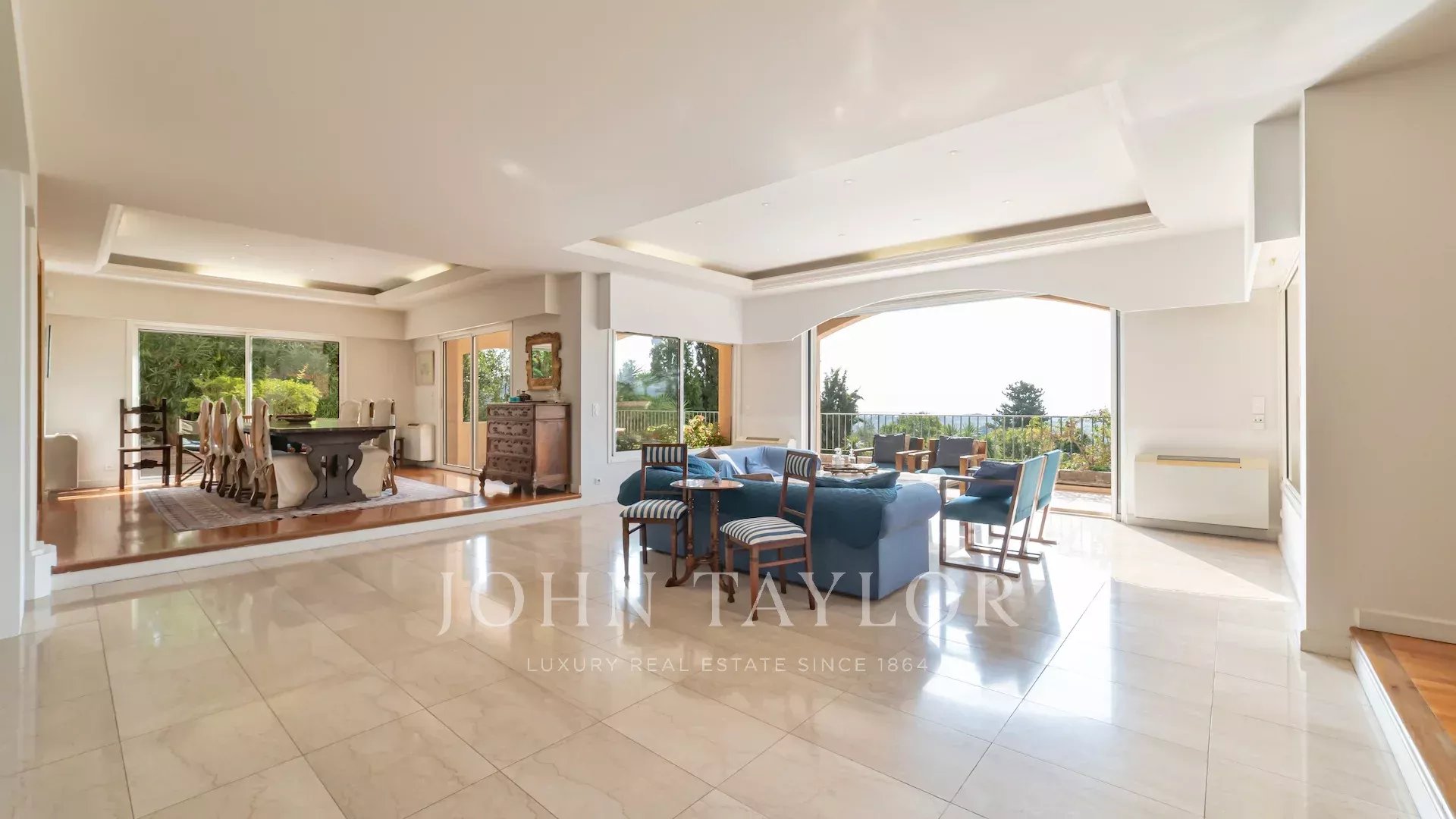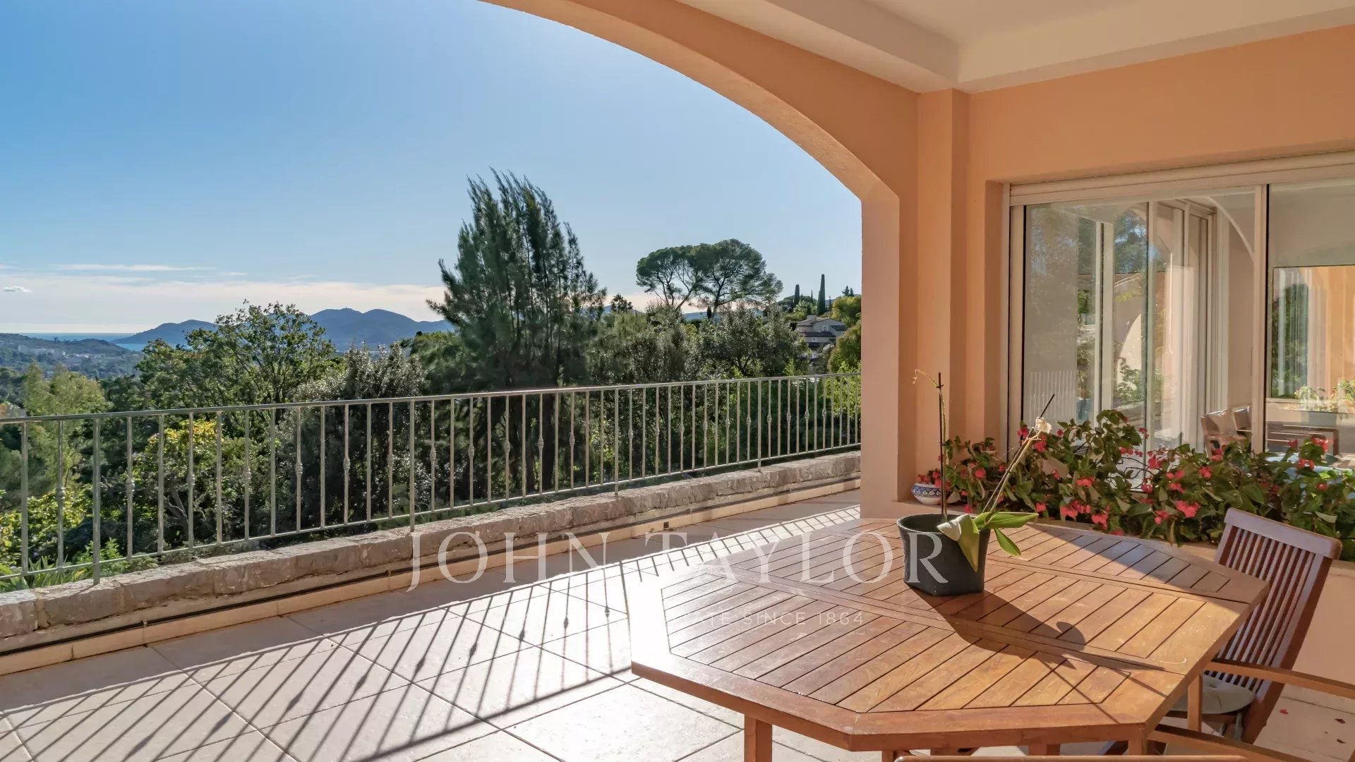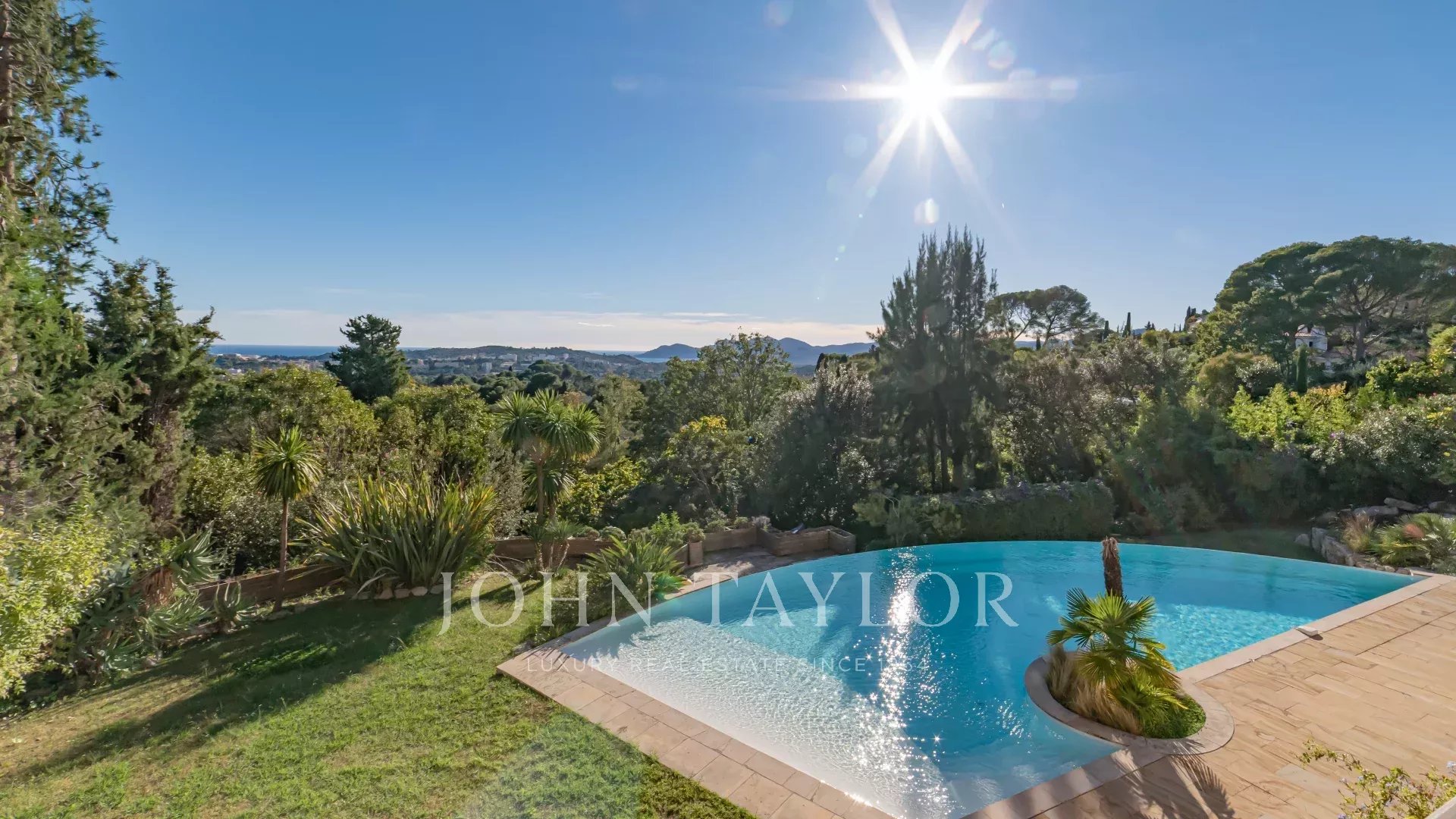 Tra il vecchio villaggio e il centro di Mougins, in un tranquillo vicolo cieco, questa bella villa offre una magnifica vista sul mare, sulle isole di Lérins e sul massiccio dell'Esterel.