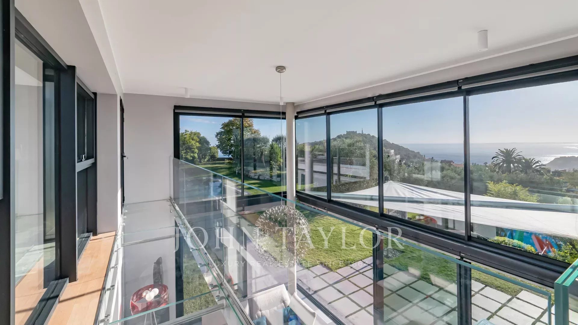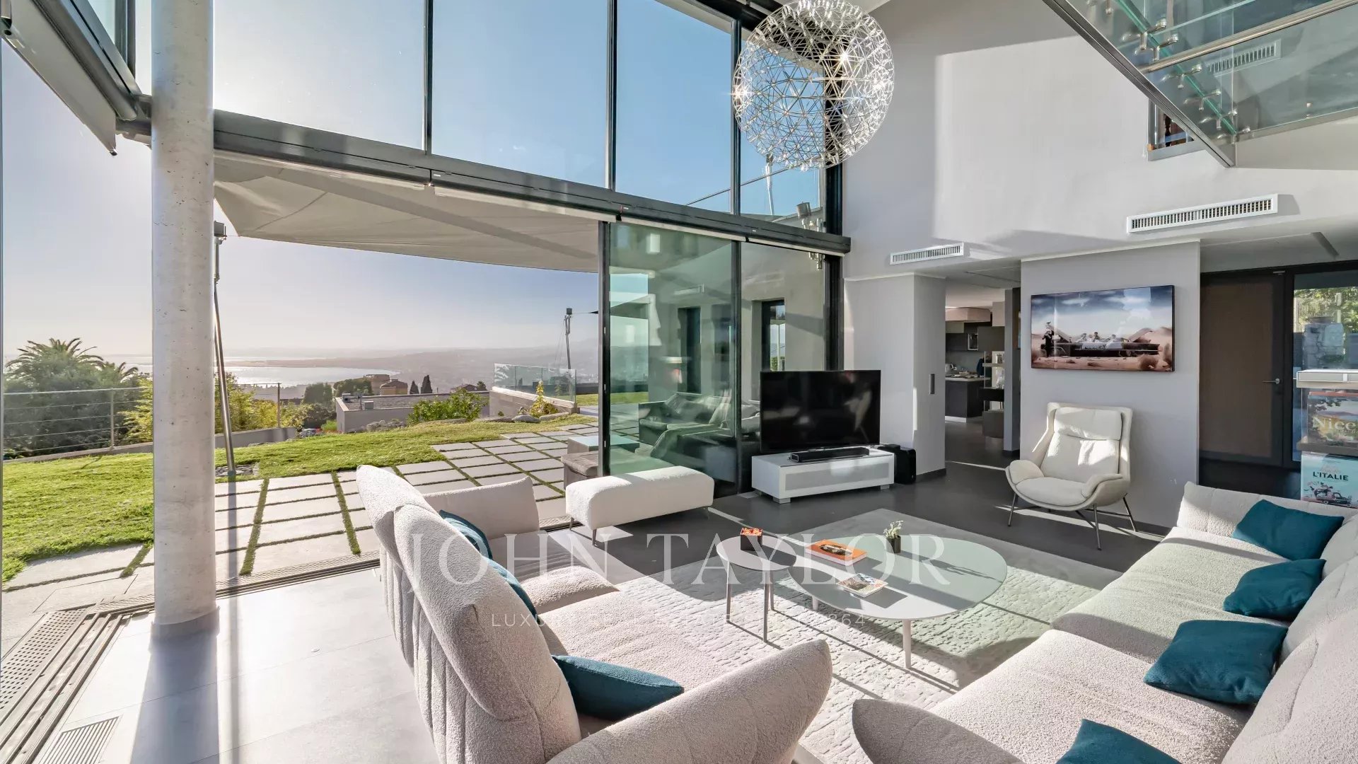 Tutti i soggiorni hanno una vista sul mare e sulle montagne e si aprono su ampie terrazze e sul giardino. Una scala di vetro conduce a tutti i piani.
