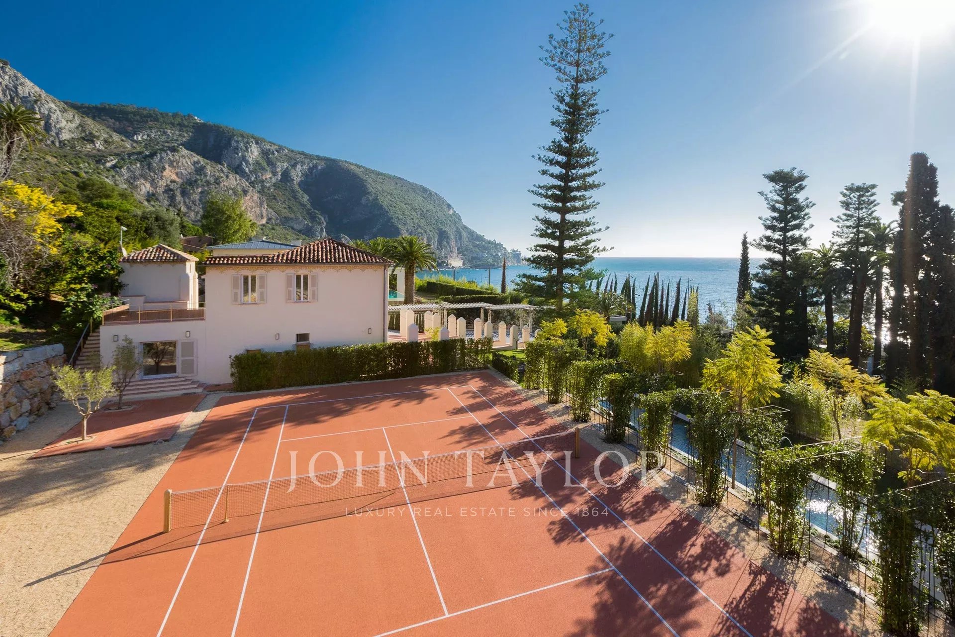 un appartement pour le personnel, 2 piscines, un court de tennis et un garage pour 10 voitures.