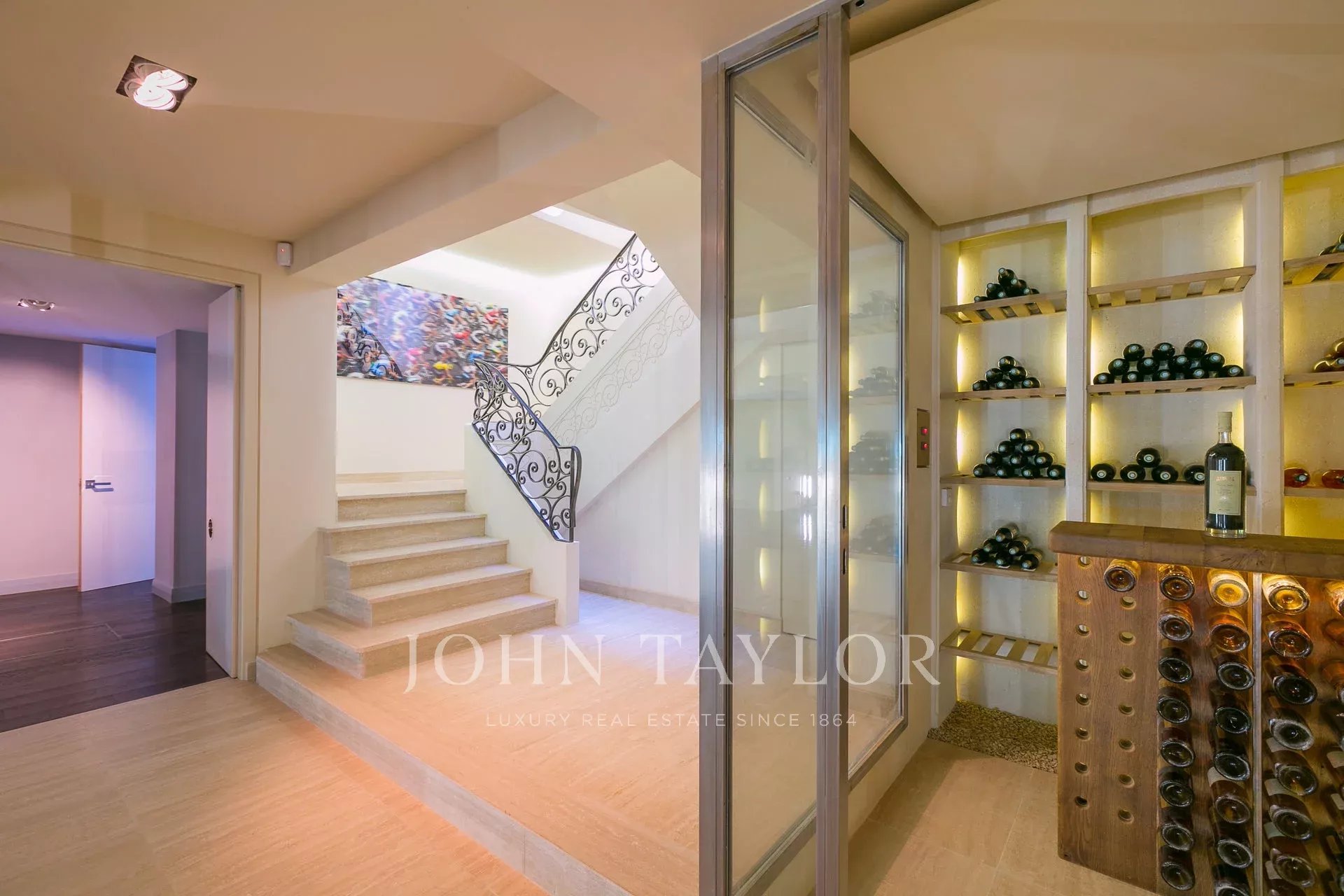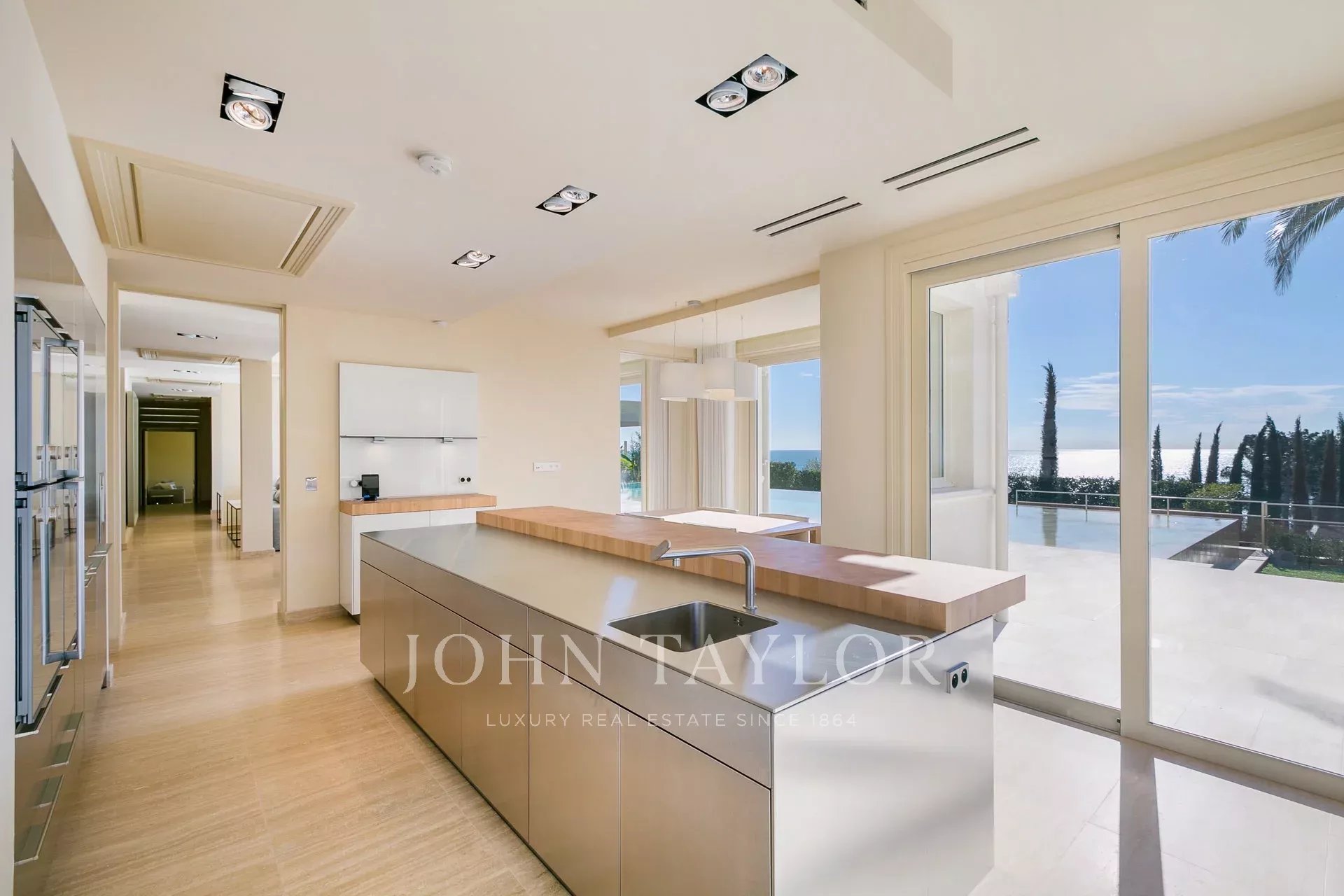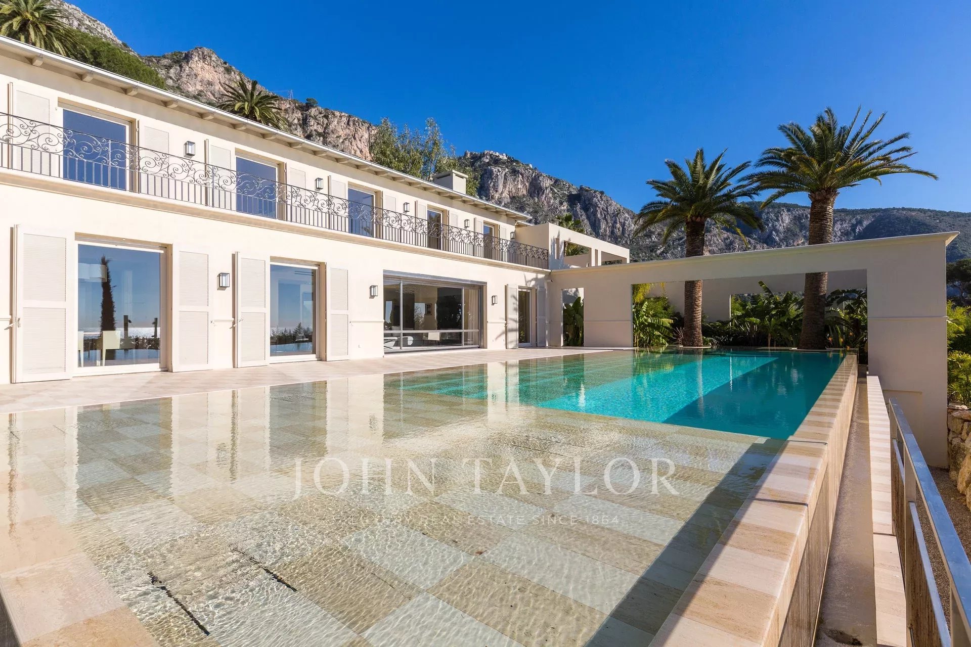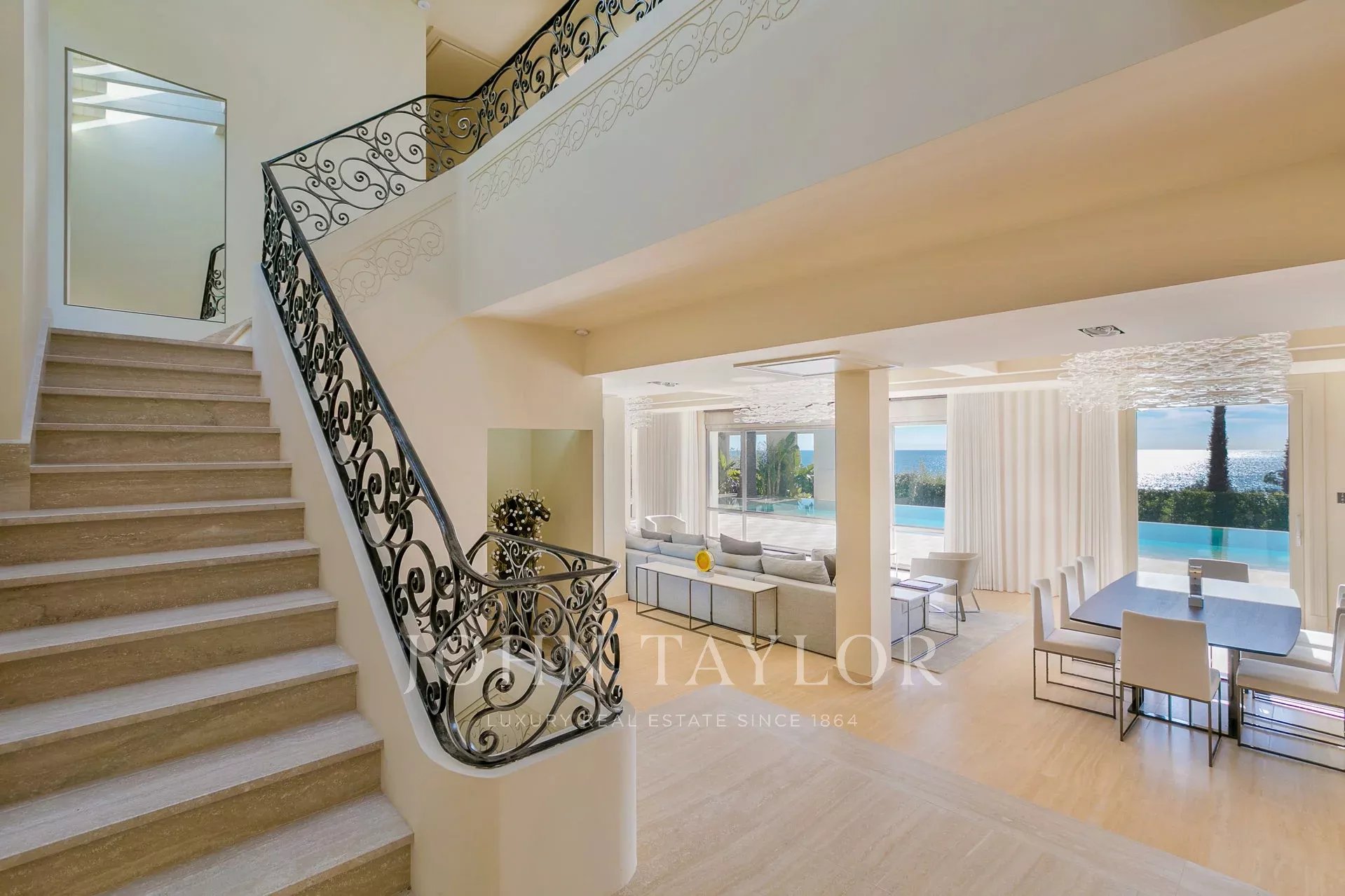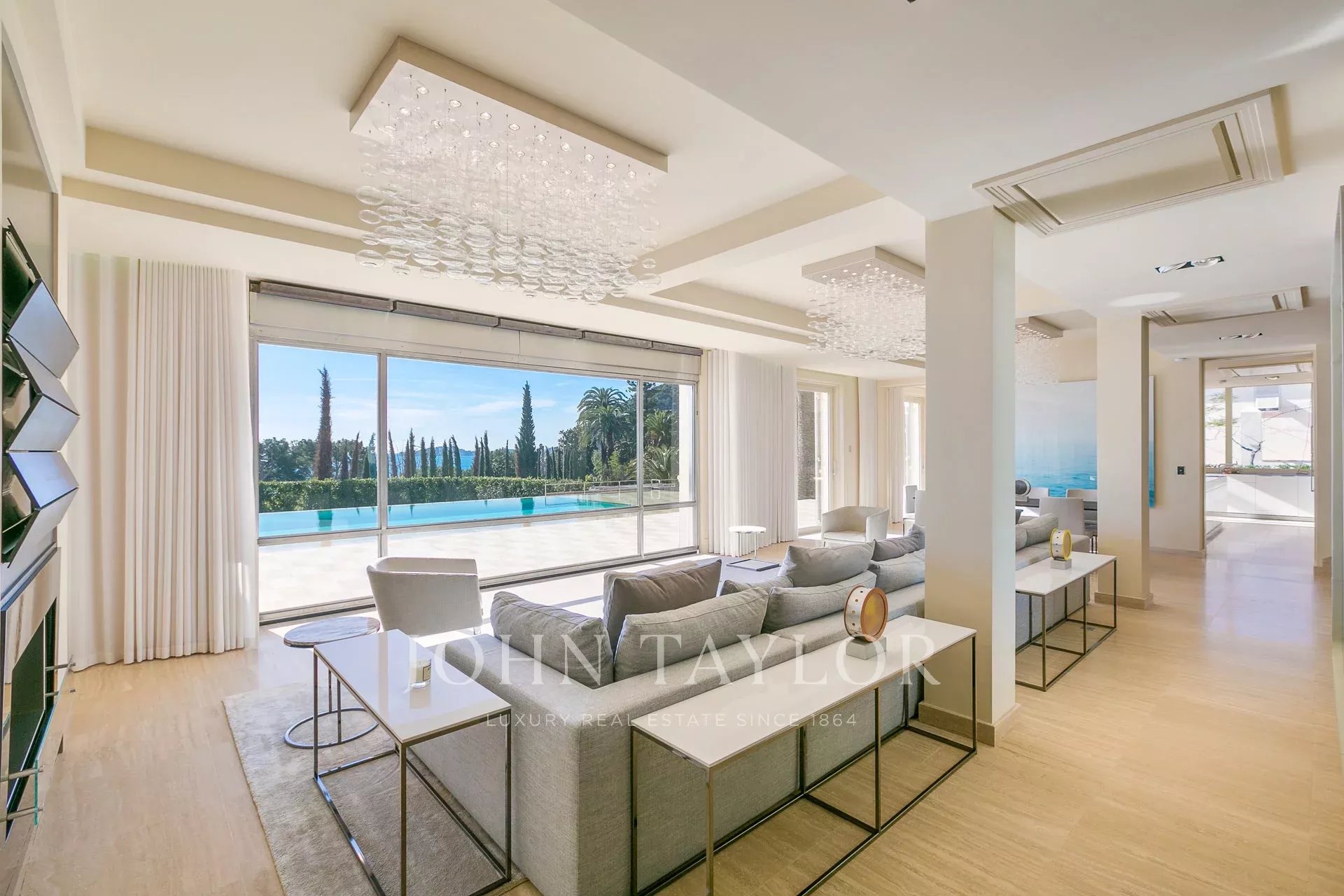 La villa principale, entièrement domotisée, offre un salon / salle à manger / cuisine entièrement équipée Gaggenau, 6 chambres avec salles de bains, salle de fitness, spa avec hammam et salle de massage, salle de cinéma, salle de jeux, cave à vin.