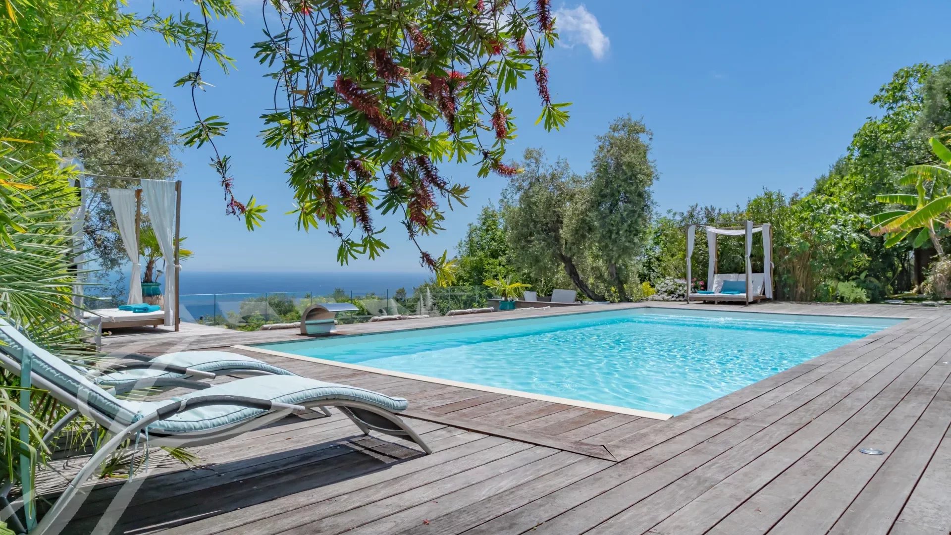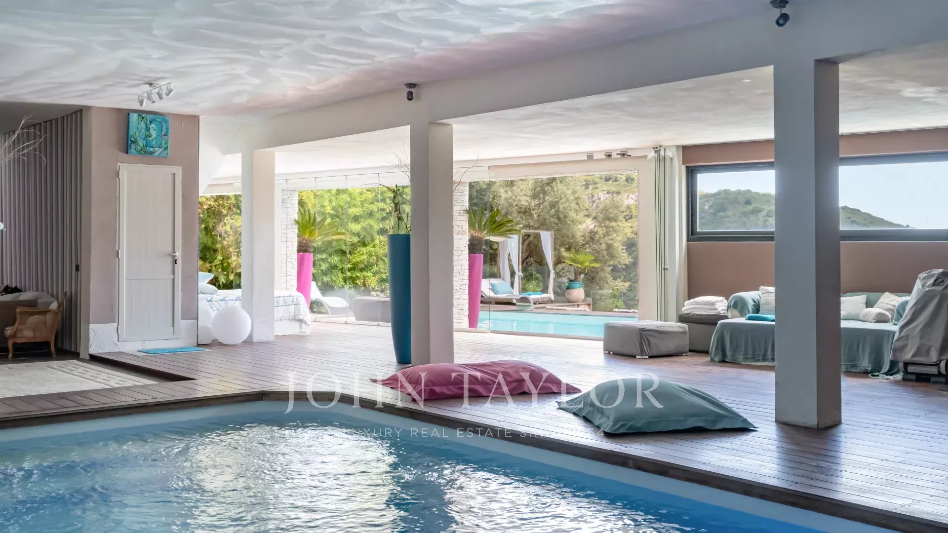 La villa vanta ampi volumi, un'abbondanza di luce e un piano interamente dedicato al benessere: piscina interna ed esterna collegate da grandi vetrate, jacuzzi, area relax, sala fitness aperta all'esterno e un hammam di 45 m² da trasformare in una spa mediterranea privata.