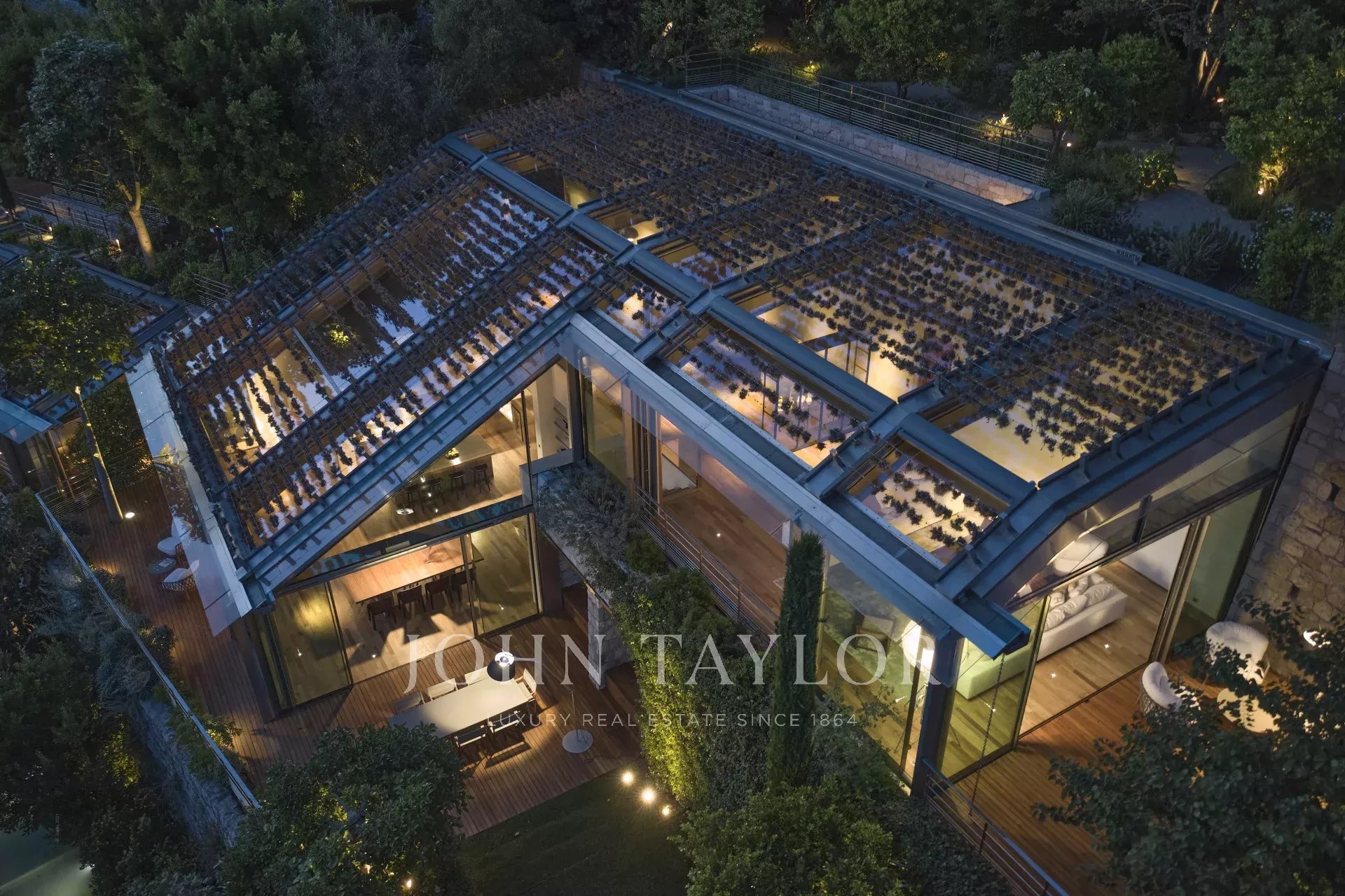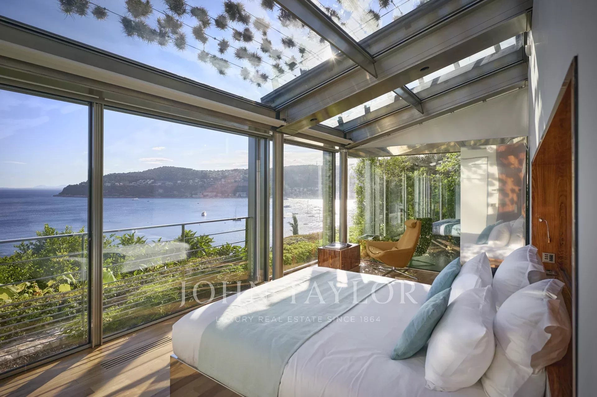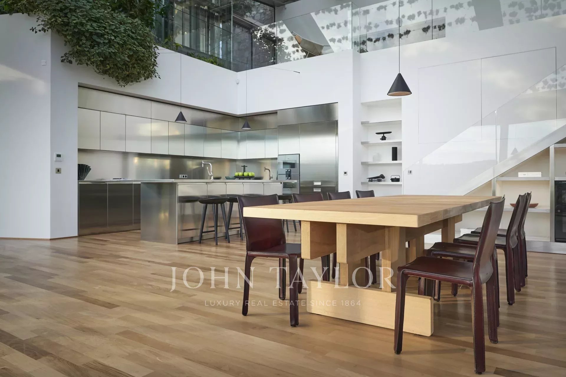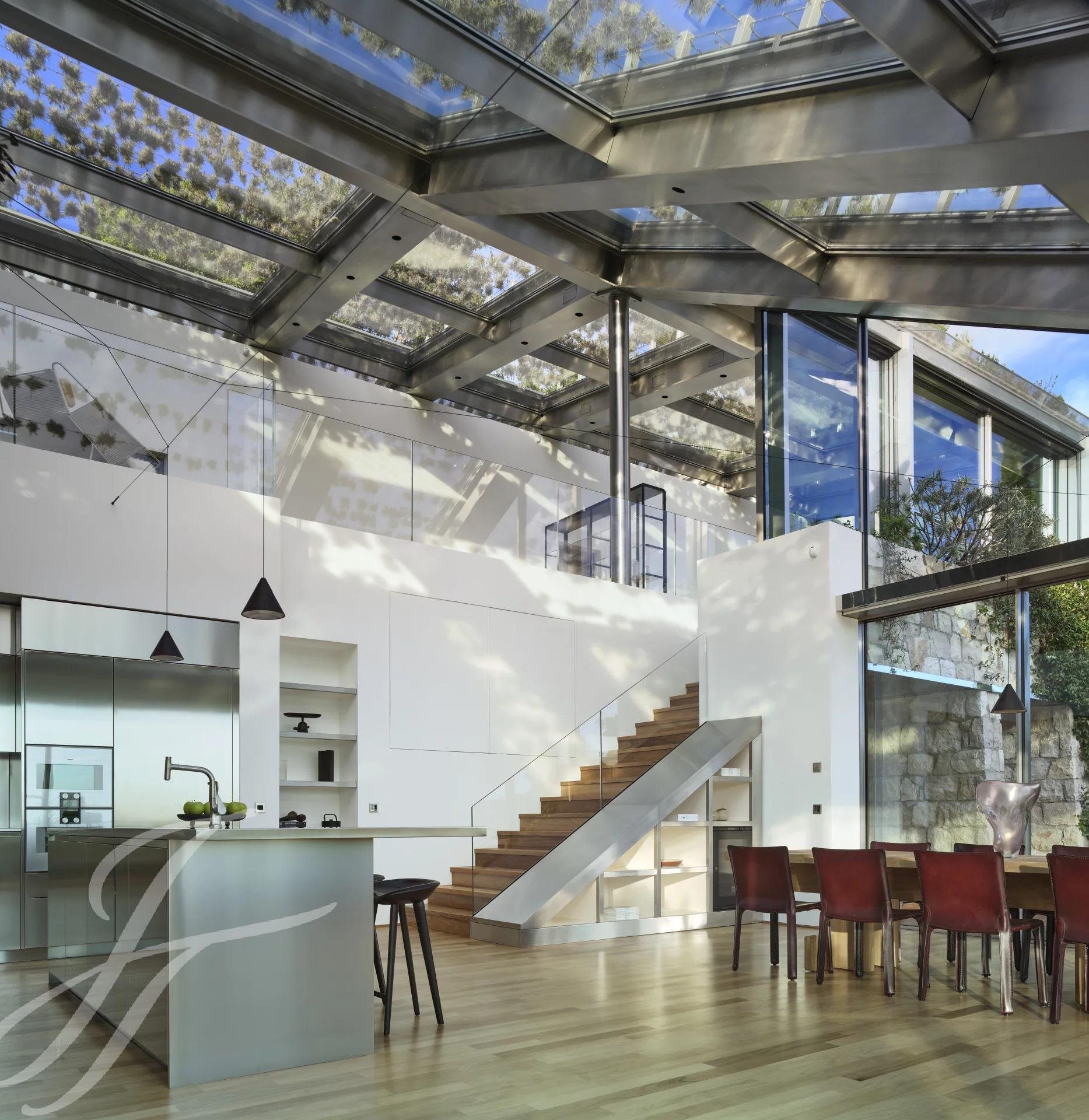 Il soggiorno, la sala da pranzo e la cucina, radicalmente contemporanei, vantano soffitti a doppia altezza. Soffitti di vetro! Naturalmente trattati in modo speciale e oscurabili con tende speciali.