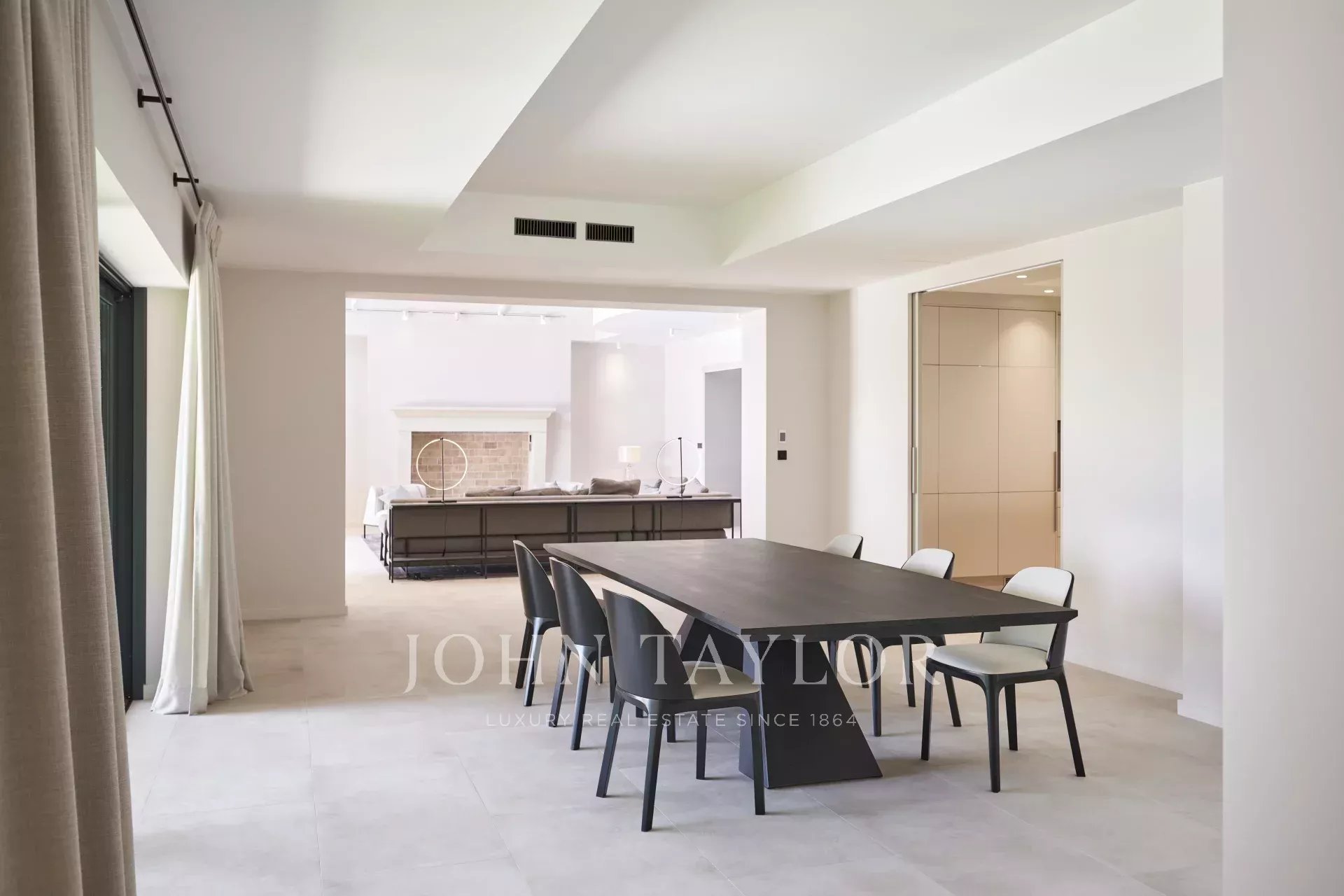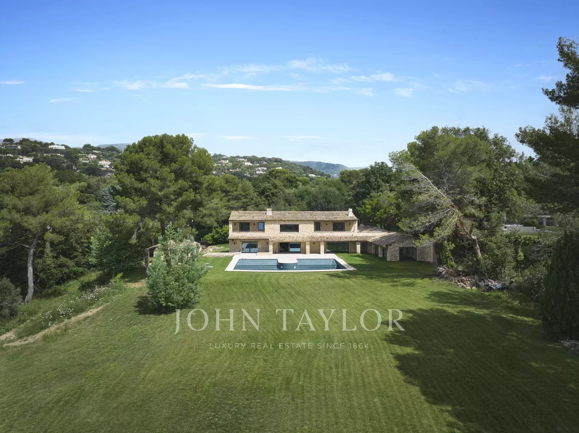 Questa lussuosa residenza in pietra incarna il perfetto connubio tra eleganza e fascino. Situata vicino al pittoresco villaggio di Saint-Paul de Vence, nel cuore di una discreta tenuta privata, si trova in posizione dominante e offre una vista maestosa fino al mare.