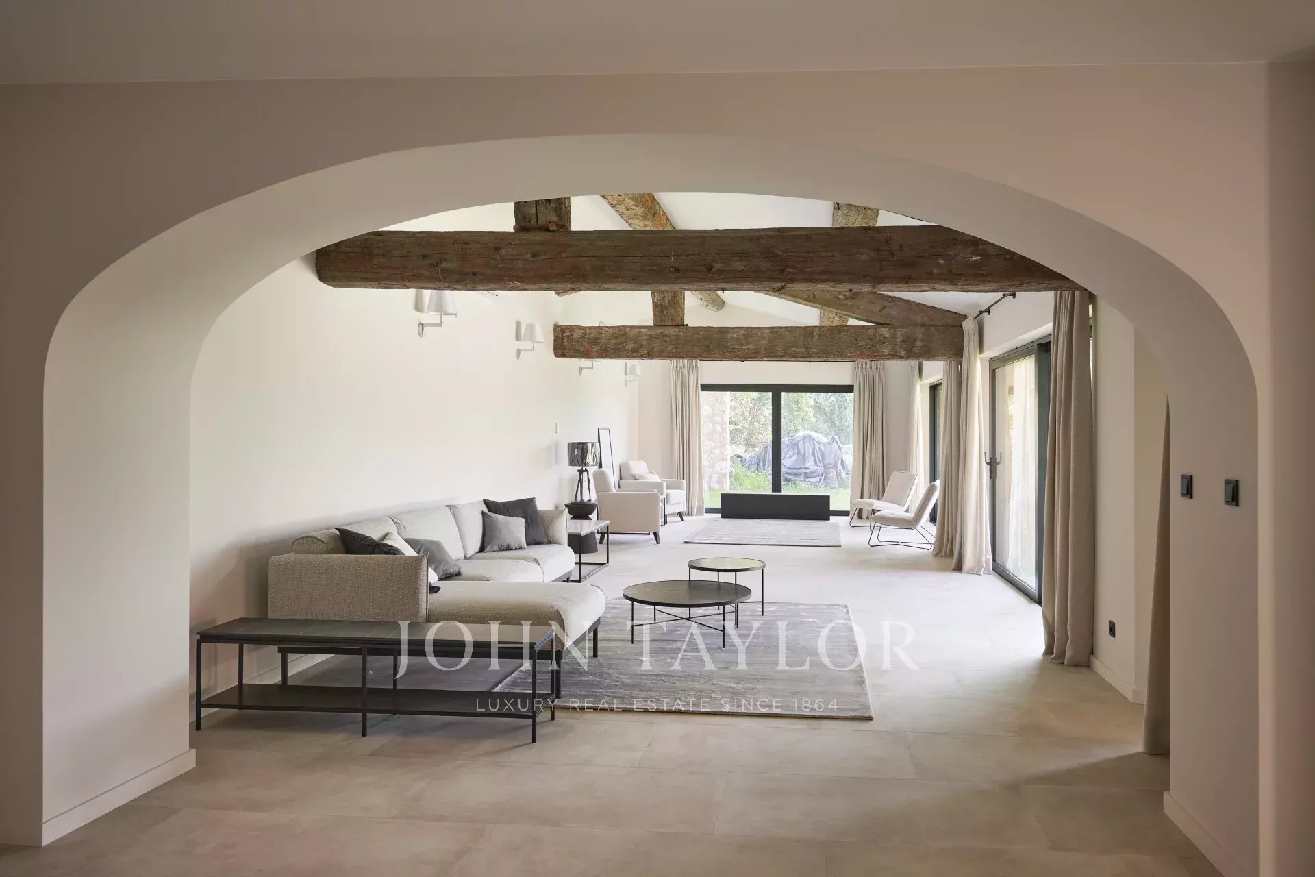 Con una superficie totale di circa 1.170 m2 , questa residenza si distingue per la sua vasta disposizione in tre parti. Il soggiorno principale, con il suo notevole camino e gli alti soffitti, si fonde armoniosamente con la sala da pranzo. Un secondo soggiorno d'angolo, inondato di luce grazie alle enormi finestre a golfo, si apre su un incantevole giardino. Questo sontuoso spazio abitativo è completato dalla cucina, un vero gioiello, lussuosamente attrezzata con un'isola centrale, e da un retro cucina con cella frigorifera. La villa vanta anche cinque suite, tra cui una spaziosa suite padronale al piano terra e una sesta suite indipendente per gli ospiti.