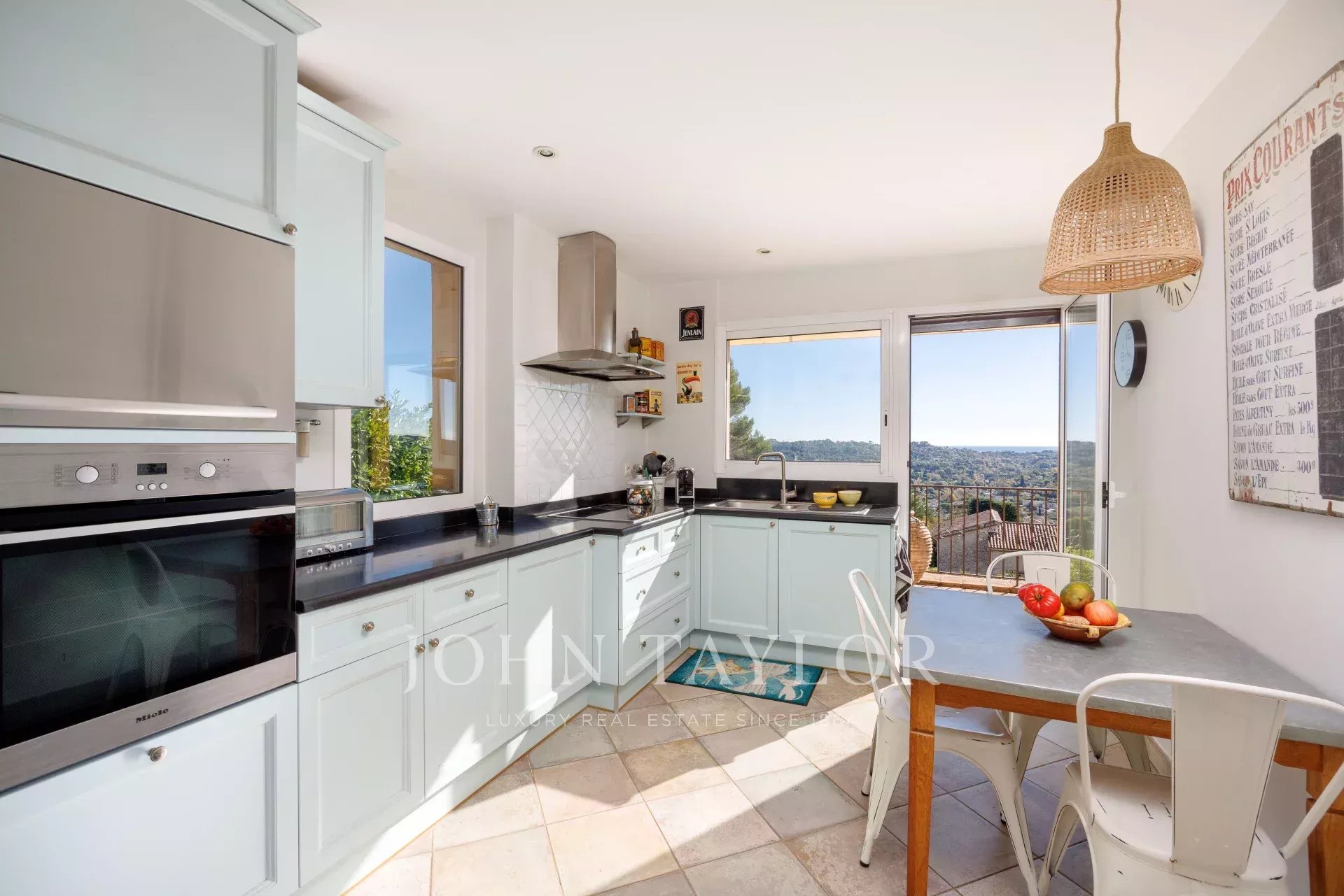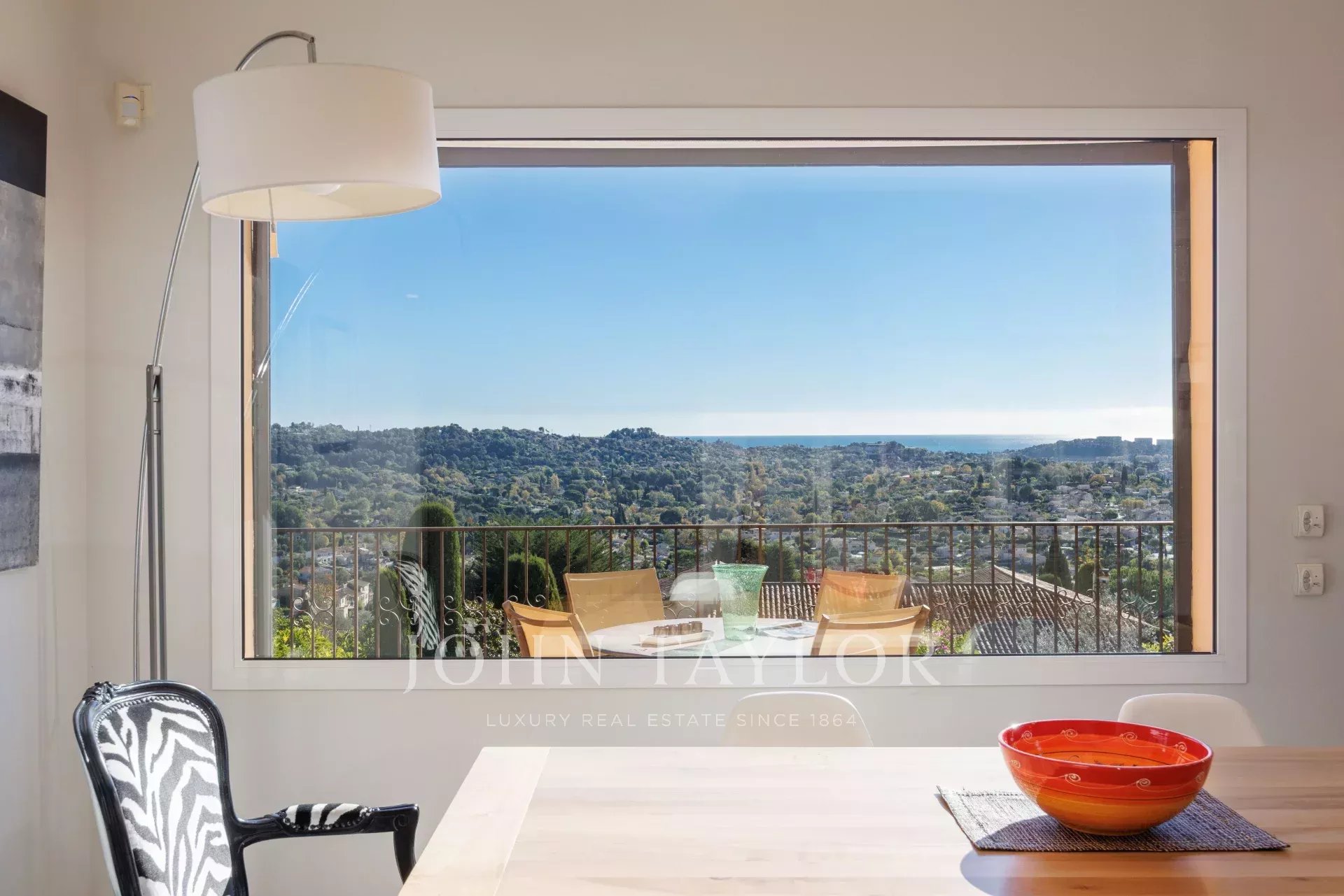 Appena si entra nella villa, i volumi generosi e le grandi finestre si aprono su un panorama mozzafiato: la valle, il villaggio di Saint-Paul e il mare sullo sfondo.