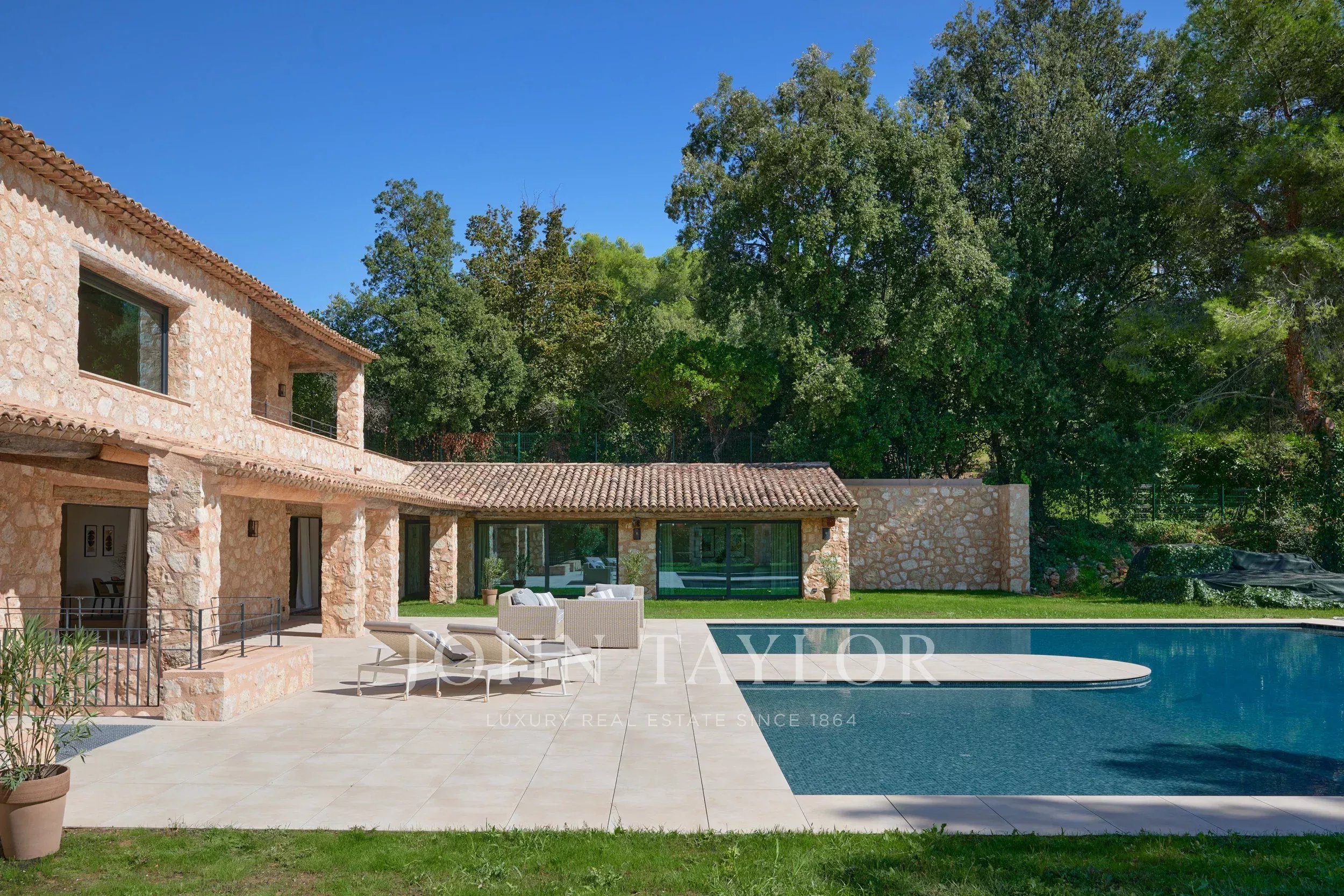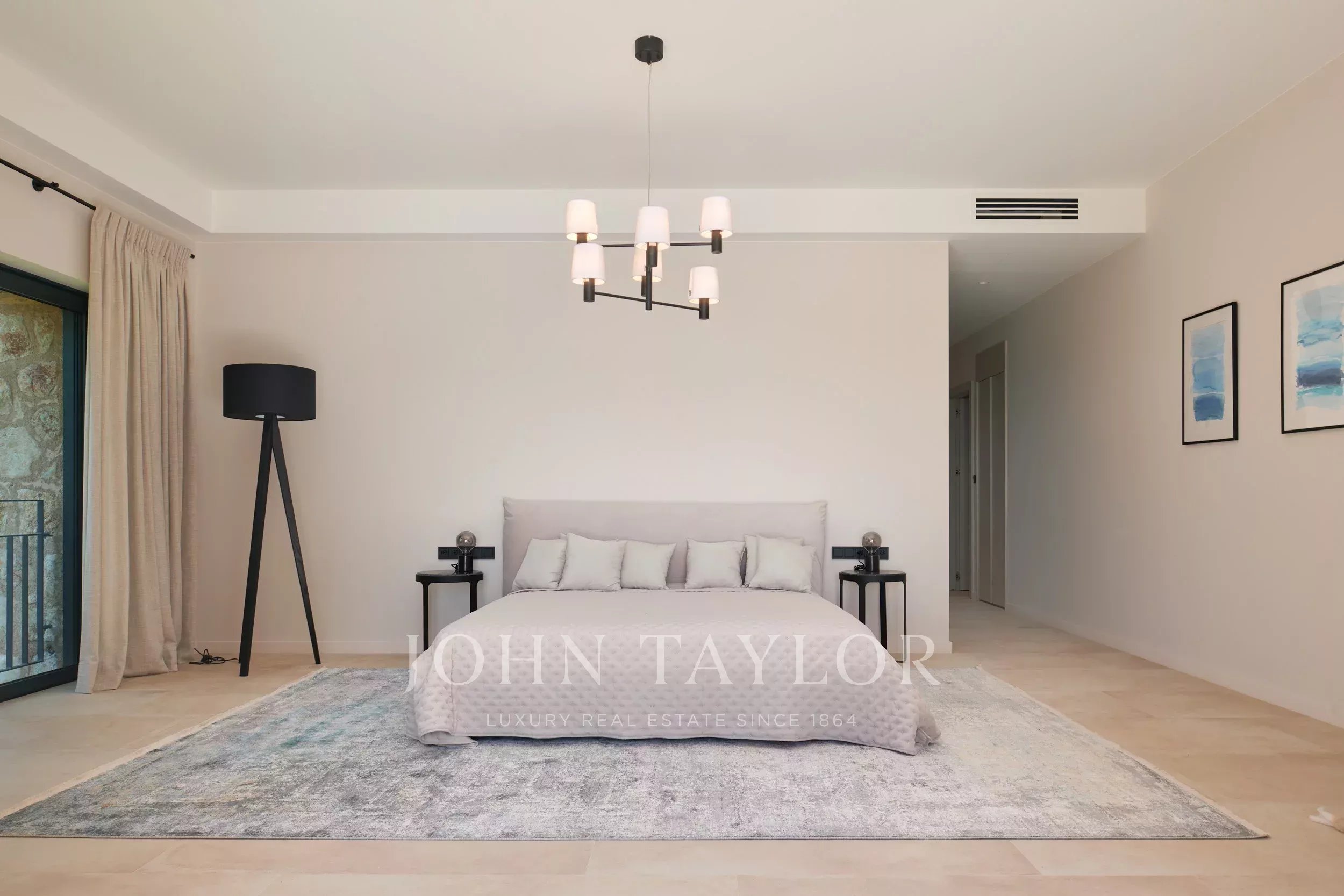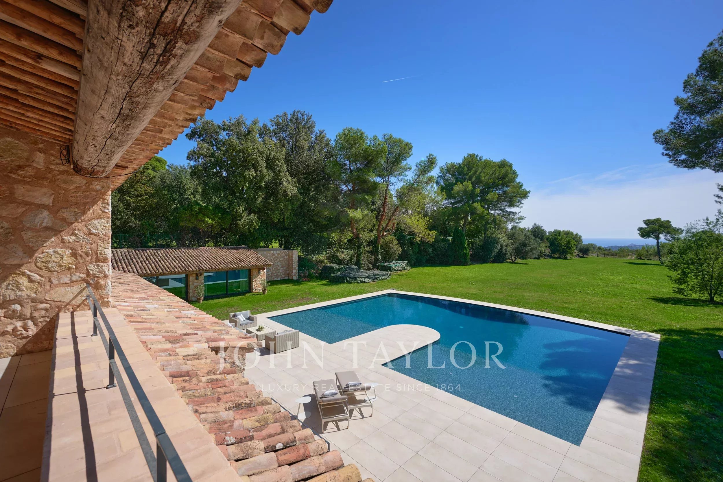 Questa lussuosa residenza in pietra incarna il perfetto connubio tra eleganza e fascino. Situata vicino al pittoresco villaggio di Saint-Paul de Vence, nel cuore di una discreta tenuta privata, si trova in posizione dominante e offre una vista maestosa fino al mare.