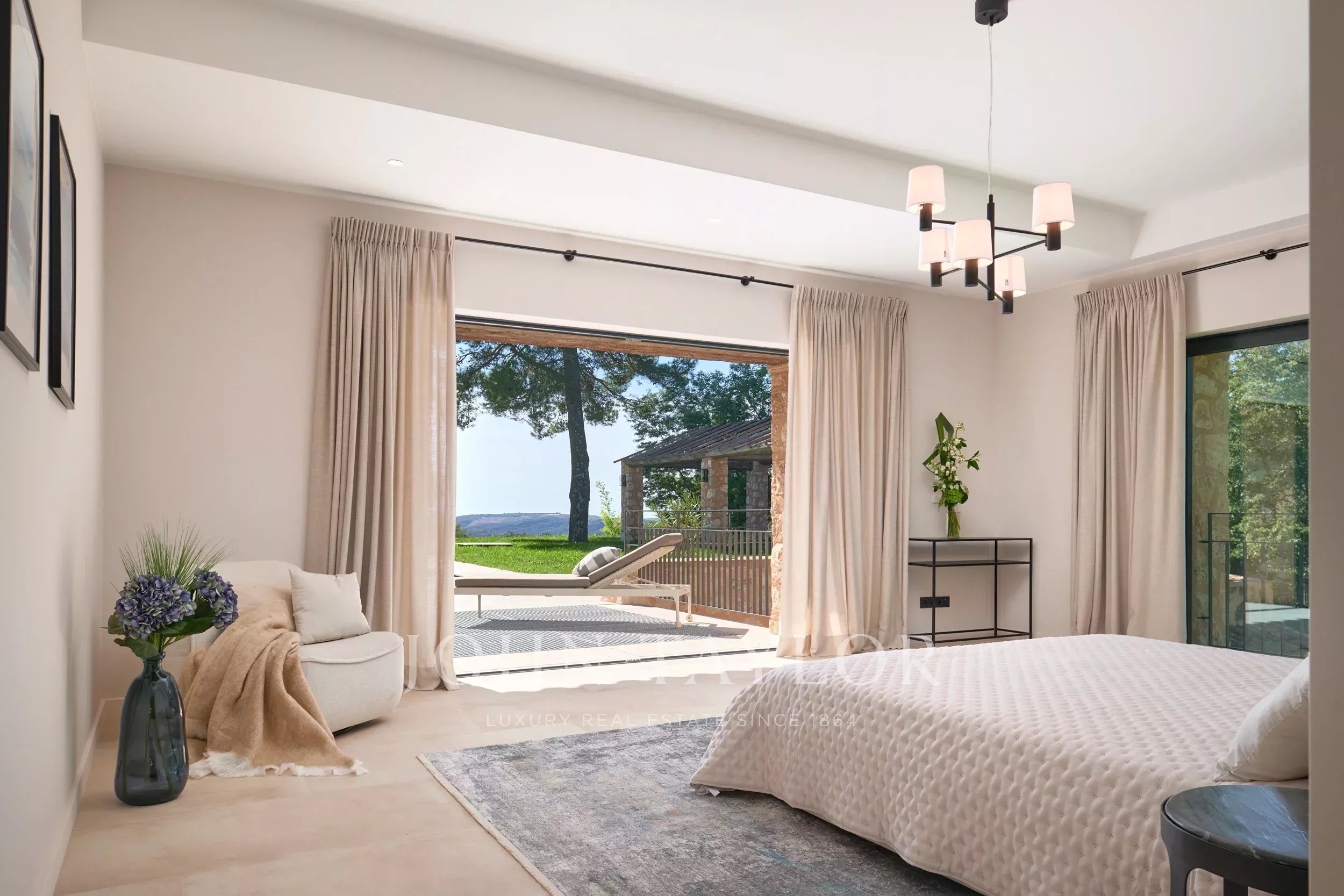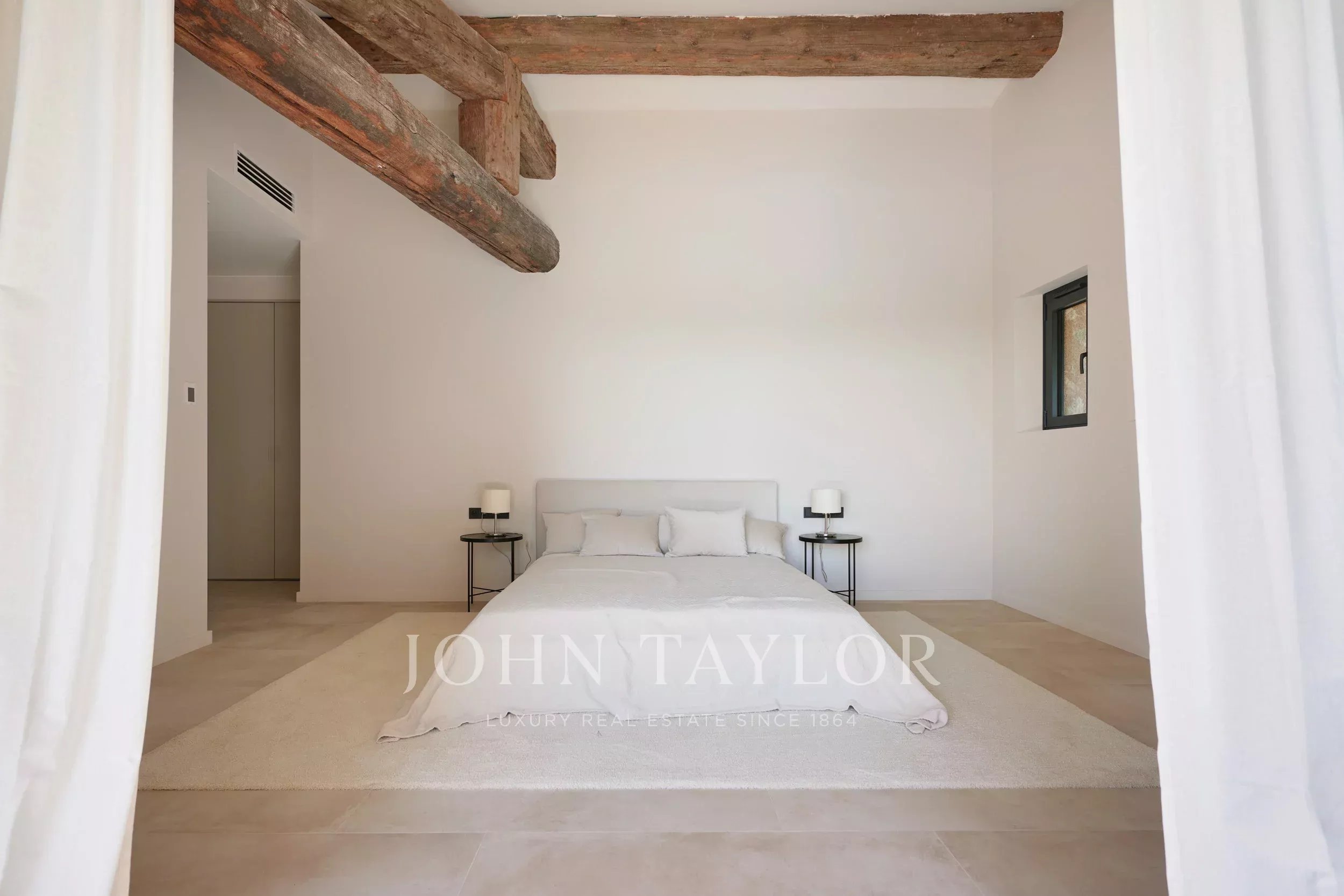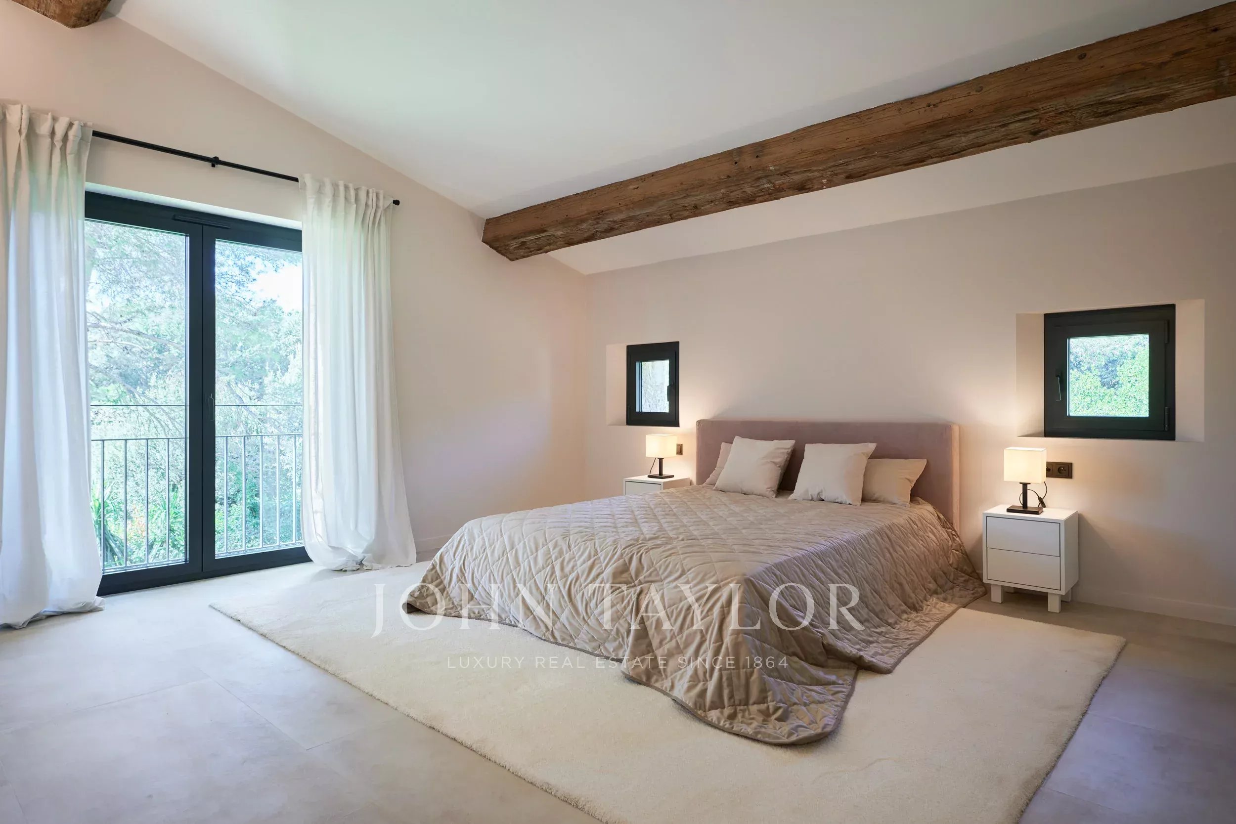 Questa lussuosa residenza in pietra incarna il perfetto connubio tra eleganza e fascino. Situata vicino al pittoresco villaggio di Saint-Paul de Vence, nel cuore di una discreta tenuta privata, si trova in posizione dominante e offre una vista maestosa fino al mare.