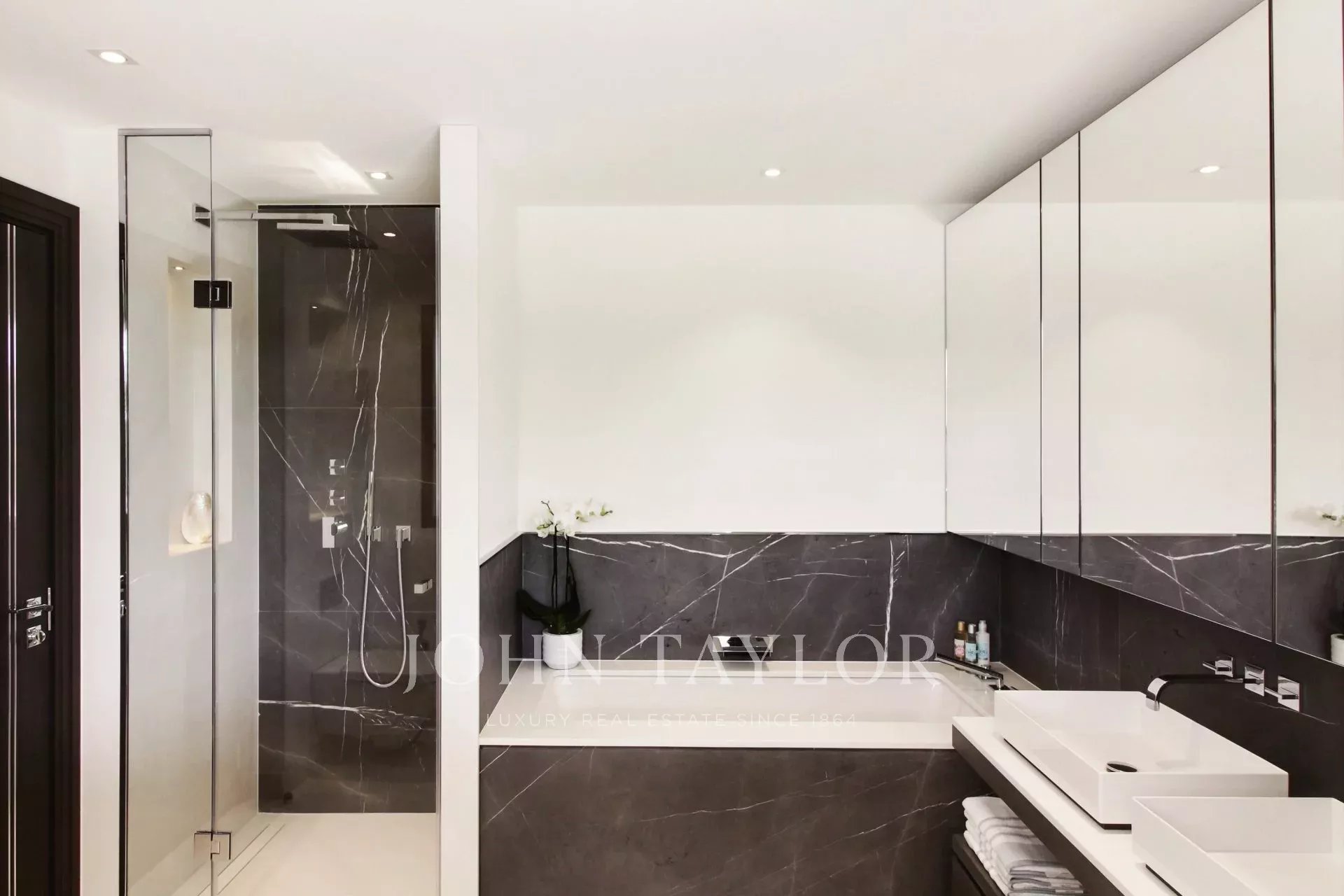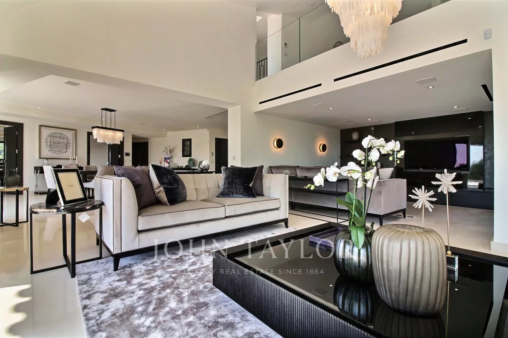 un ingresso, un doppio salone-soggiorno con angoloTV, una sala da pranzo, una cucina di alta gamma con un'isola centrale e accesso a una terrazza coperta esposta a sud, una spaziosa suite di maestri con il suo ampio guardaroba e uno studio annesso, 4 camere da letto en suite, una sala fitness, una cantina vini.