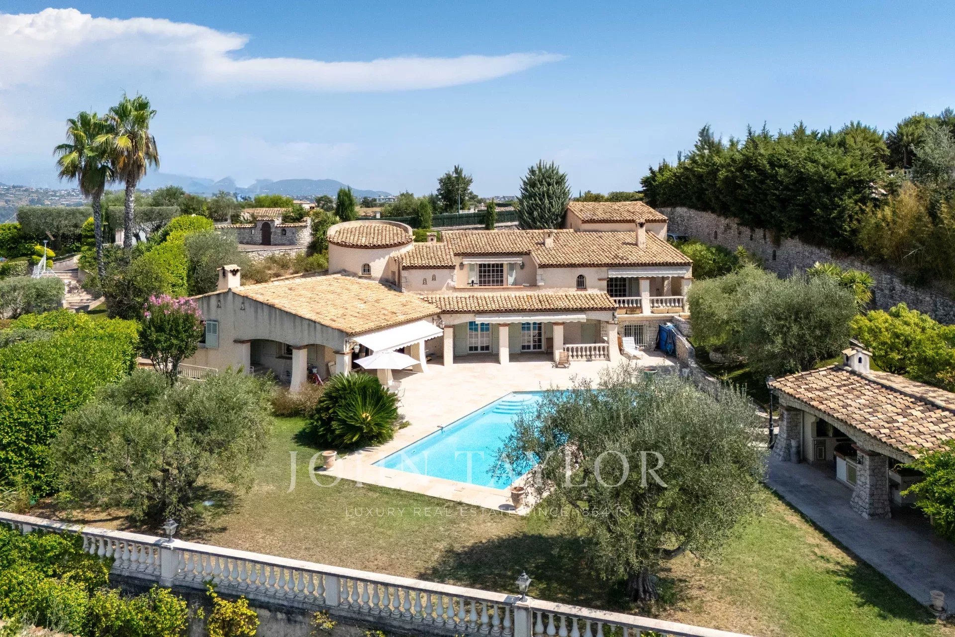 All'esterno, il giardino mediterraneo con una dozzina di ulivi invita al relax. La piscina di acqua salata con regolatore di pH e la pool house completamente attrezzata promettono splendide giornate estive. La proprietà vanta anche un garage doppio, diversi posti auto, cancello elettrico, area per le bocce, cantina, officina, casetta da giardino e sistema di irrigazione automatica. La proprietà è vicina a tutti i servizi e a soli 15 minuti dall'aeroporto internazionale di Nizza.