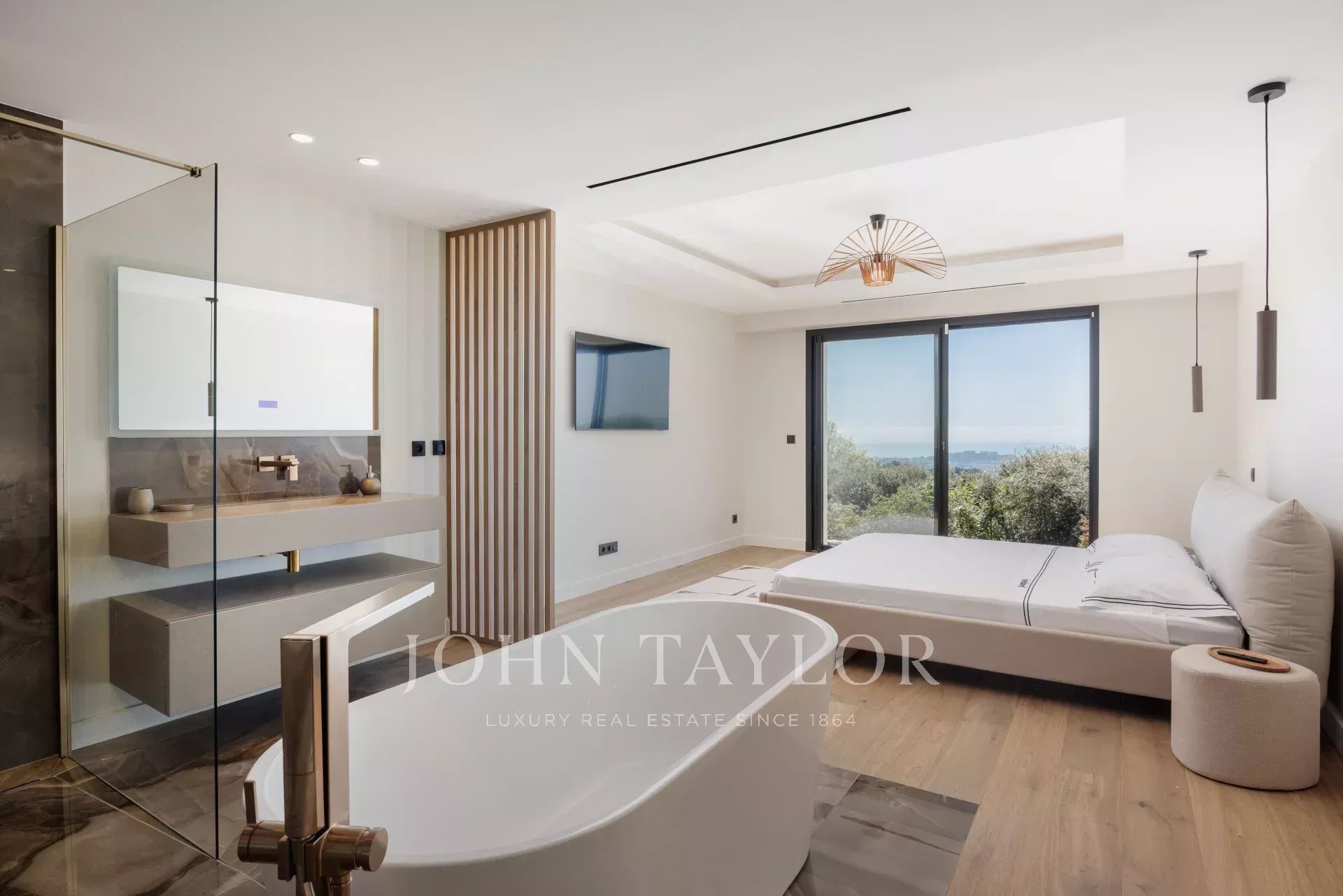 Al piano superiore si trovano altre quattro suite, tra cui una seconda suite padronale. Tutte le camere da letto hanno vista sul mare, terrazze, cabine armadio e bagni con doccia privati, garantendo comfort e privacy per tutti.