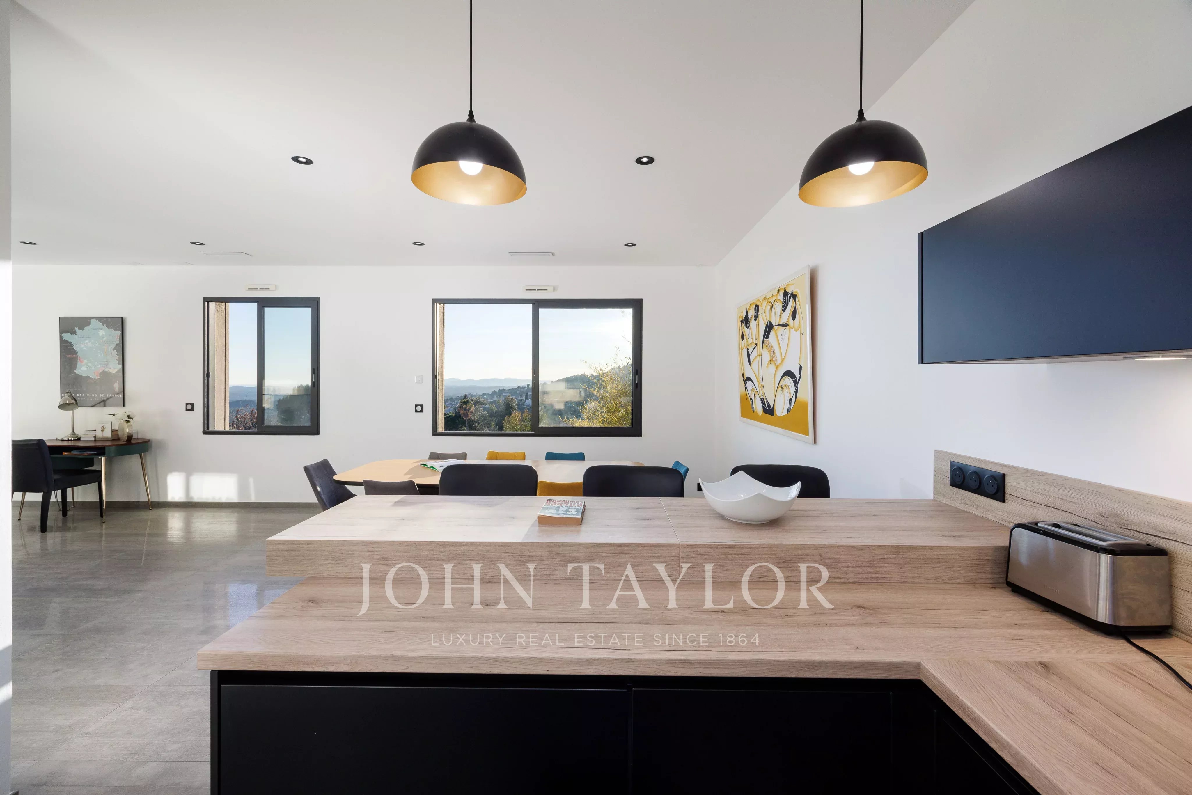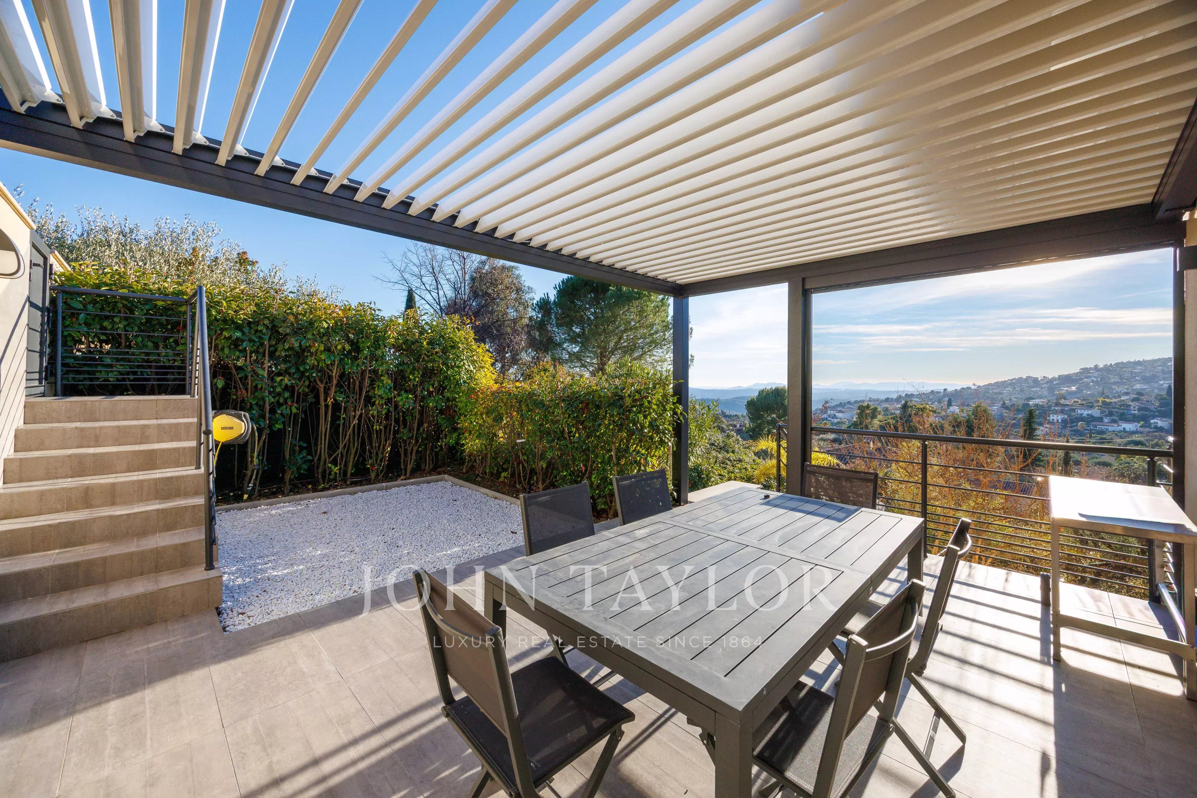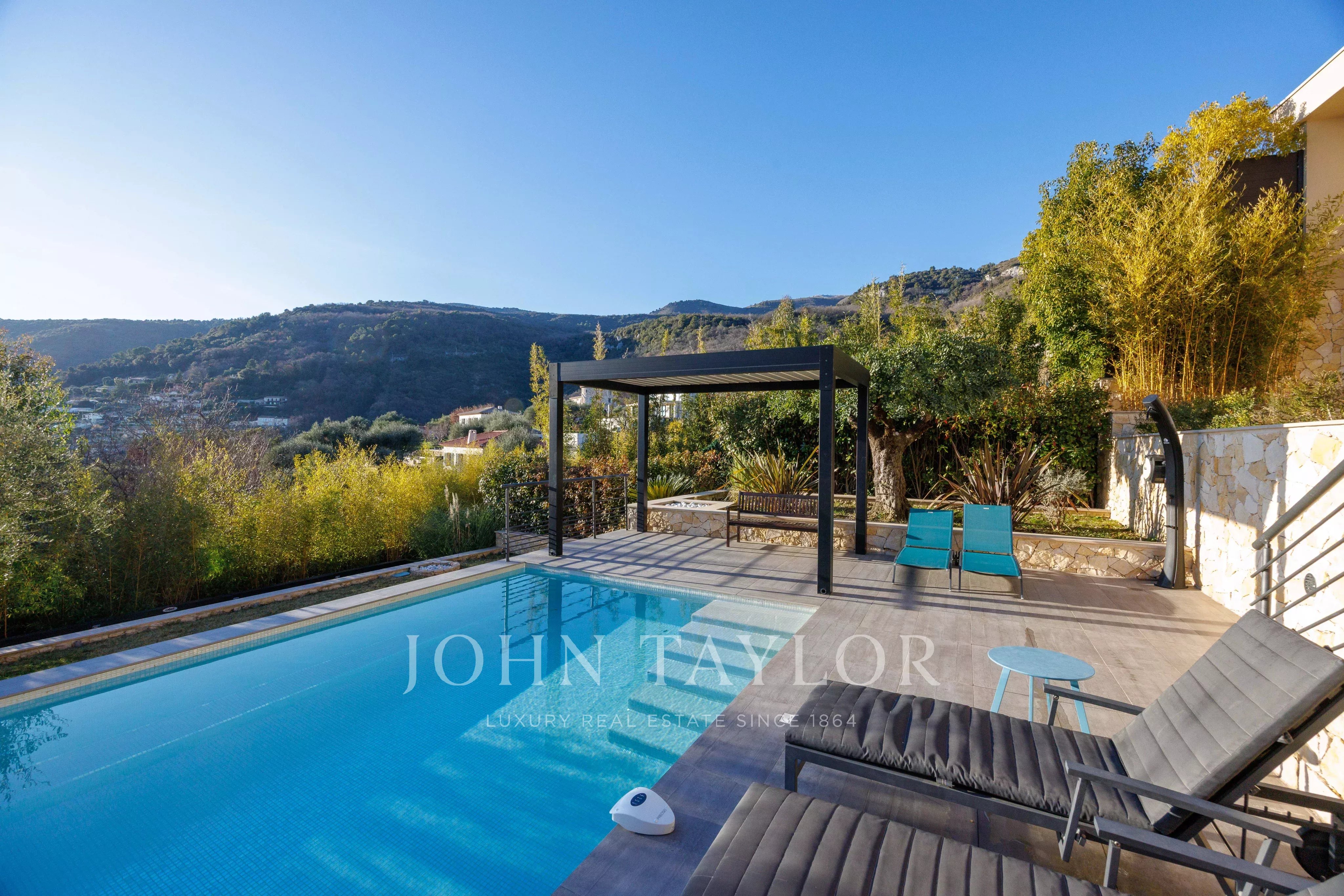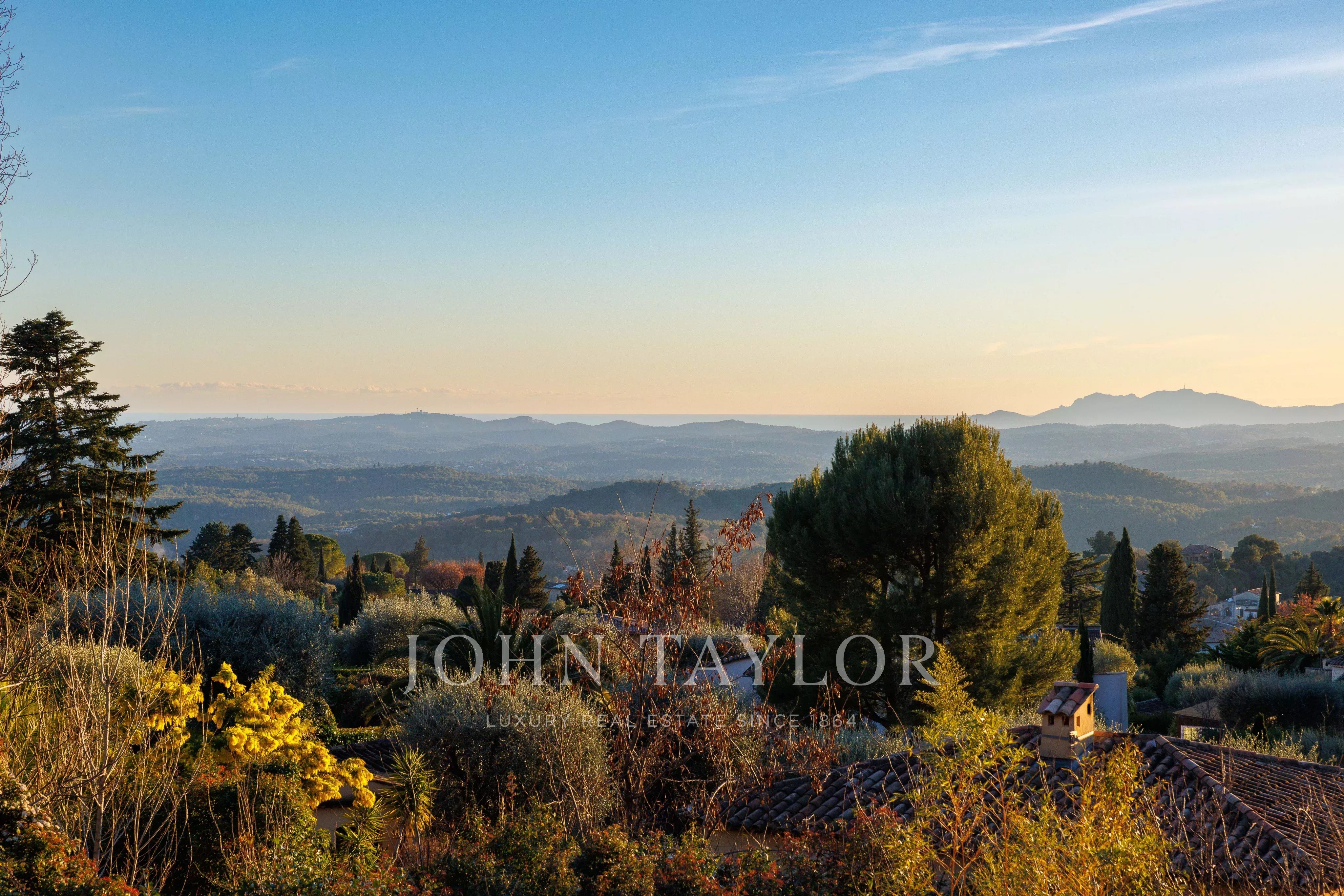 Villa panoramica a piedi dal villaggio di Tourrettes sur Loup, vista panoramica sul villaggio, sulle montagne e sul mare, 4 camere da letto di cui una suite padronale, ampio e luminoso soggiorno, il tutto immerso in un terreno di 859 m2 con piscina riscaldata.
