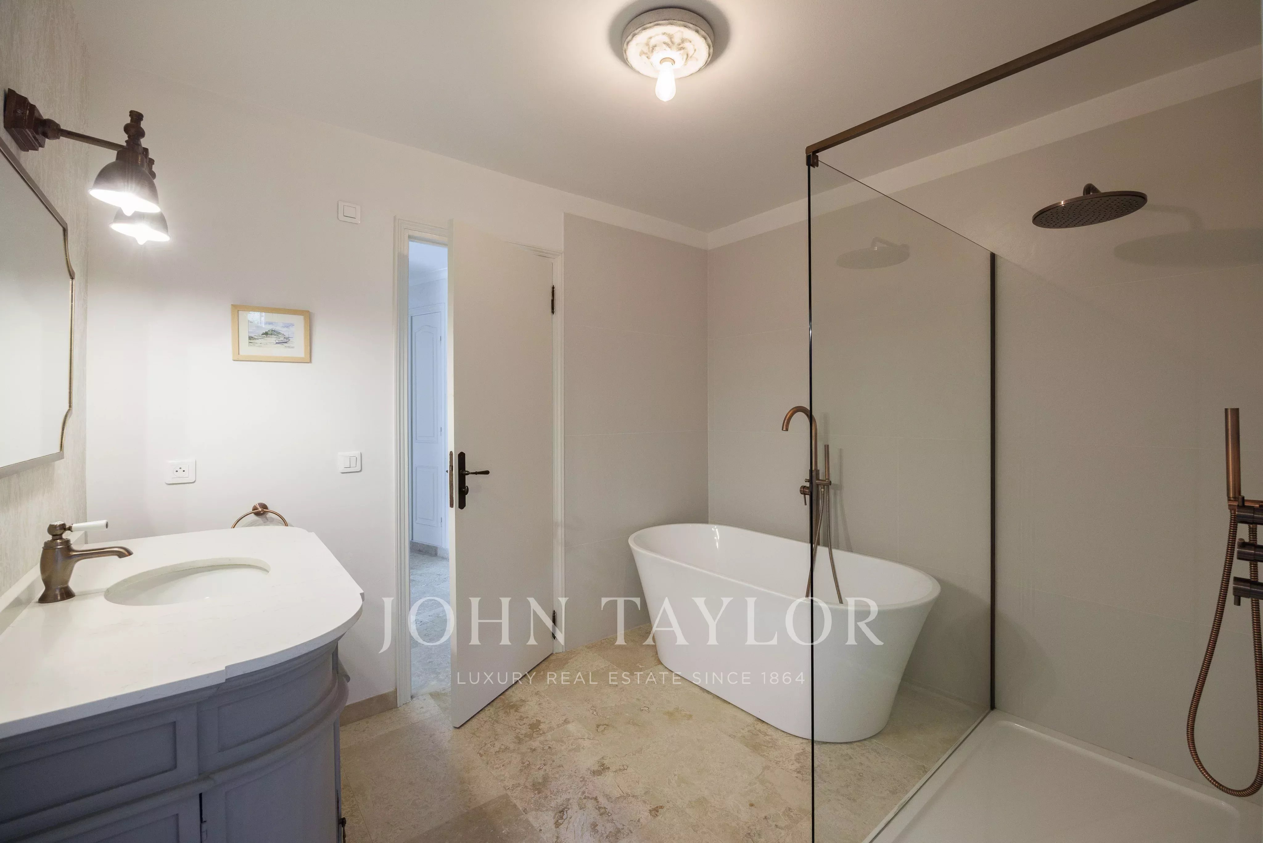 Il piano terra (circa 120 m²) comprende cucina, soggiorno, tre camere da letto, tre bagni e un'ampia terrazza privata di 130 m² con vista ininterrotta fino a Cap d'Antibes.