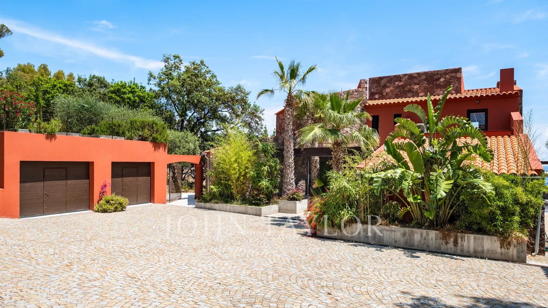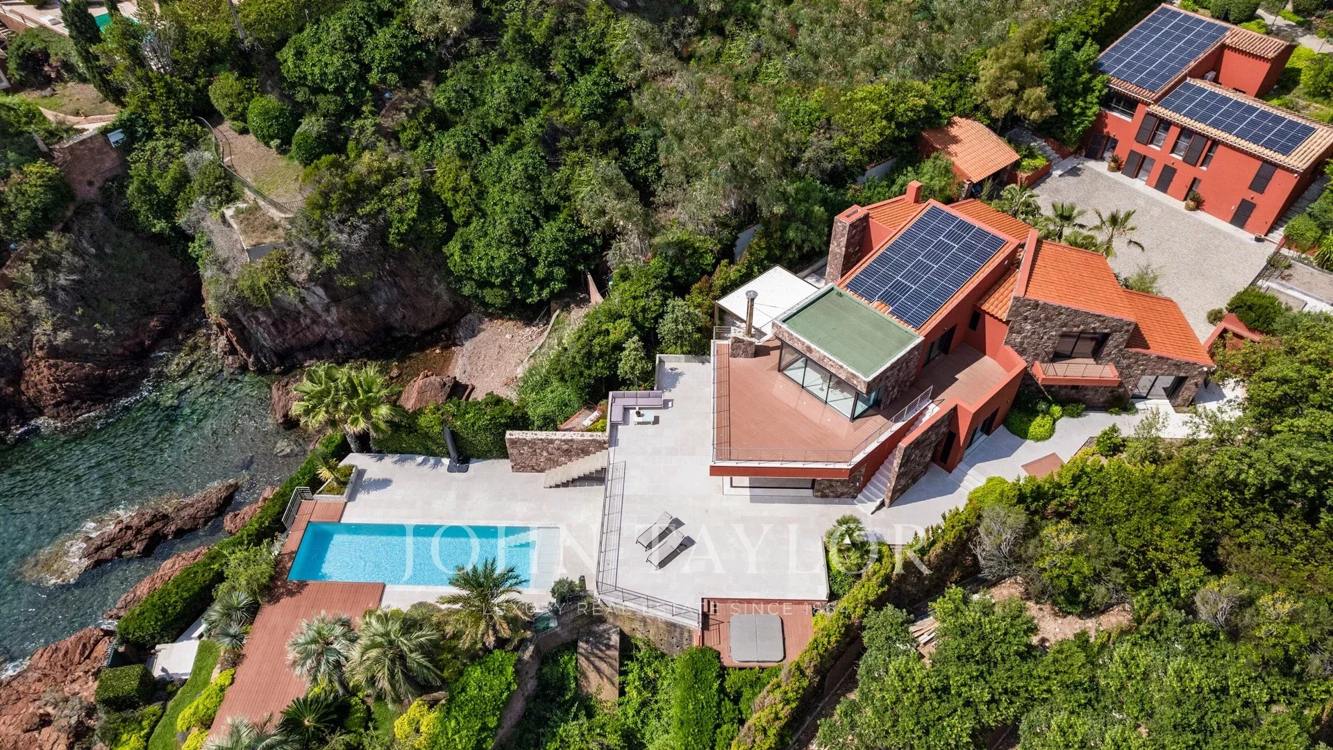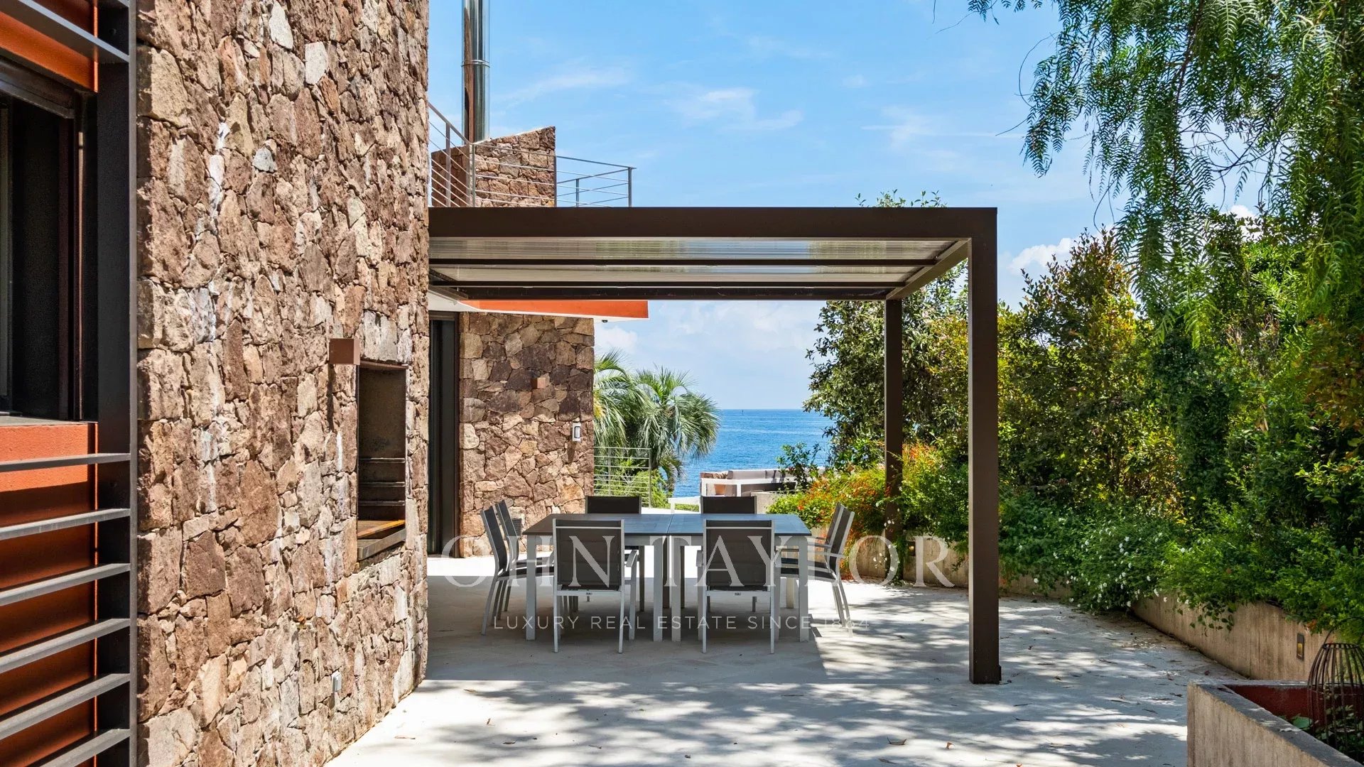Nel cuore di un terreno di 2827 m², sublime proprietà contemporanea fronte mare di 420 m² composta da una villa principale e una guest house, che offre viste spettacolari e accesso privato al mare.