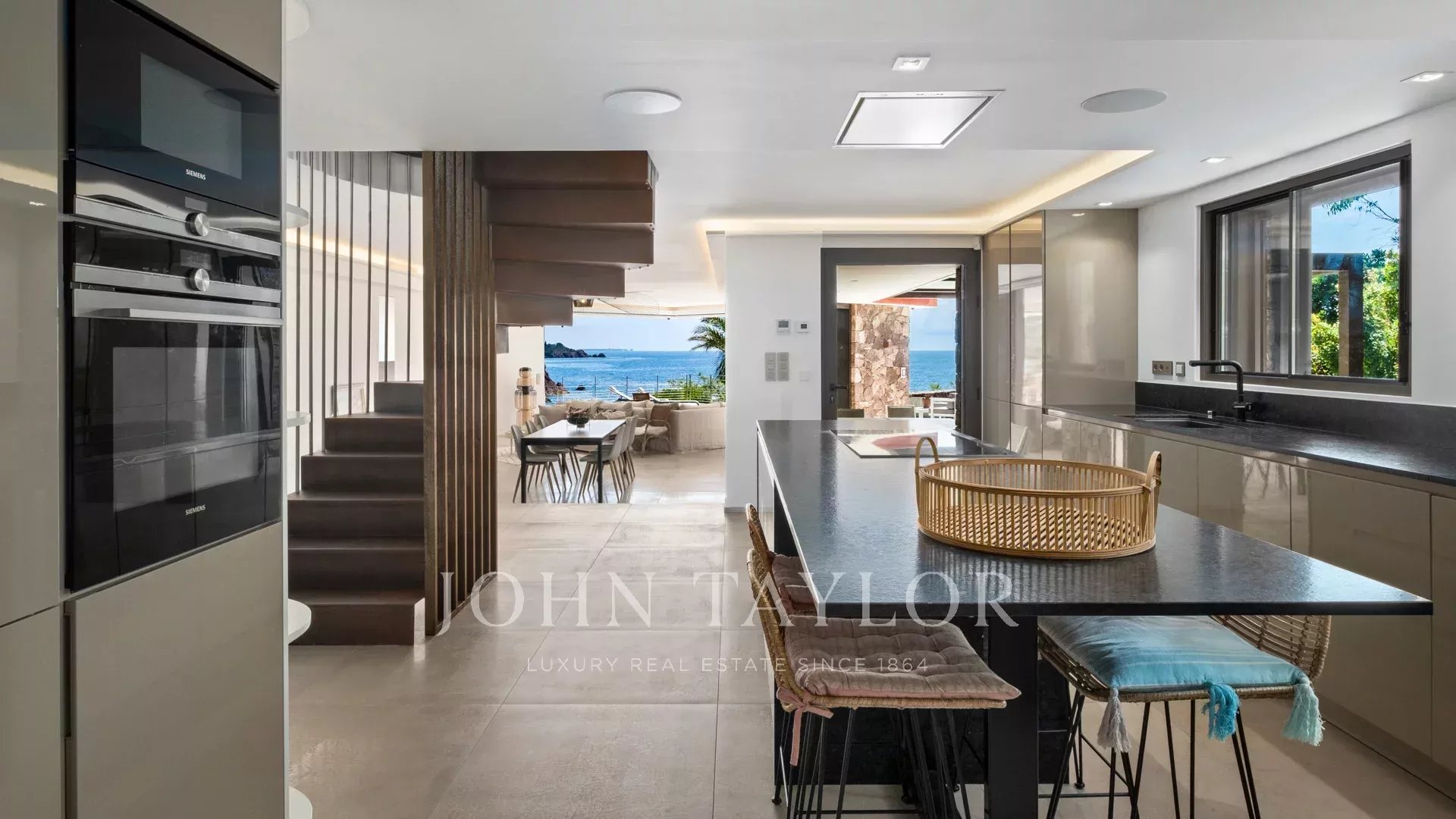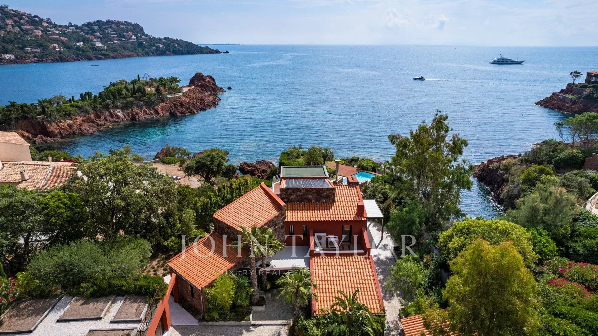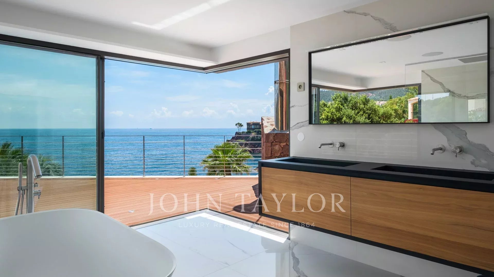 Nel cuore di un terreno di 2827 m², sublime proprietà contemporanea fronte mare di 420 m² composta da una villa principale e una guest house, che offre viste spettacolari e accesso privato al mare.
