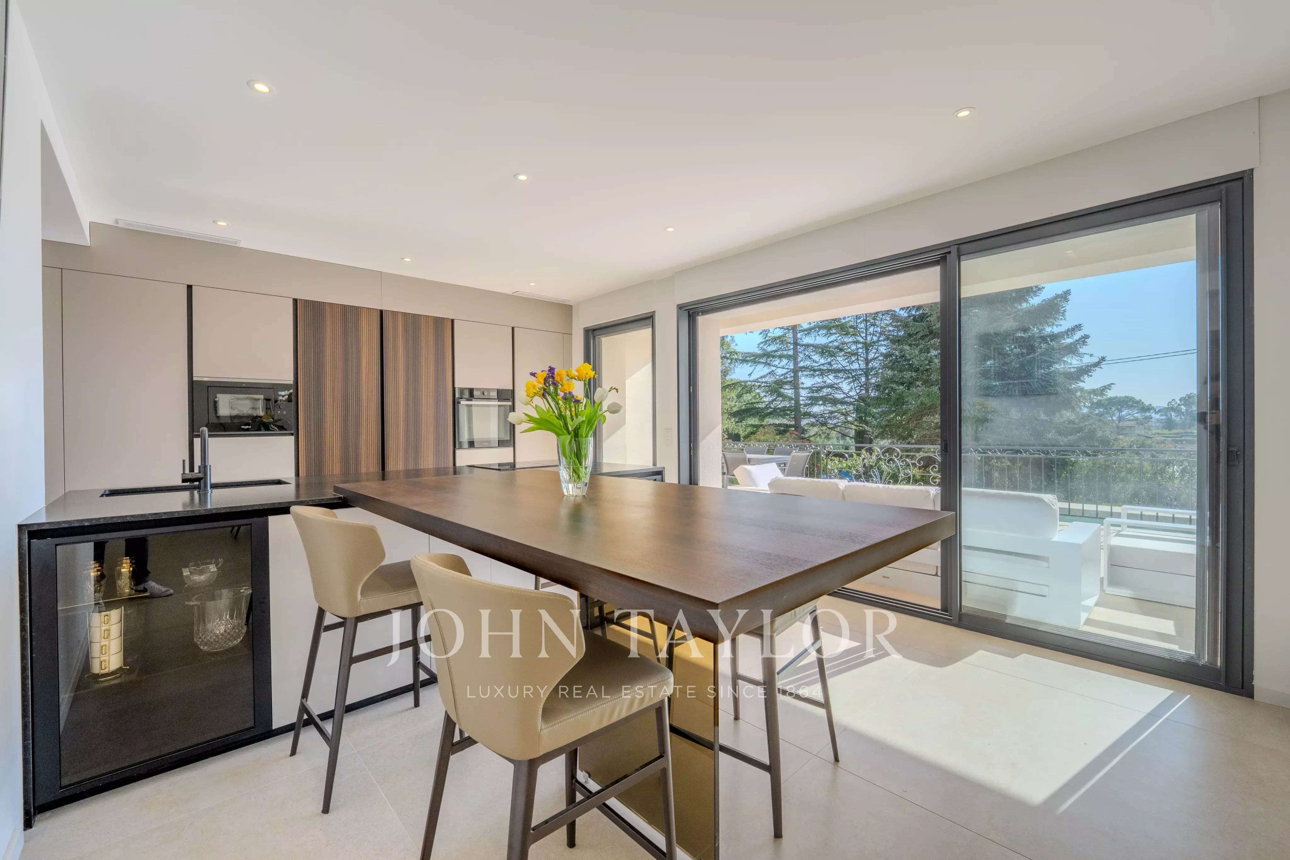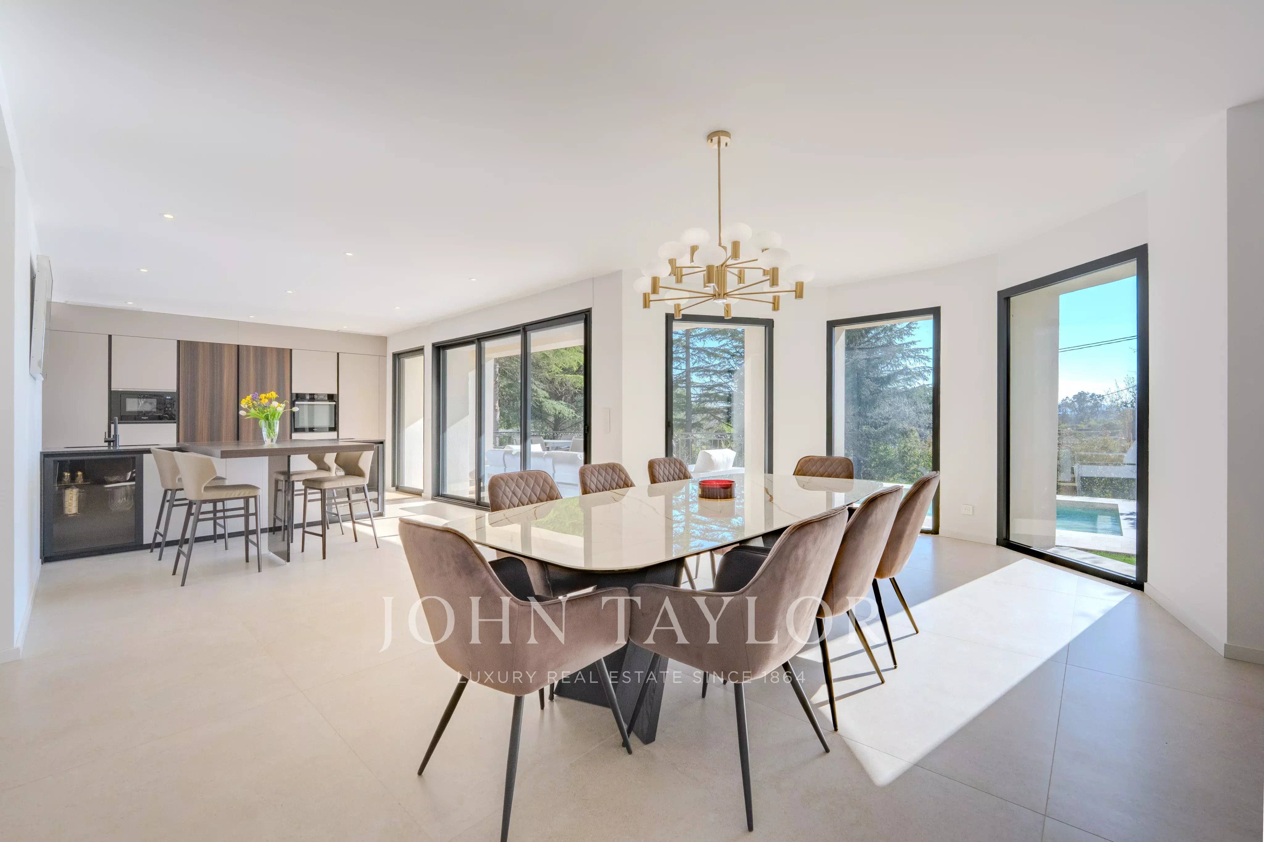 Sviluppando circa 320 m² (' 260 m2 + 60 m2 di seminterrato attrezzato) abitabili, la villa è stata sottoposta a una completa ristrutturazione con finiture particolarmente curate. Gli spazi di ricevimento, inondati di luce, si aprono su un ampio soggiorno con cucina contemporanea completamente attrezzata, in un naturale collegamento alle terrazze e al giardino paesaggistico.