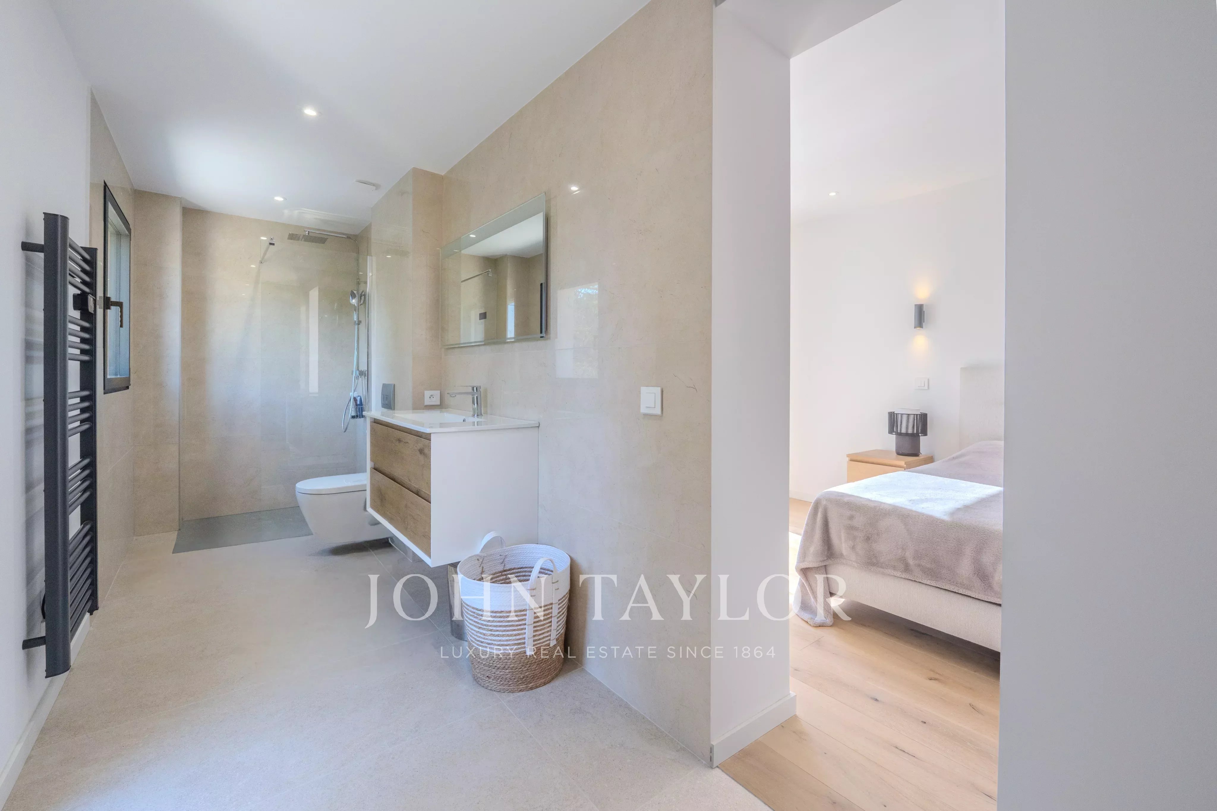 La proprietà offre una notevole suite padronale di circa 60 m², vero spazio privato con volumi generosi, e quattro camere da letto con bagno al primo piano, garantendo il massimo comfort per accogliere famiglia e ospiti. Una lavanderia completa questa composizione con discrezione e funzionalità.