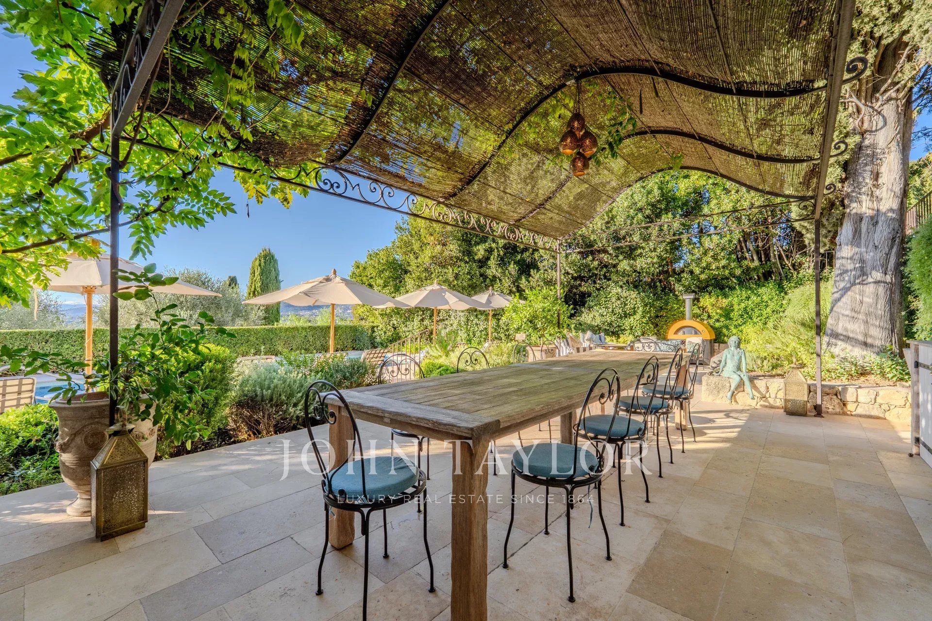 Il giardino terrazzato di 4.530 m², ornato da magnifici ulivi secolari e da una fontana in pietra, si sviluppa intorno a una grande piscina, perfettamente integrata nel contesto naturale.
