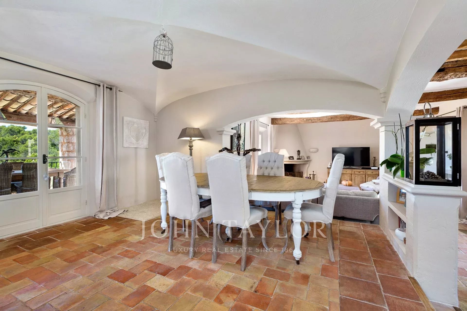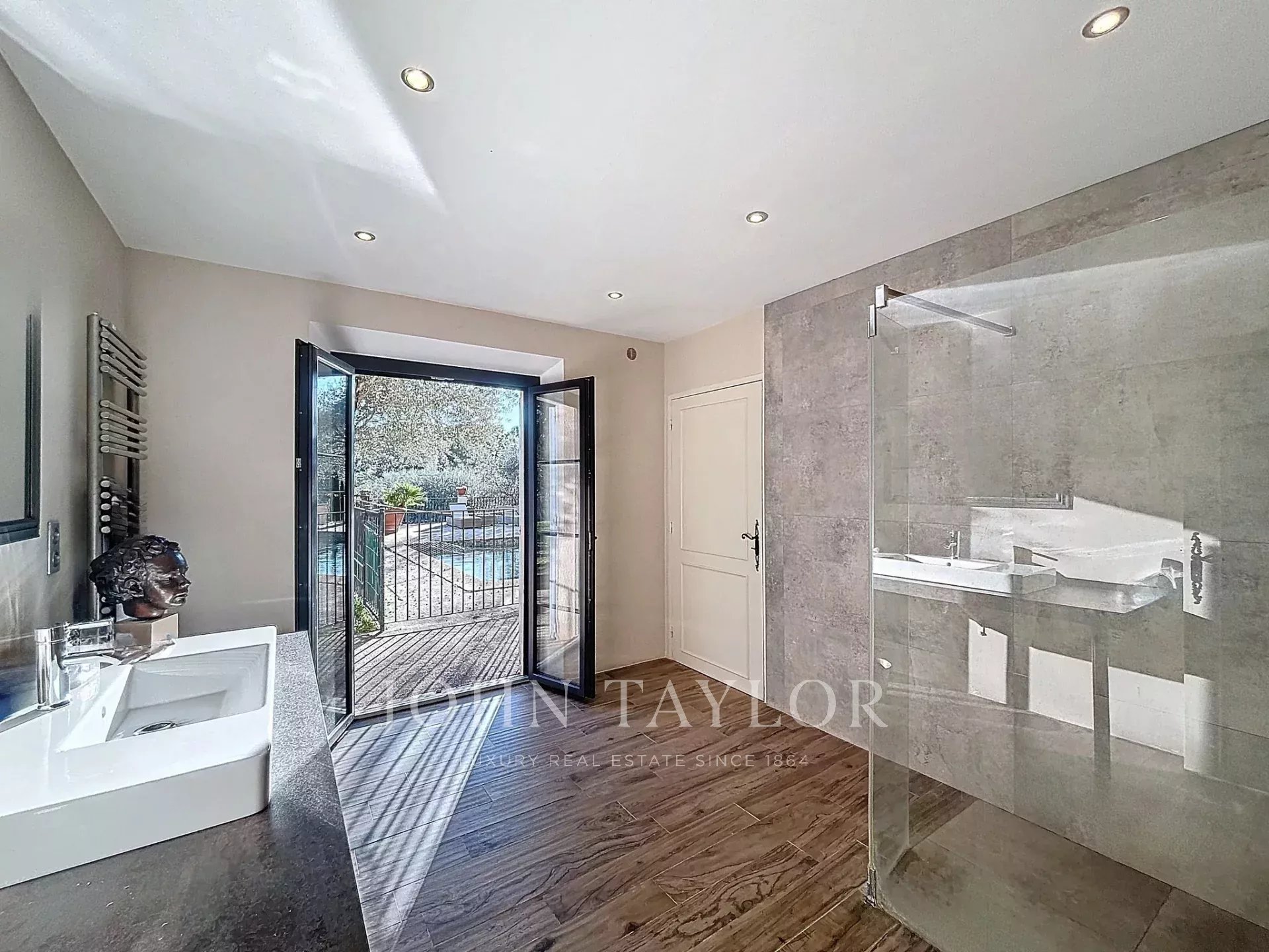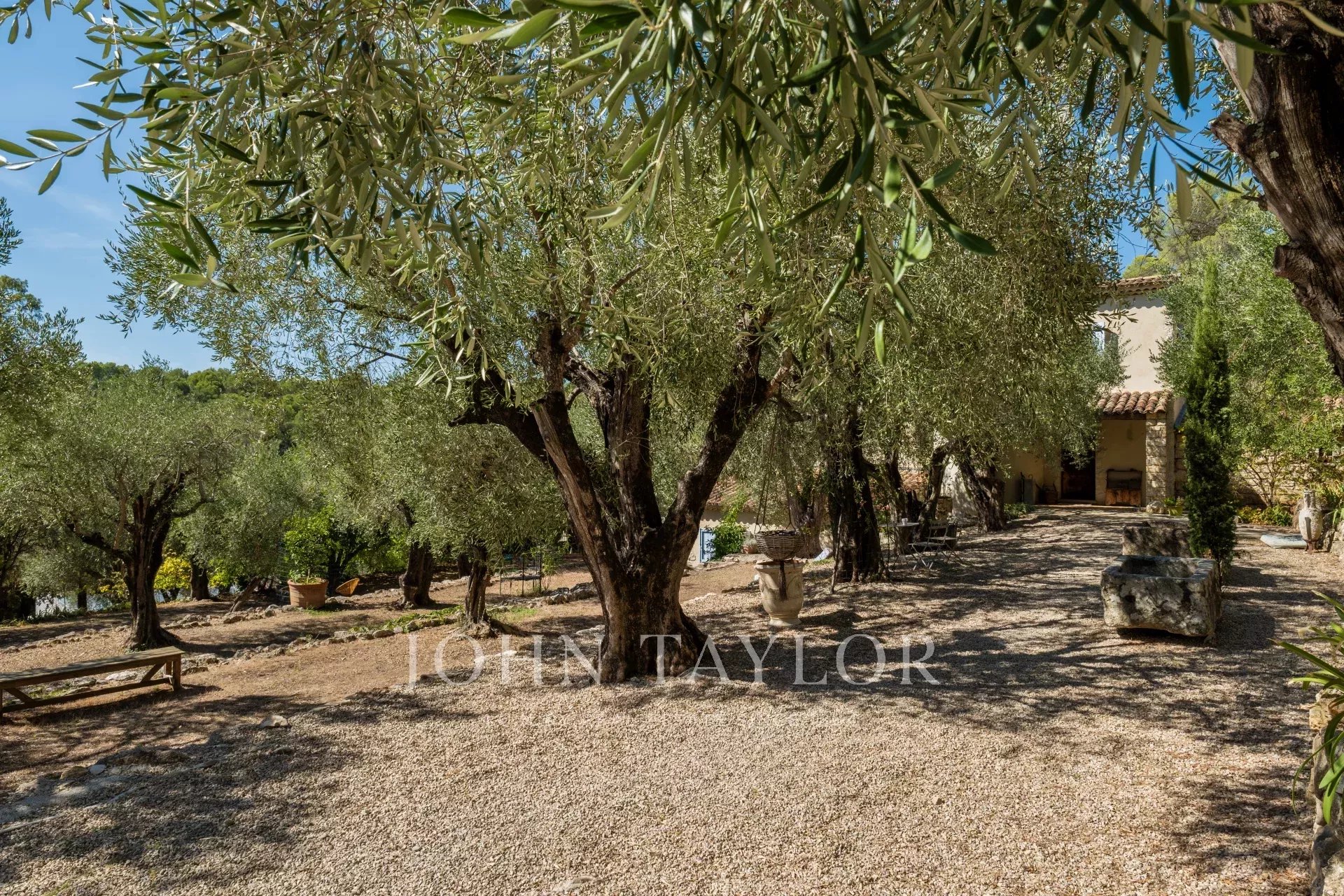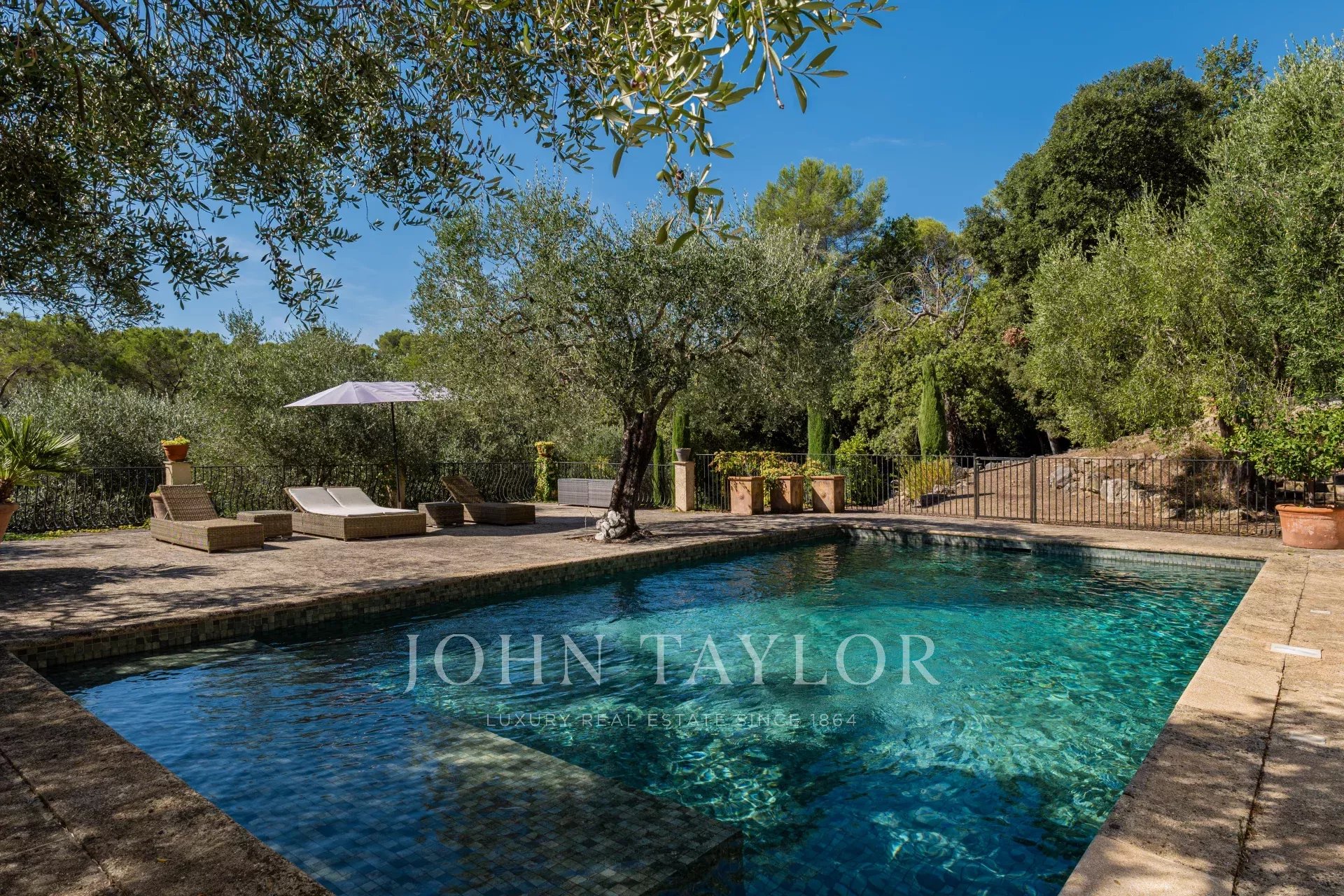 Situata in un ambiente bucolico con quasi 70 ulivi in un parco di due ettari, questa magnifica casa di campagna provenzale di 280 m² con piscina si trova a pochi passi dai campi da golf e dal pittoresco villaggio di Valbonne.