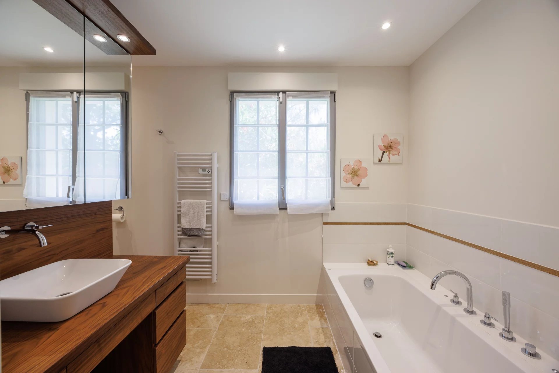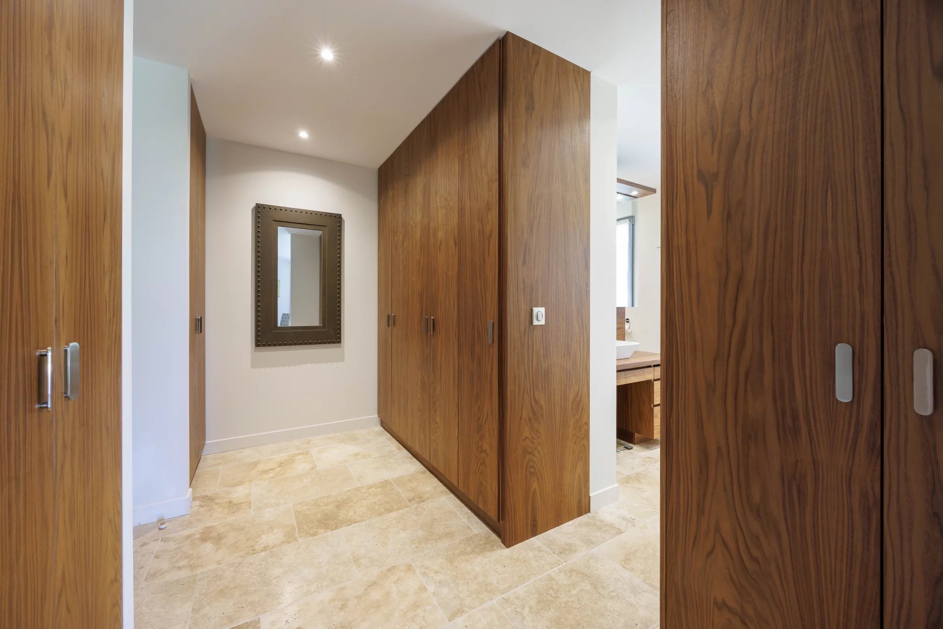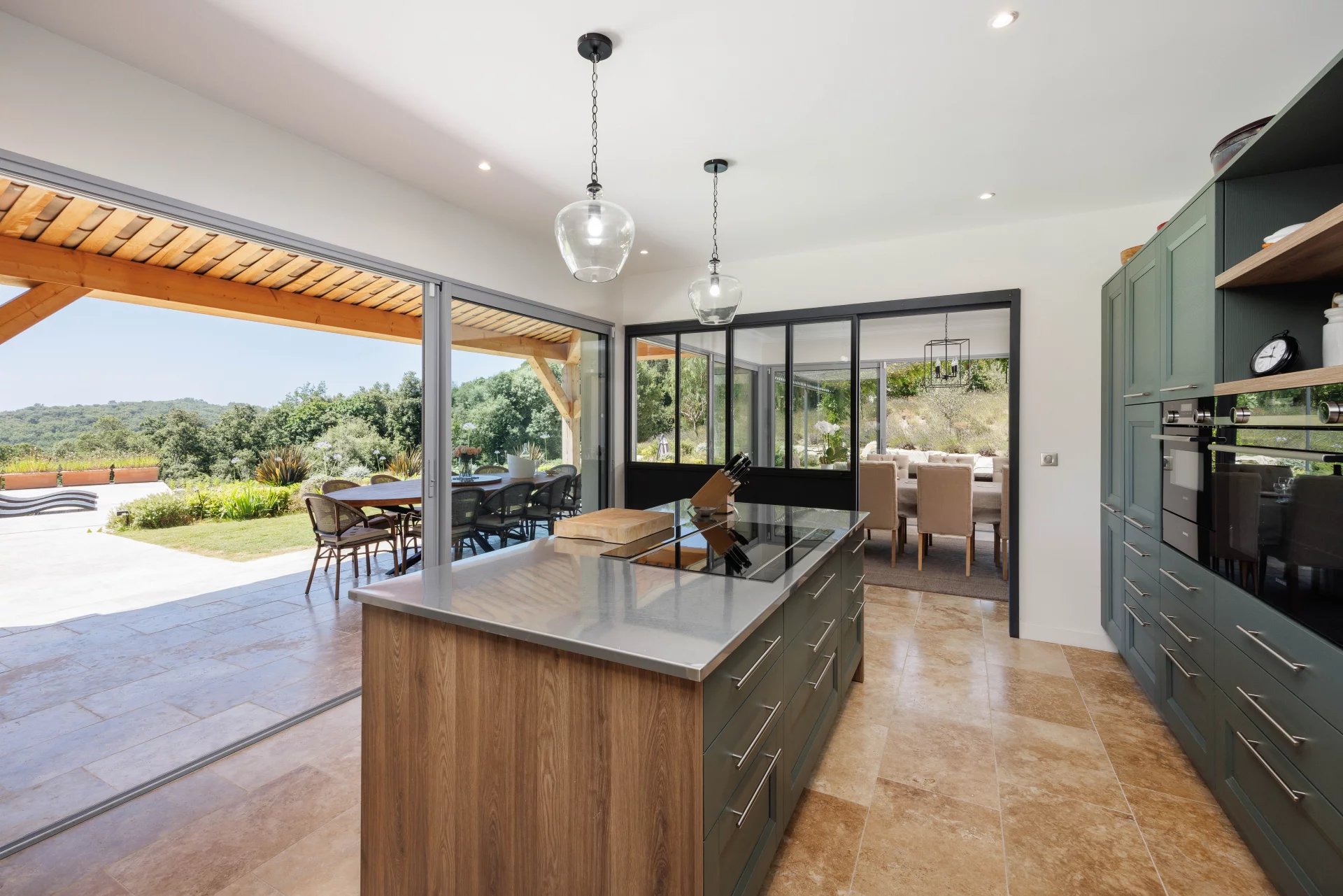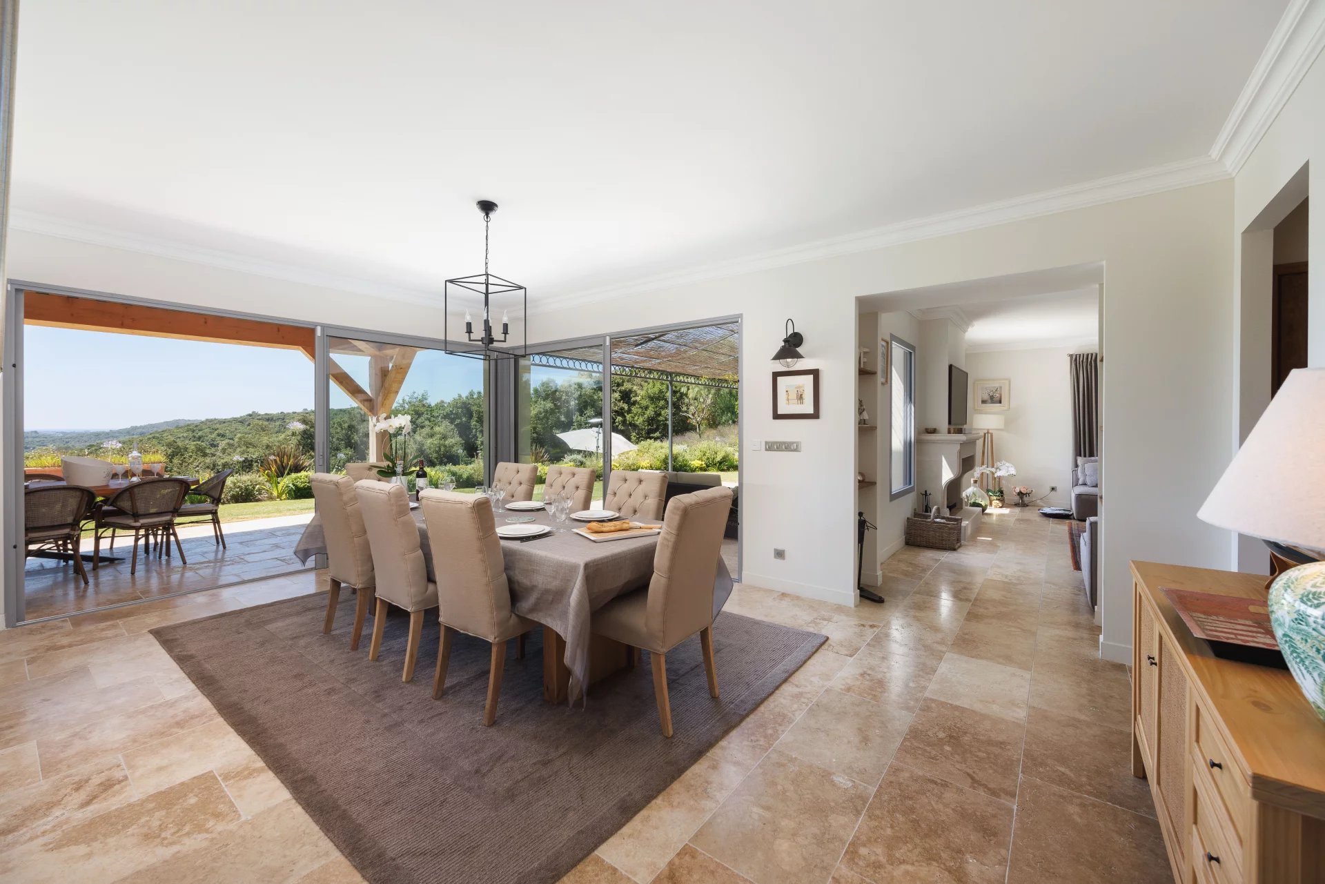 Al piano terra, la villa comprende un bellissimo ingresso, una sala da pranzo collegata a una grande cucina con isola centrale, che si apre su una vasta terrazza coperta di oltre 85 m² e su una terrazza all'aperto, un accogliente salotto con camino e la suite padronale con spogliatoio e bagno completo; lavanderia e ampio garage per due veicoli.