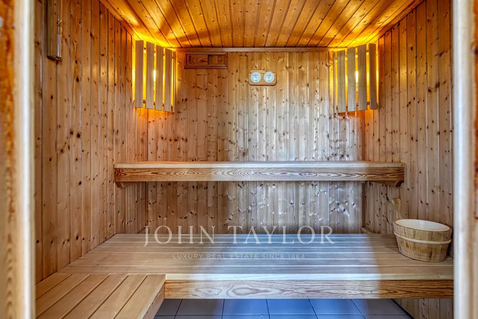 Al piano superiore, quattro camere da letto con bagno privato, uno spogliatoio (possibile camera da letto aggiuntiva), uno studio soppalcato e una sauna a quattro posti completano la zona notte.