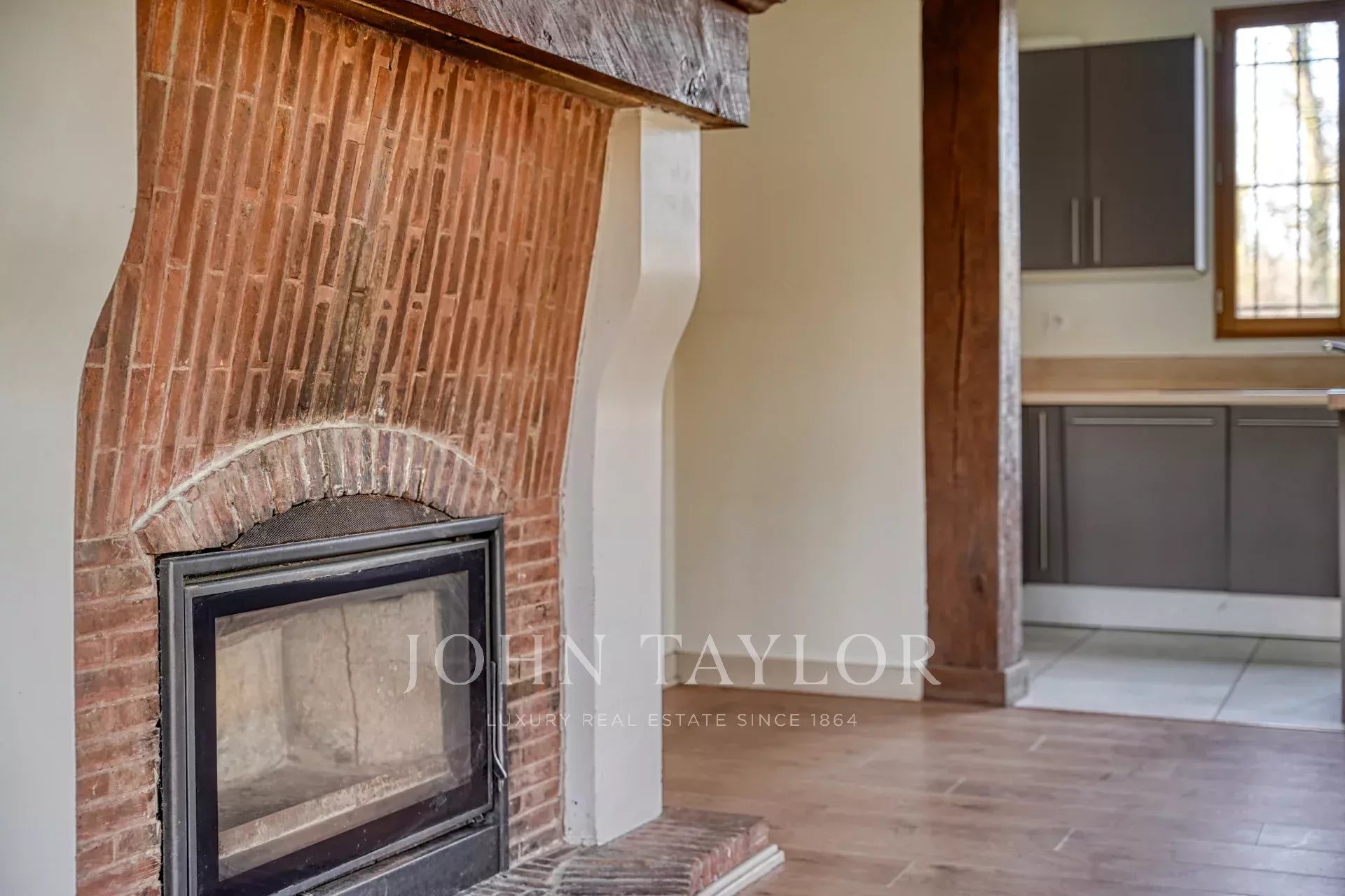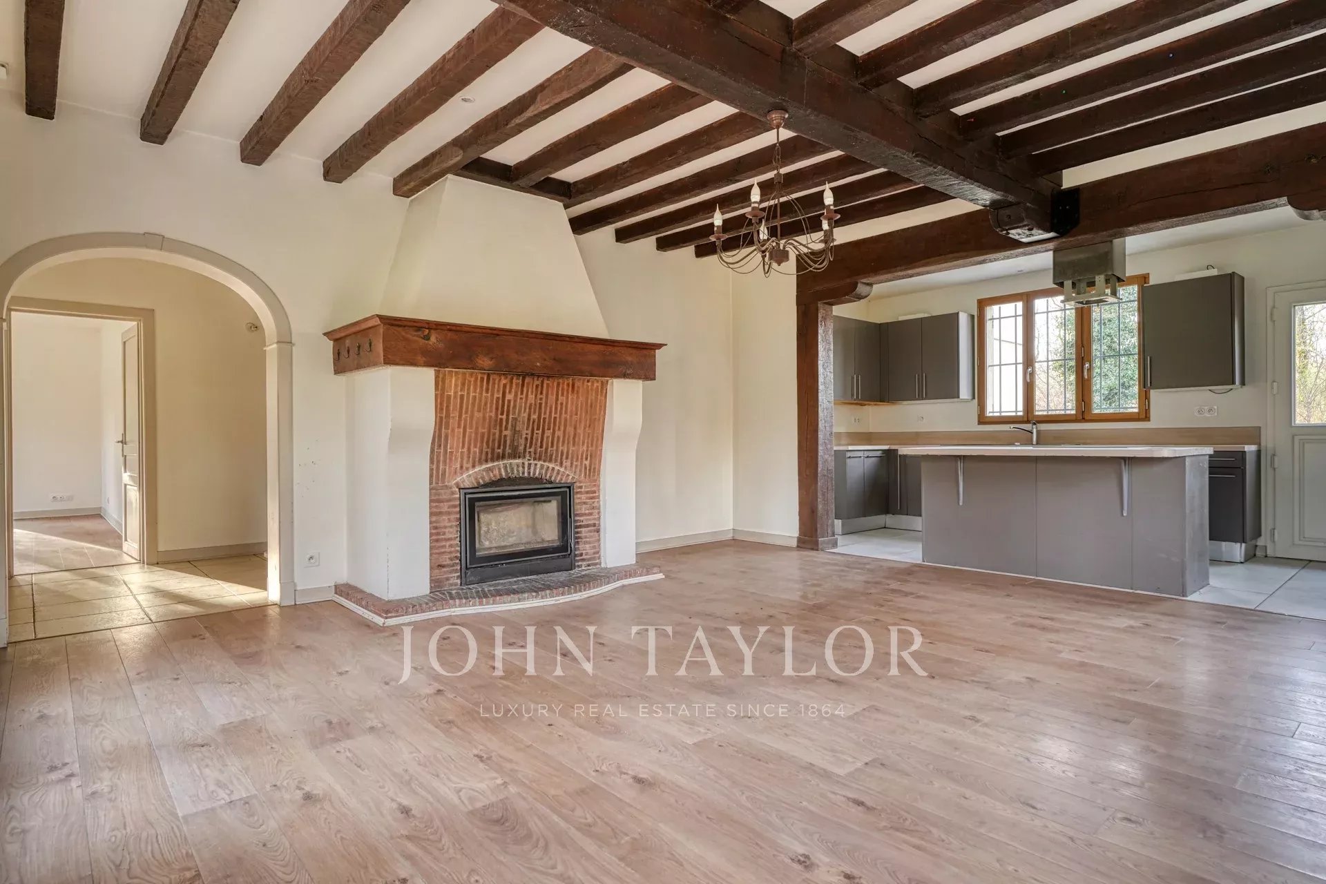Un ingresso, un soggiorno con cucina a vista, impreziosito da travi a vista e da un camino, un salotto o una sala da pranzo, una suite al piano terra con bagno doccia e una toilette separata.