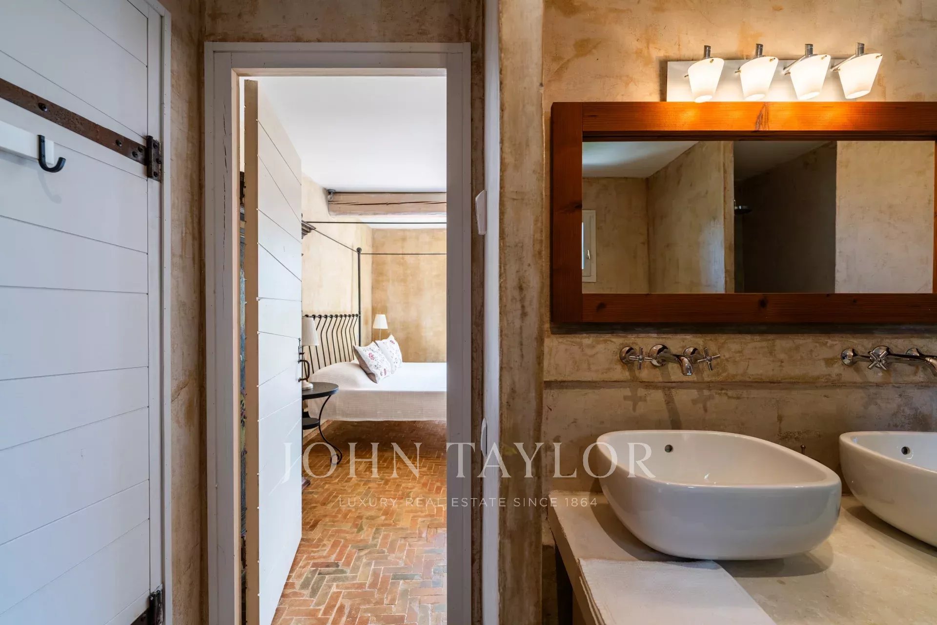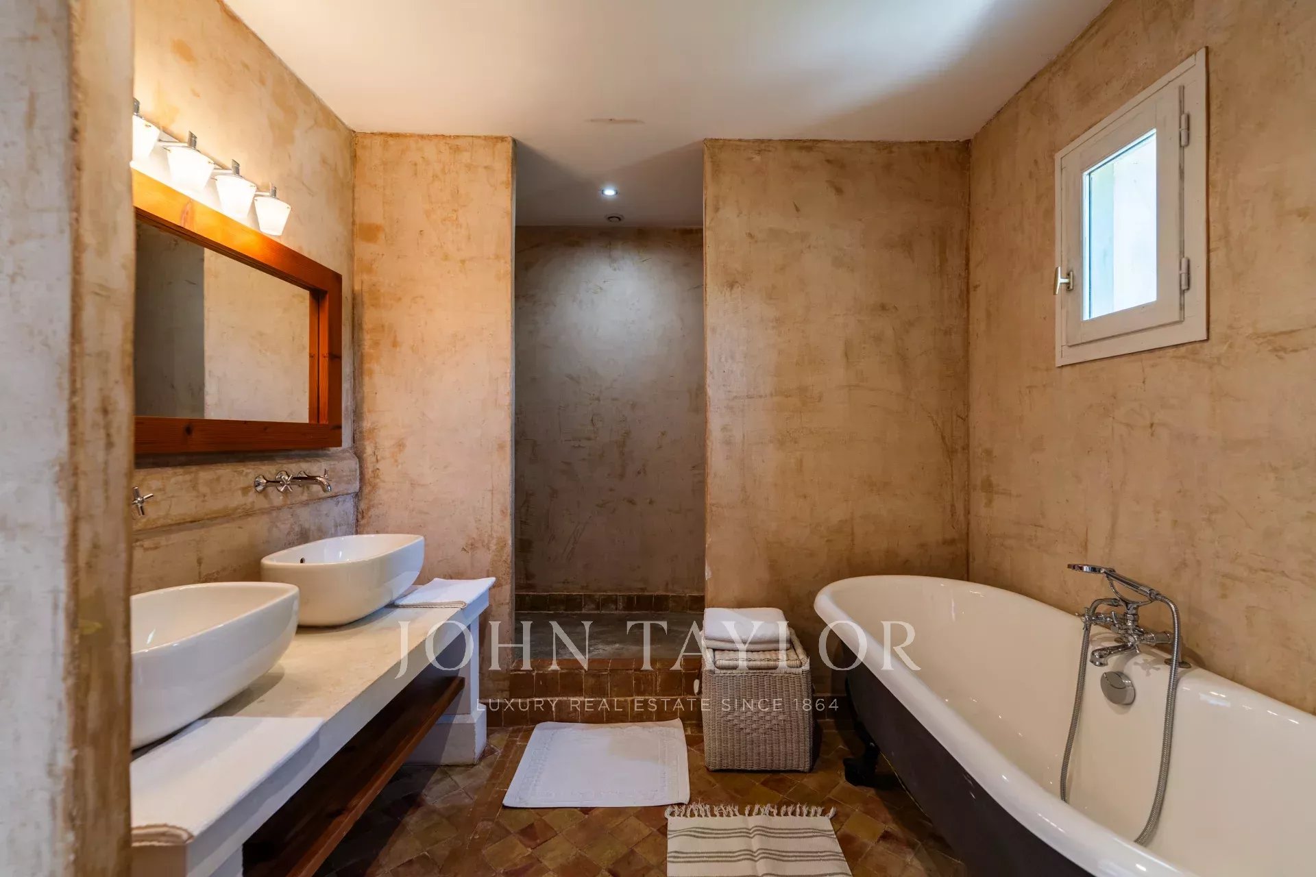 I materiali utilizzati sono stati accuratamente selezionati: pavimenti in pietra di Ménerbes, pareti in tadelakt marocchino, per un'atmosfera calda, senza tempo e minerale.