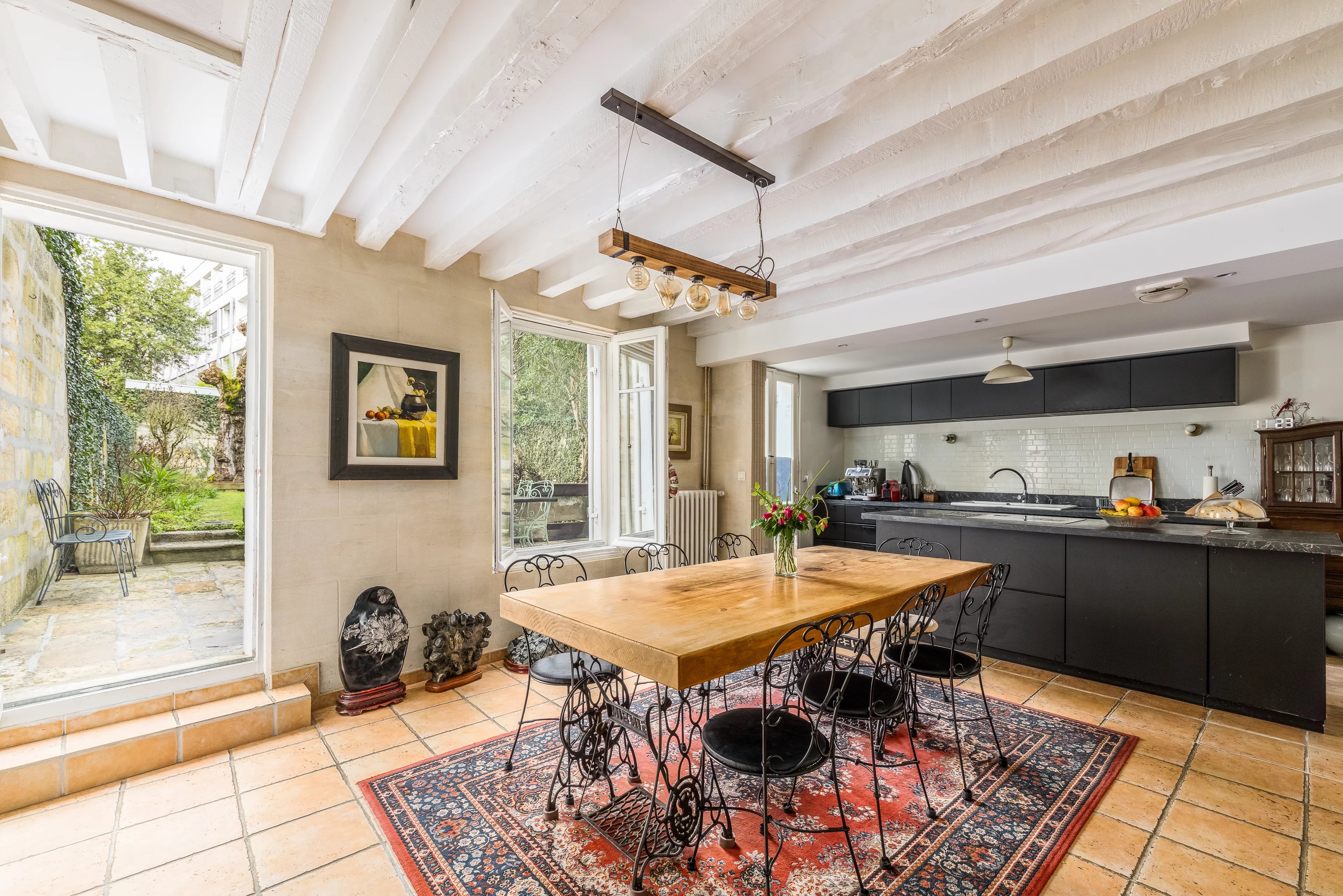 Dietro una sublime facciata in pietra, l'ingresso con spazio per una bicicletta conduce a un soggiorno molto elegante di 30 m², a una grande cucina con sala da pranzo che si apre sul giardino e, attualmente, a due uffici al piano terra che potrebbero essere facilmente trasformati in camere da letto.