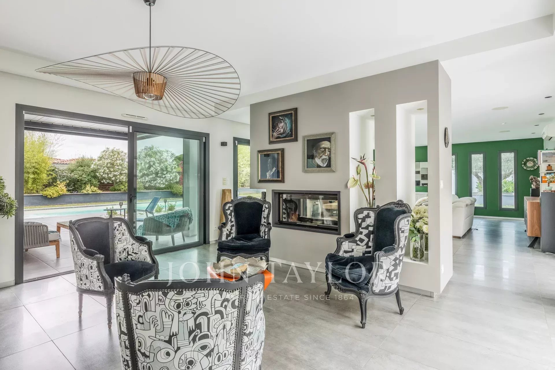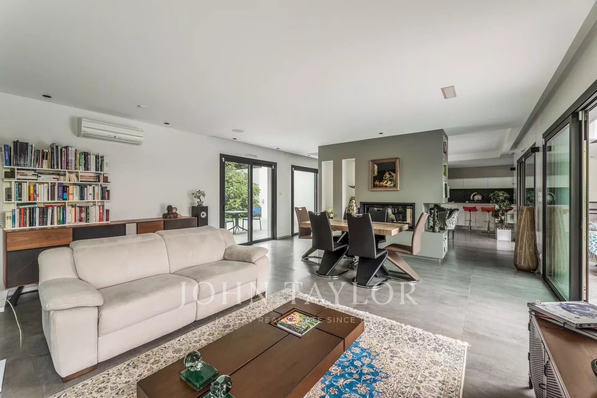 La maggior parte della villa è costruita su un unico livello e la sua spaziosità, la luce e l'atmosfera decisamente contemporanea sono immediatamente attraenti. La sala di ricevimento di 90 m², inondata di luce grazie alle sue ampie vetrate, si apre su diverse terrazze e presenta un elegante caminetto a due fuochi. Una cucina a pianta aperta completamente attrezzata completa lo spazio abitativo.