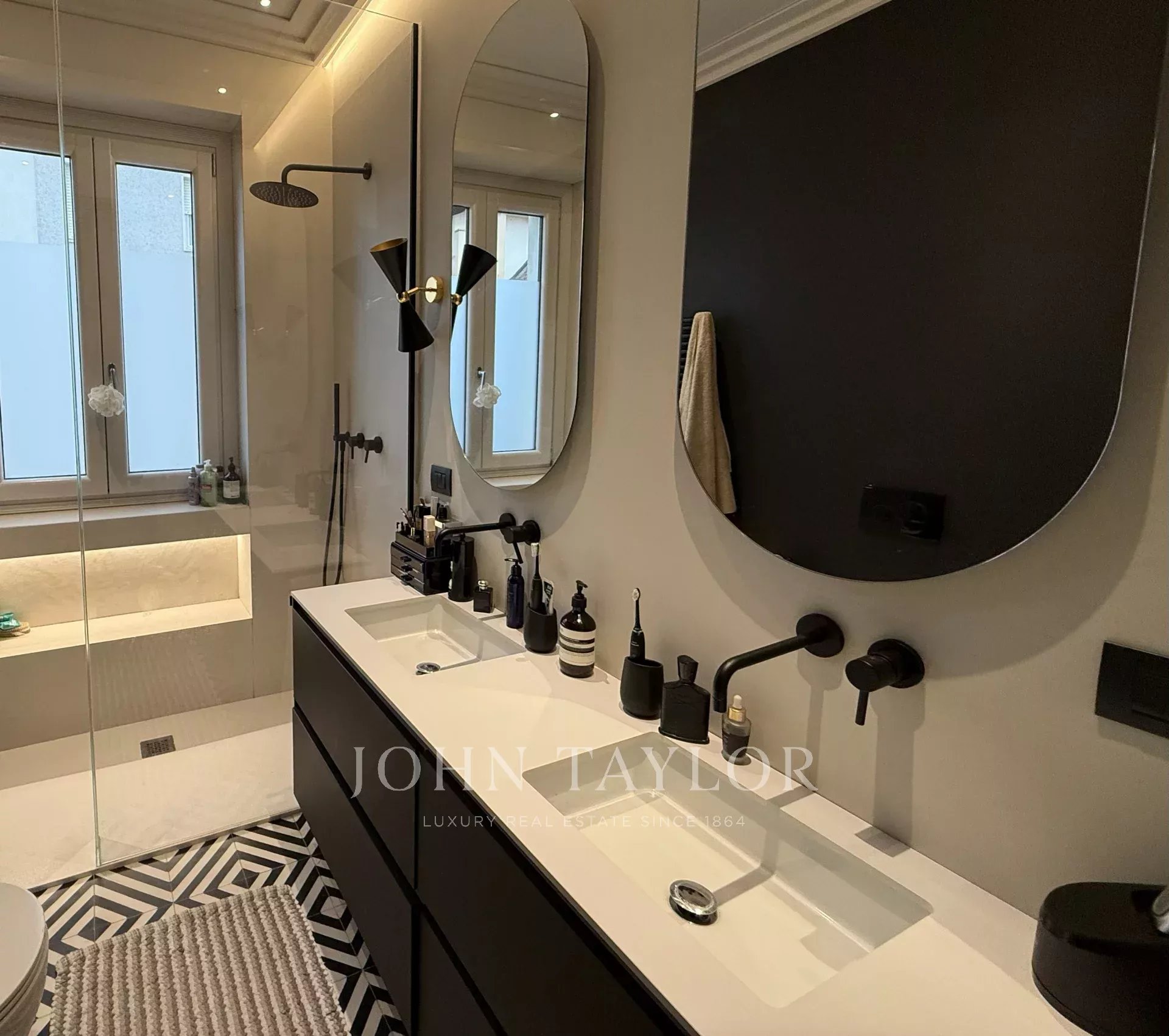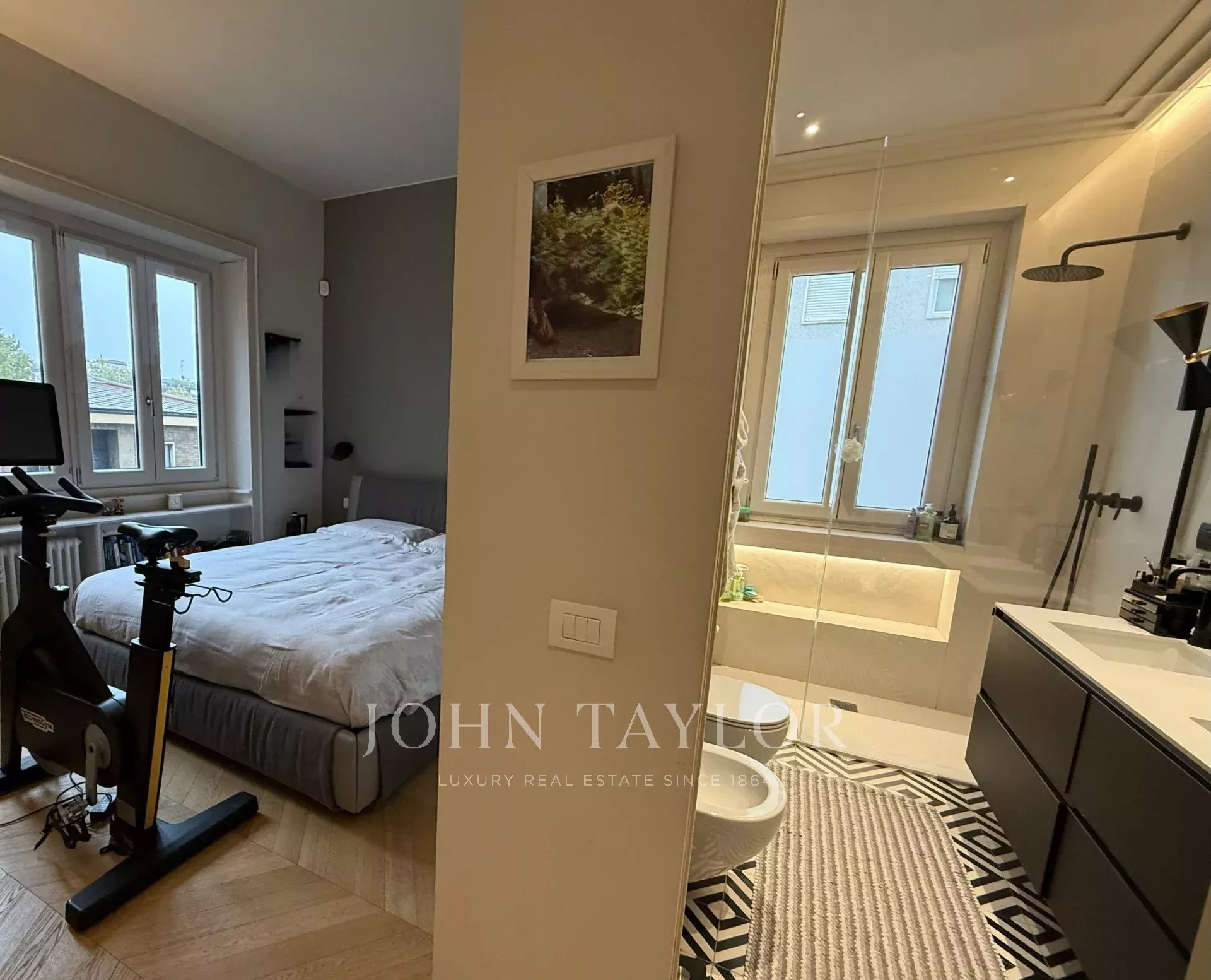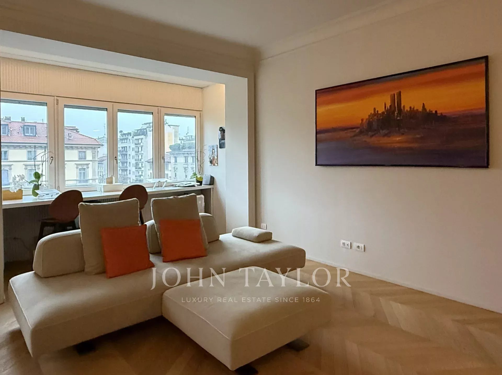 Elegant and well-maintained residence in a period building, with panoramic views. The property features two entrances, a large living room with a separate kitchen, two double bedrooms, two bathrooms, a laundry room, and a balcony, partially furnished with refined details. Requested monthly price € 4.000,00
