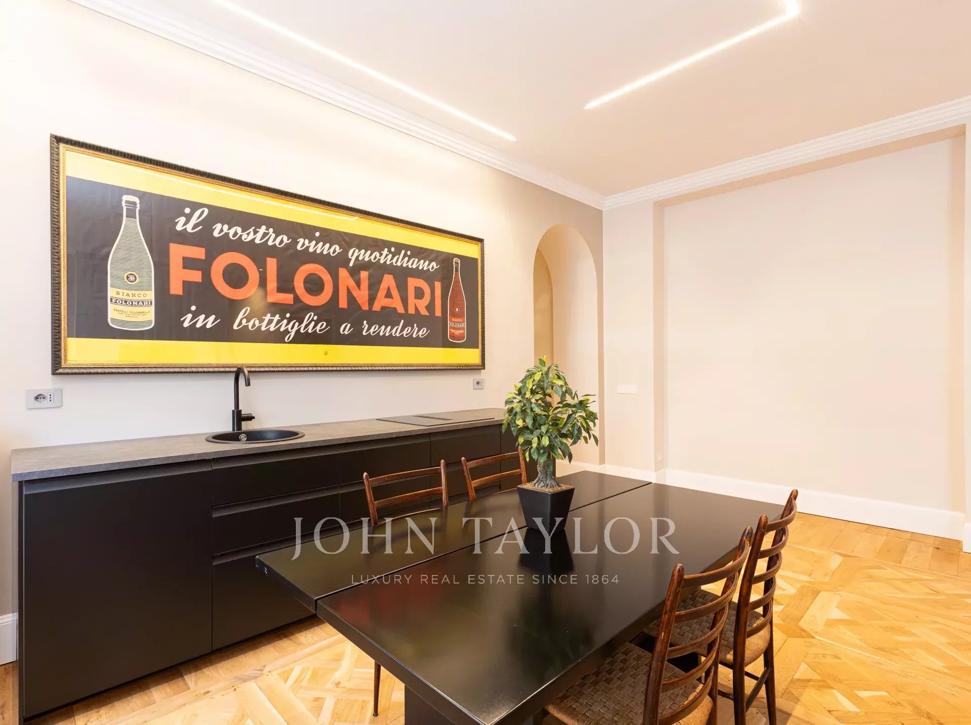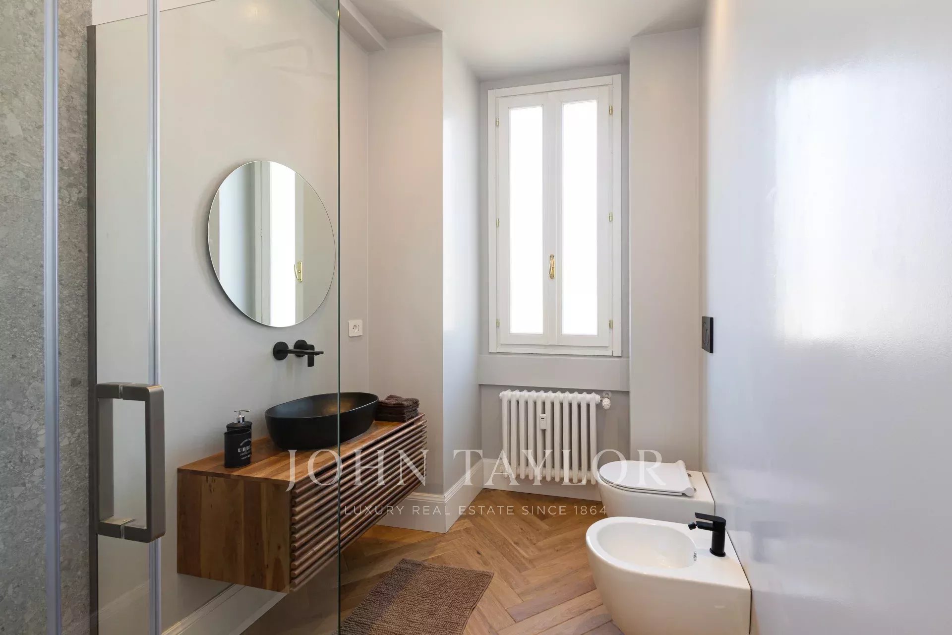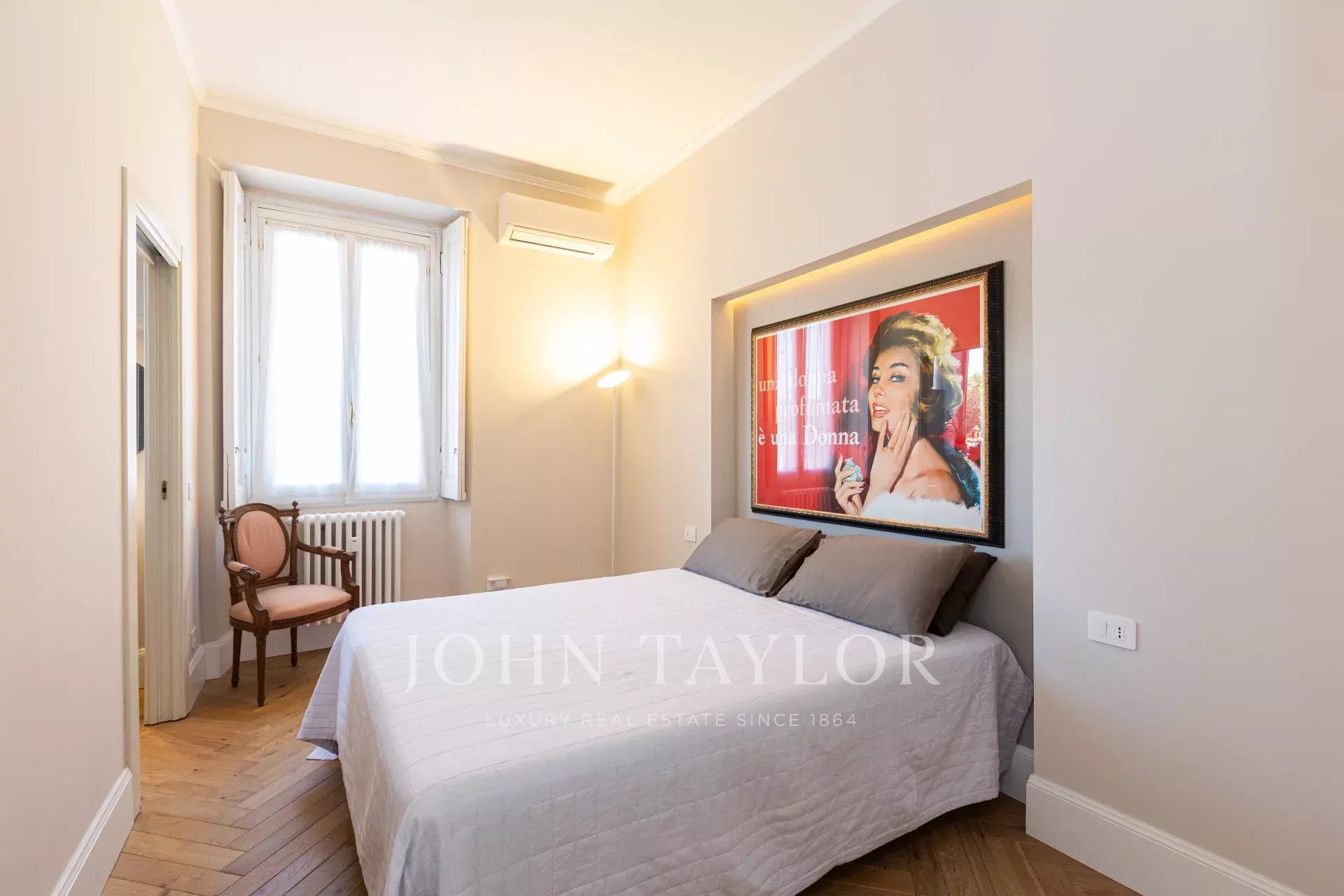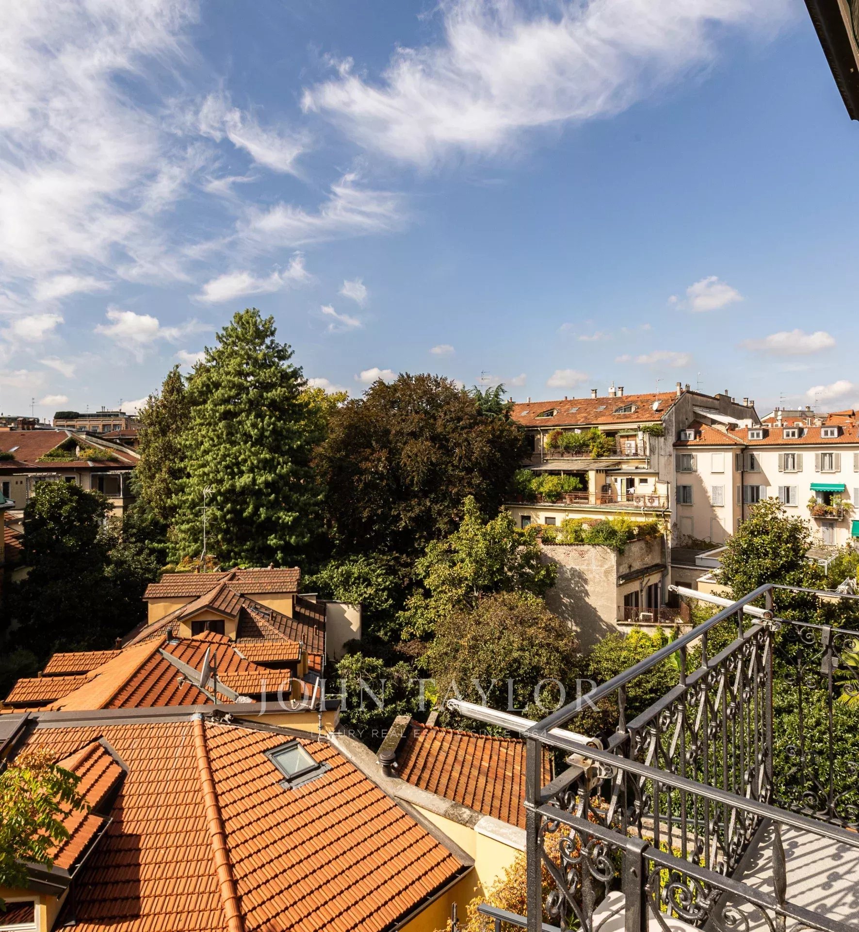 Exclusive to John Taylor, top floor in one of the most exclusive and prestigious areas of Milan, we offer for rent a magnificent residence located on the top floor of an elegant period building with full-day concierge service. The apartment, completely new and never lived in, features unique finishes and furnishings, custom-made with the finest materials. Covering approximately 130 sqm, the property stands out for its great charm, brightness, quietness, and captivating views. The layout includes a spacious entrance hall, a double living room with dining area and kitchen area, two master bedrooms, two bathrooms, a laundry/ironing room, and two balconies. A rare living solution of the highest quality, ideal for those seeking elegance, privacy, and comfort in a historic setting of remarkable charm. Monthly rent: € 4,200.