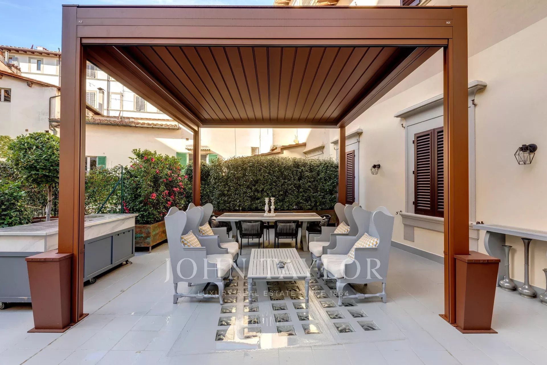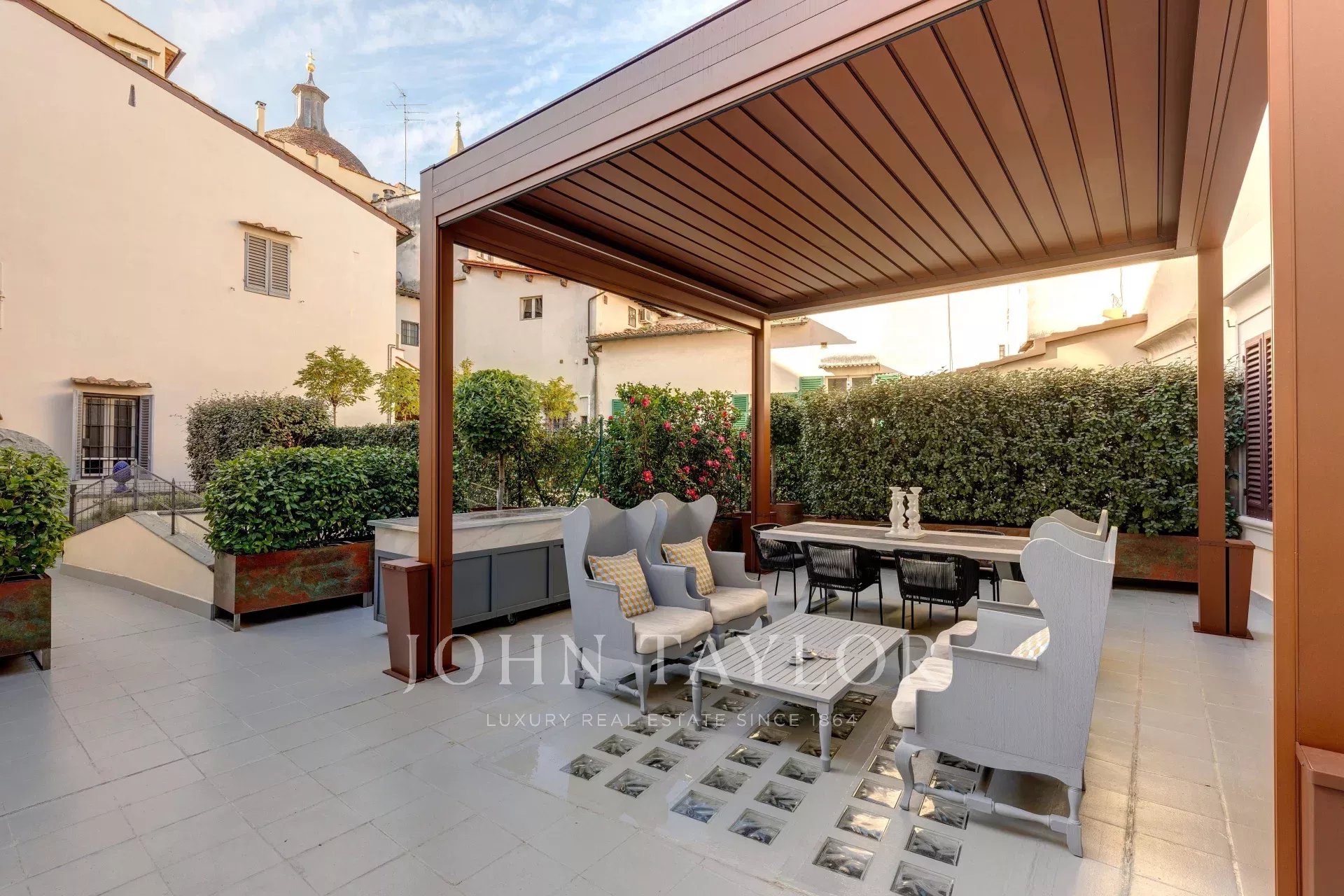 Una magnifica terrazza di 160 mq, completamente attrezzata per l’utilizzo tutto l’anno, offre un’oasi privata nel cuore di Firenze.