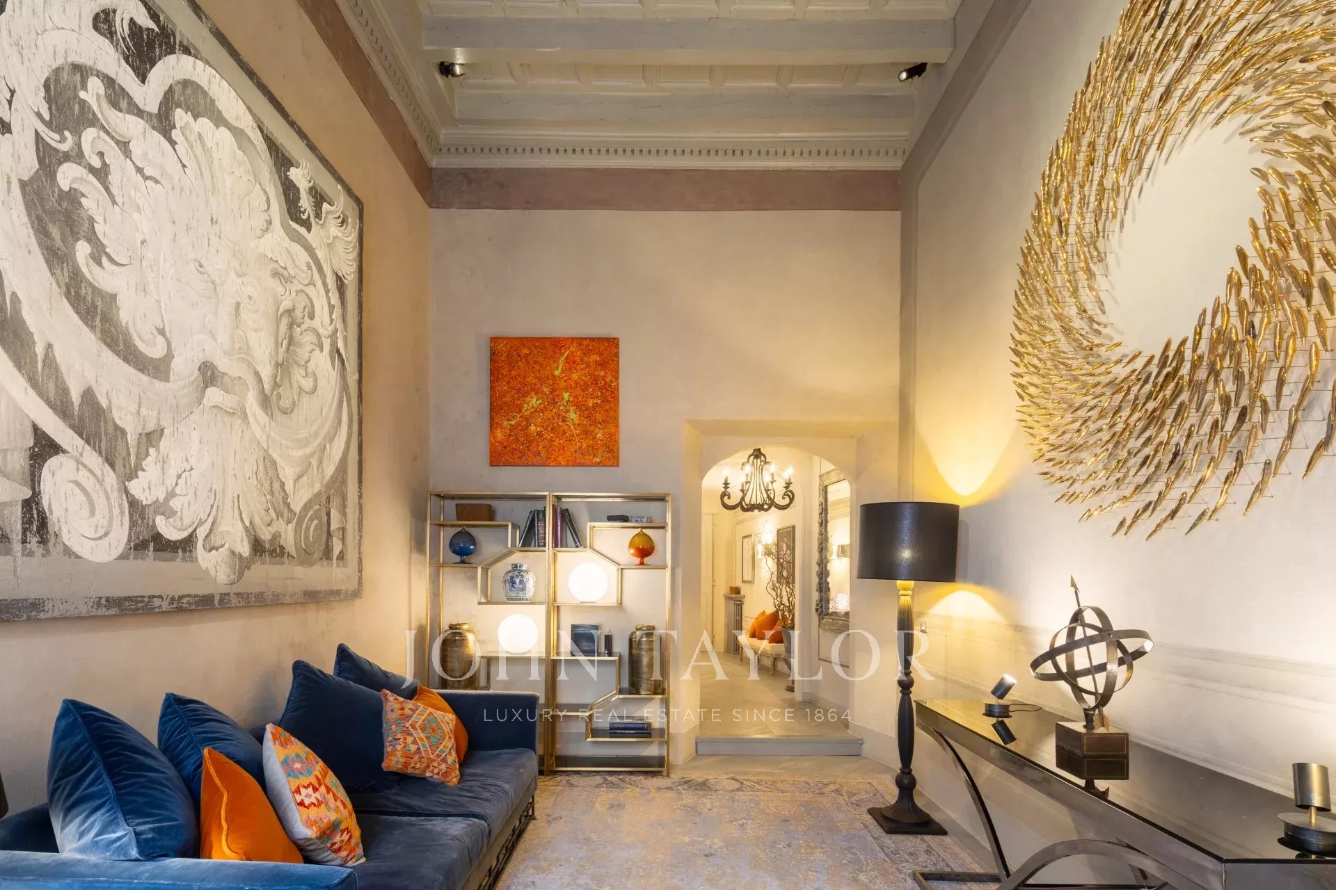 L’ingresso principale accoglie gli ospiti con un soffitto decorato, conducendo a un ampio soggiorno con soffitti alti a cassettoni e affreschi. L’area living principale combina armoniosamente uno spazio open-space per il soggiorno e la sala da pranzo con una cucina completamente attrezzata, dotata di un’isola centrale.