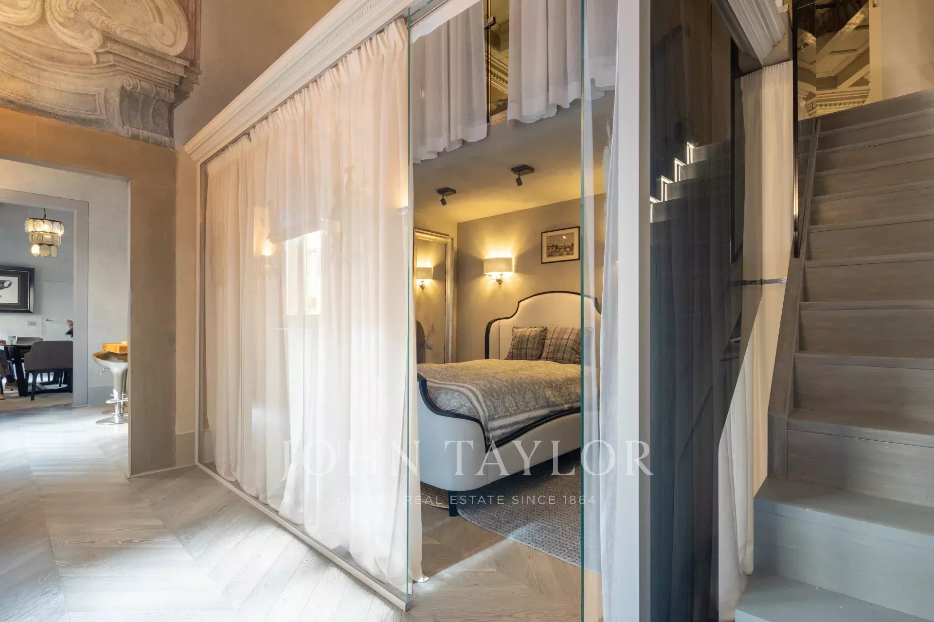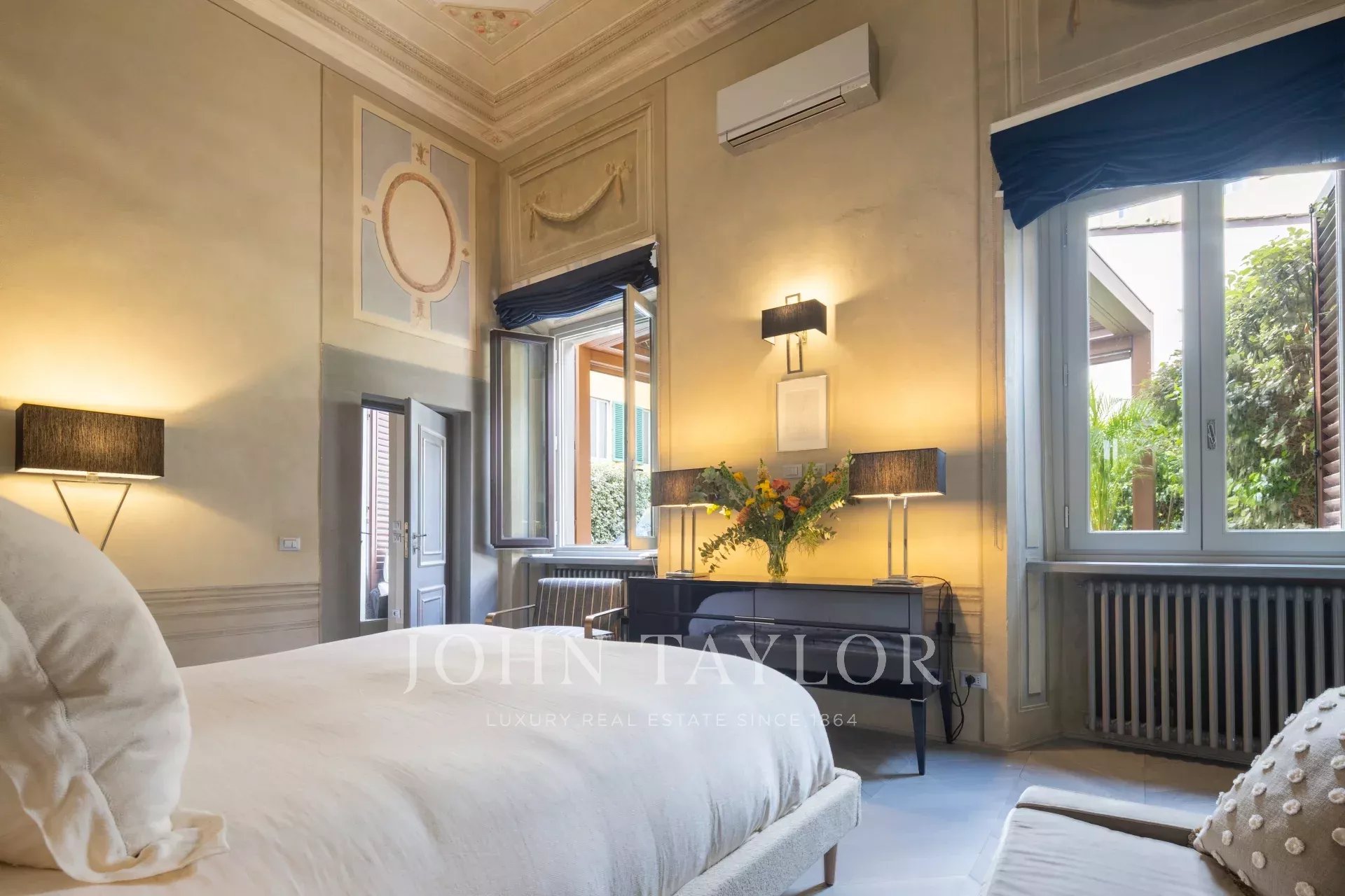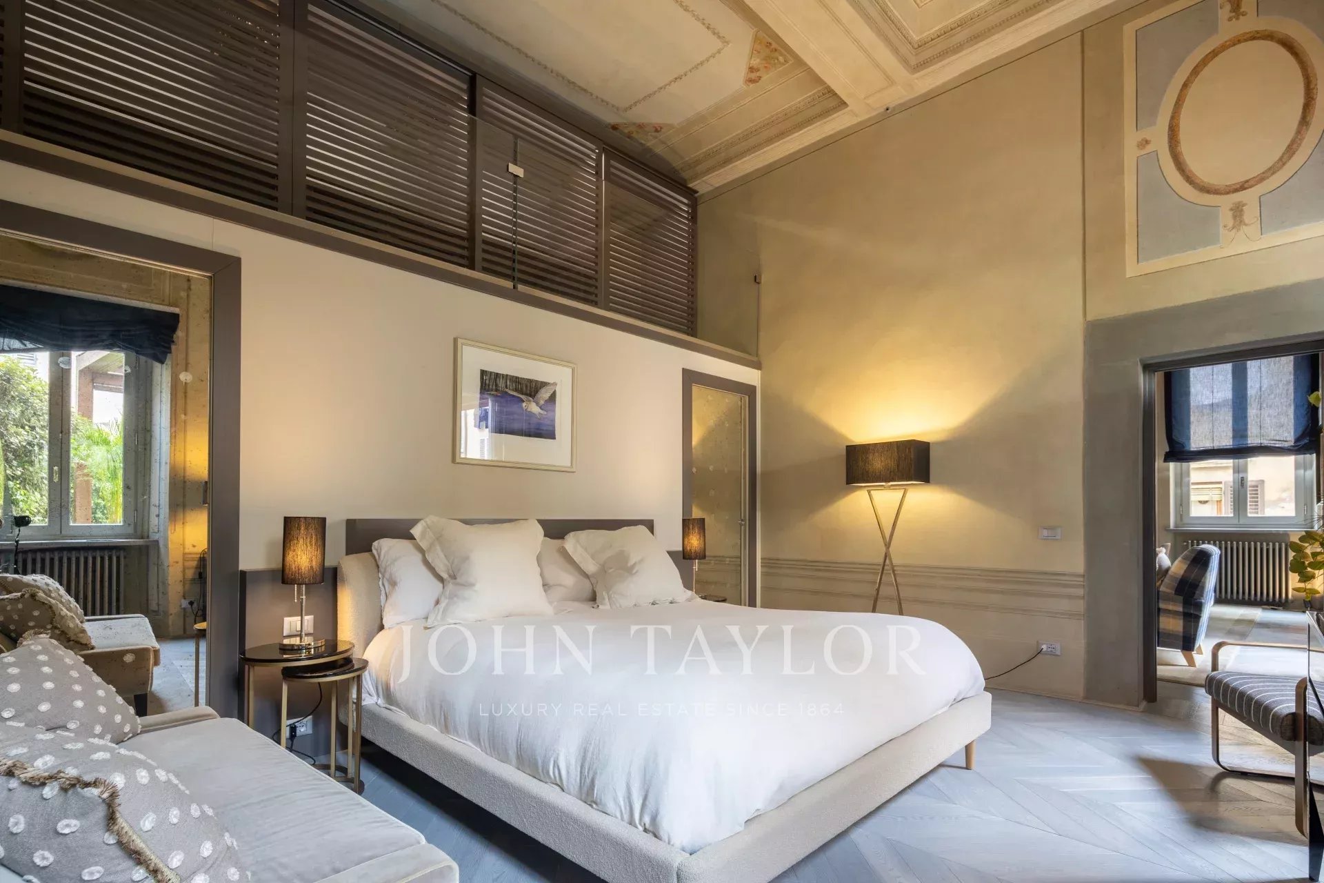 L’appartamento dispone di una spaziosa camera padronale, elegantemente arredata con ampie finestre e affreschi. La suite comprende una cabina armadio, un’area di stoccaggio e un bagno privato per la massima privacy. Completano l’appartamento due camere da letto aggiuntive, una delle quali dotata di bagno privato.