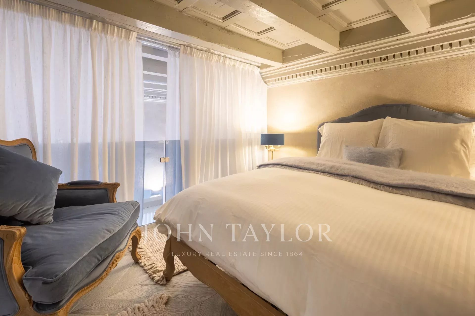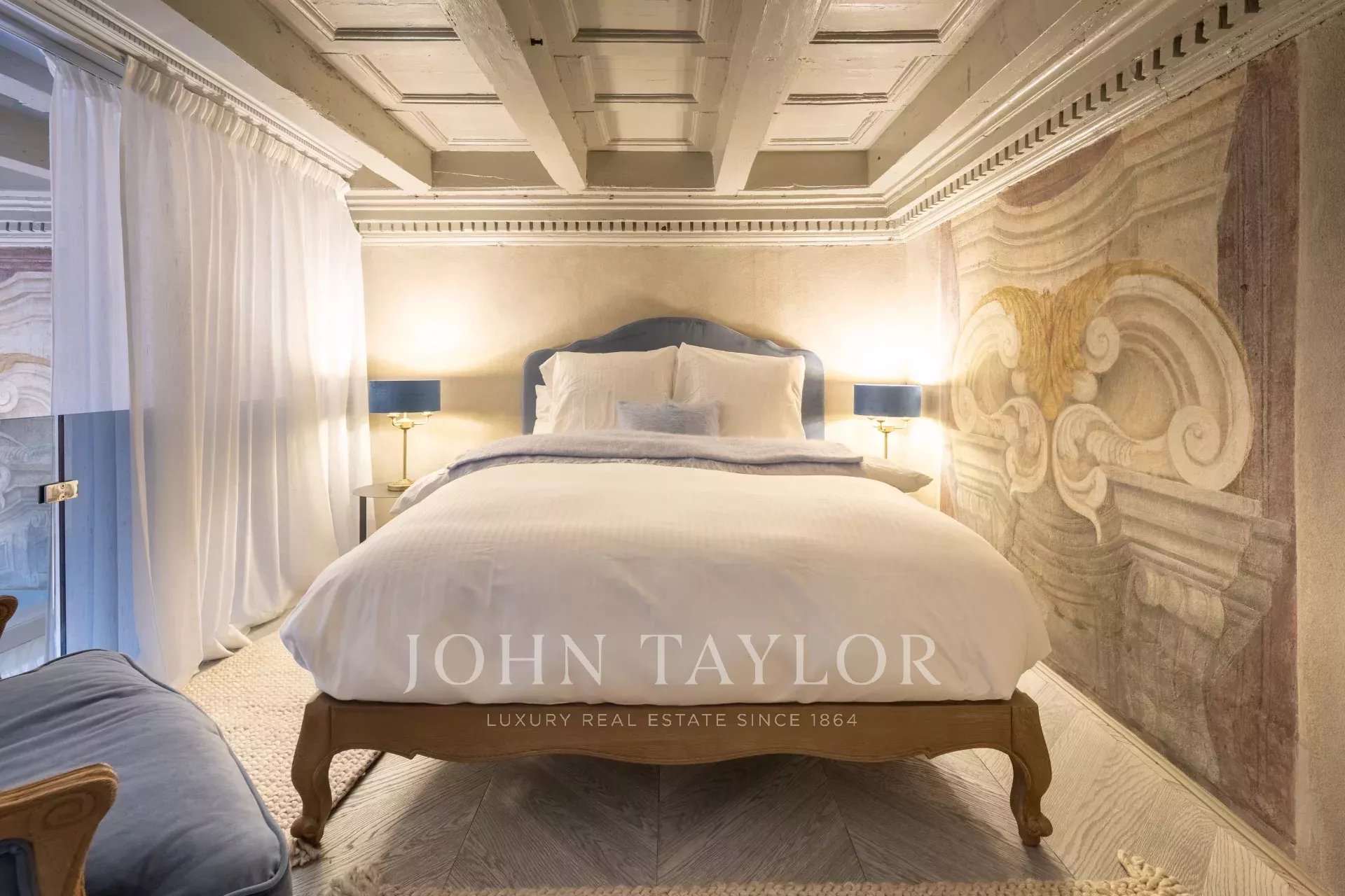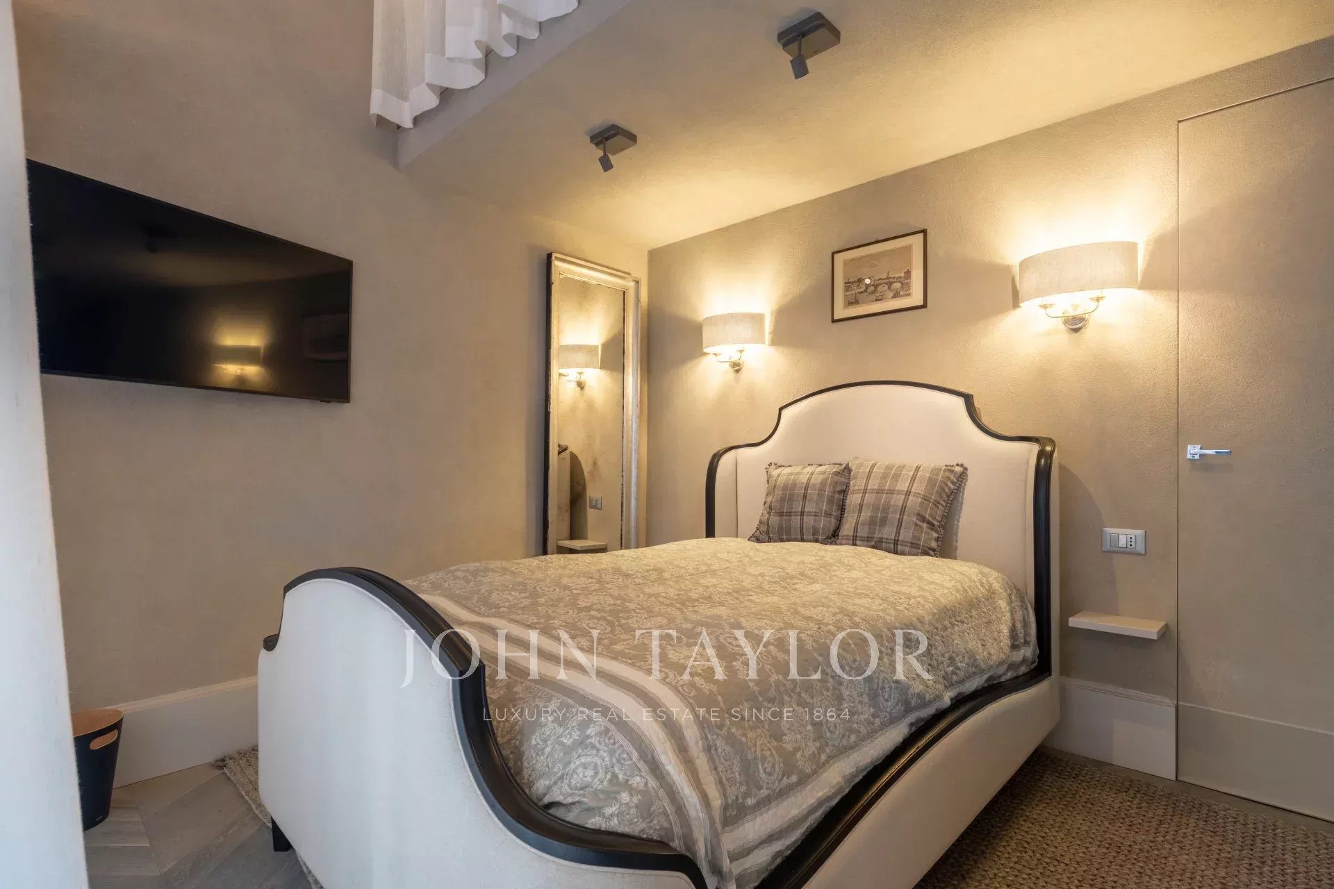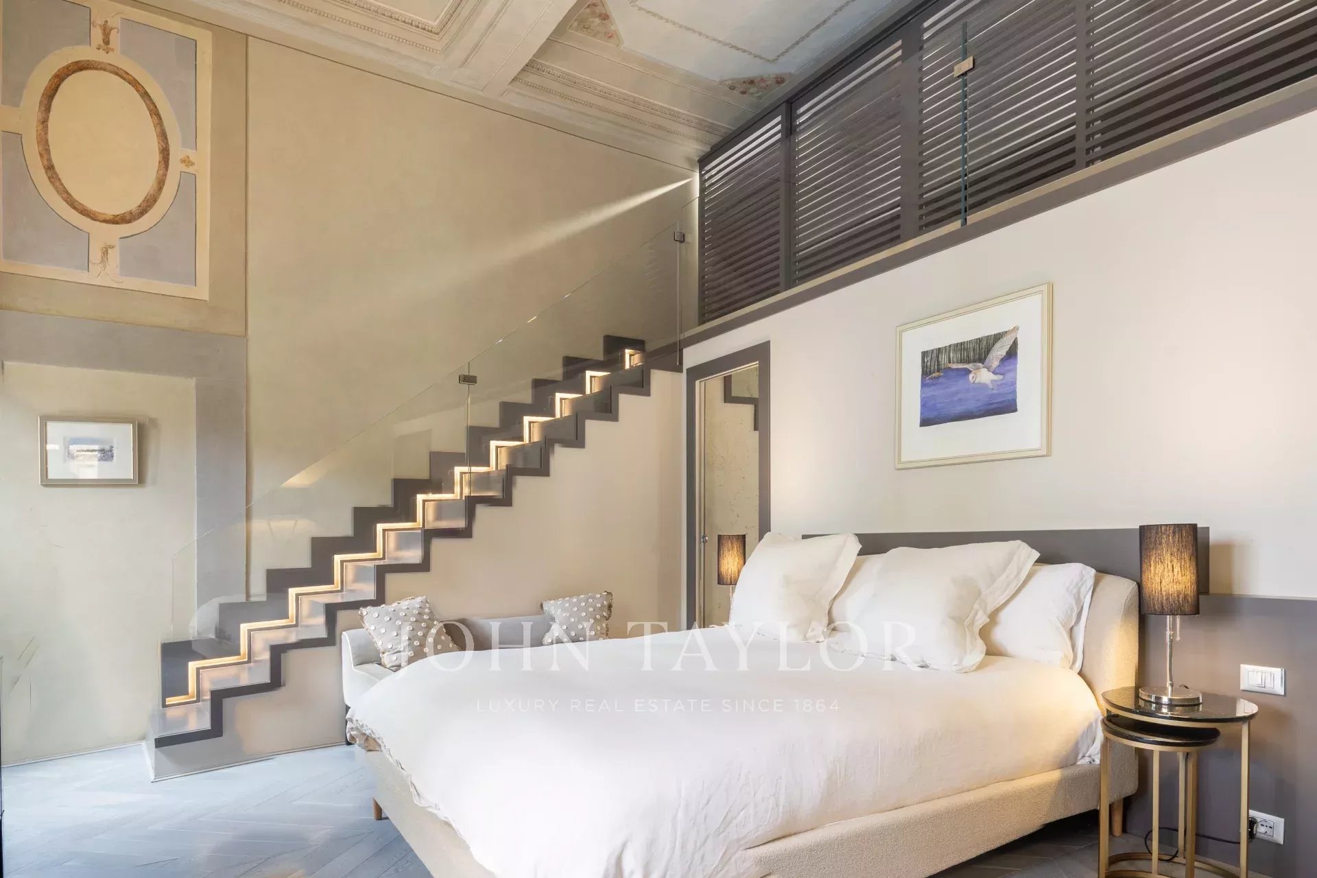 L’appartamento dispone di una spaziosa camera padronale, elegantemente arredata con ampie finestre e affreschi. La suite comprende una cabina armadio, un’area di stoccaggio e un bagno privato per la massima privacy. Completano l’appartamento due camere da letto aggiuntive, una delle quali dotata di bagno privato.