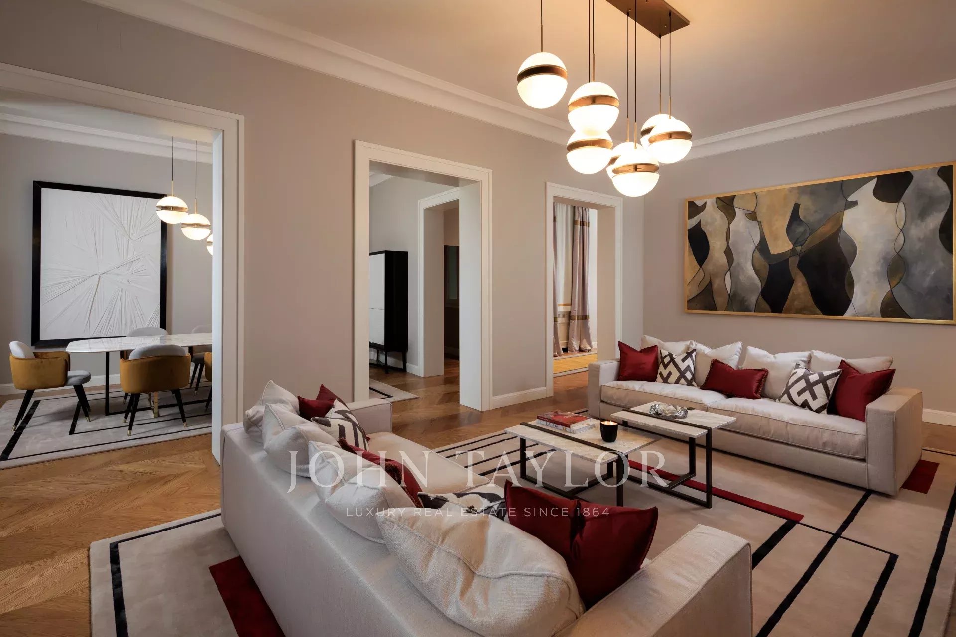 Il soggiorno spazioso, completo di camino, conduce in una sala da pranzo regale, perfetta per intrattenere gli ospiti. La cucina abitabile è attrezzata con elettrodomestici di alta gamma.