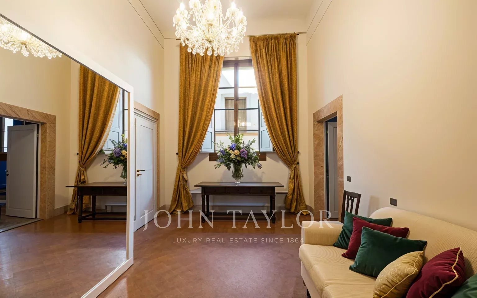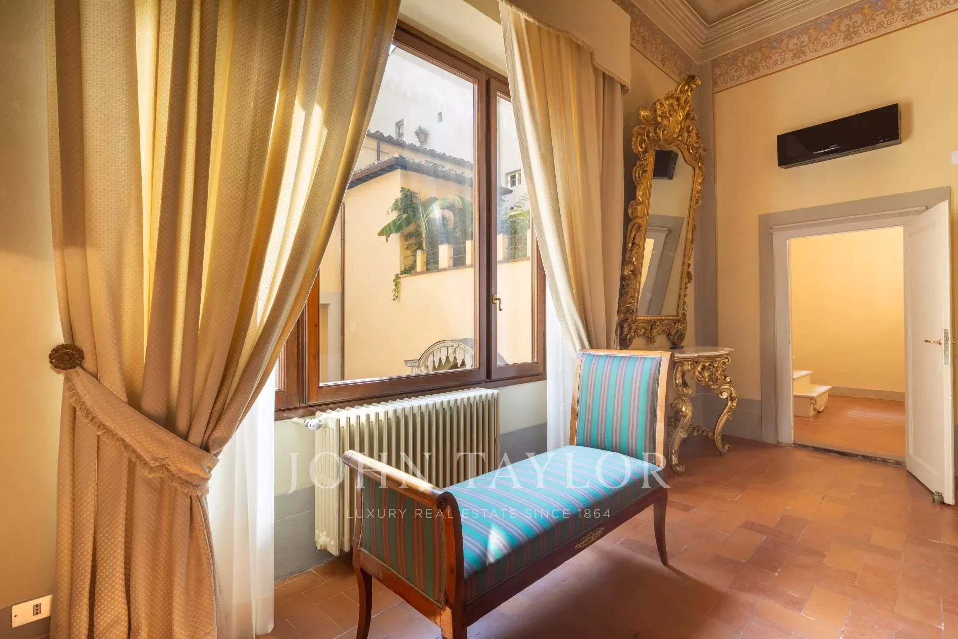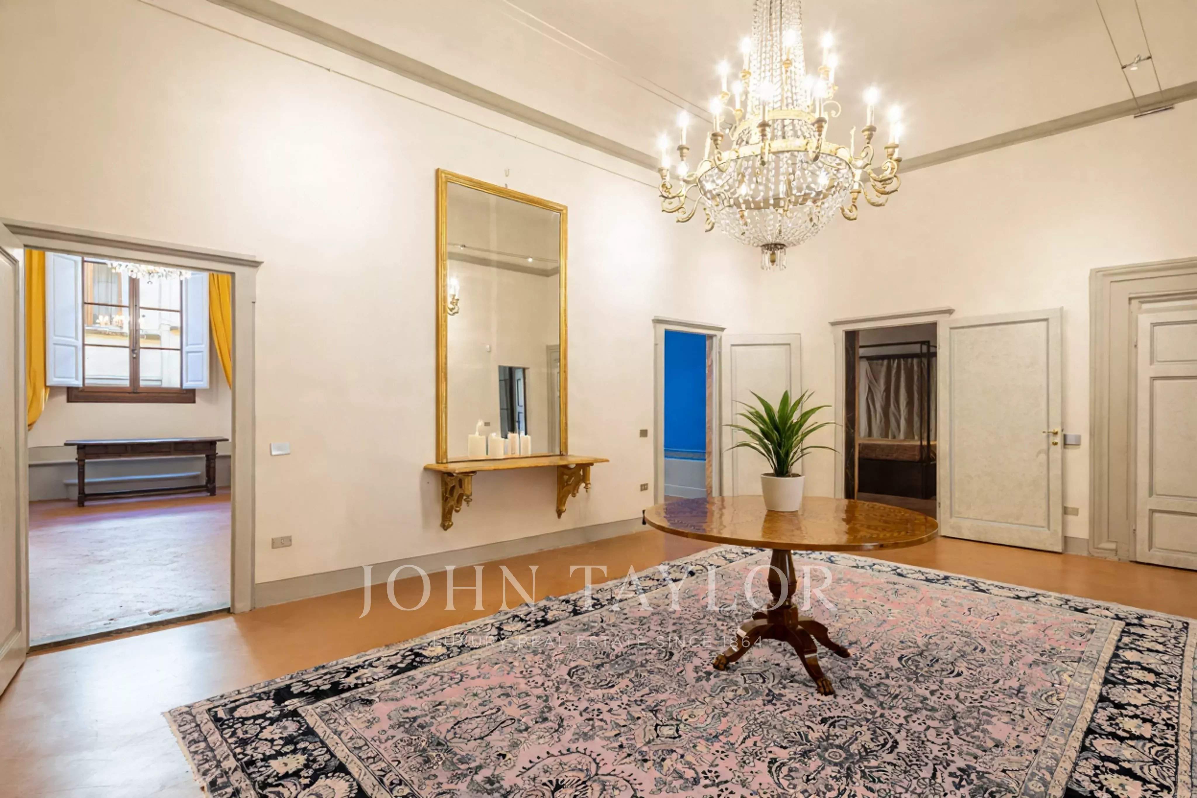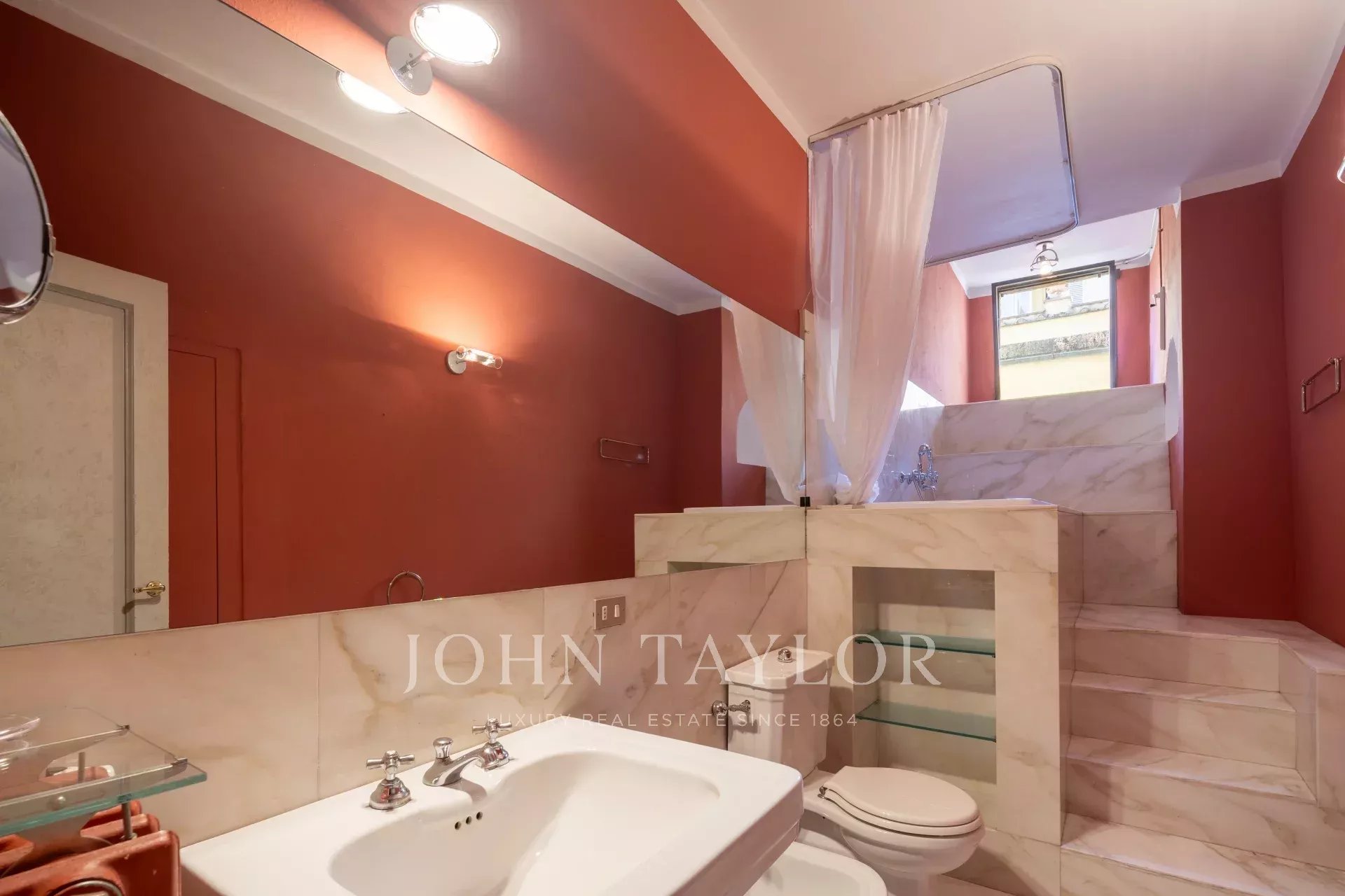 L’appartamento, parzialmente arredato, è interamente climatizzato, ed è composto da un ampio ingresso di rappresentanza da cui si accede ad un ampio soggiorno con antico camino e affacci su una curata corte, la sala da pranzo ha ampie finestre con affacci su Via Santo Spirito.