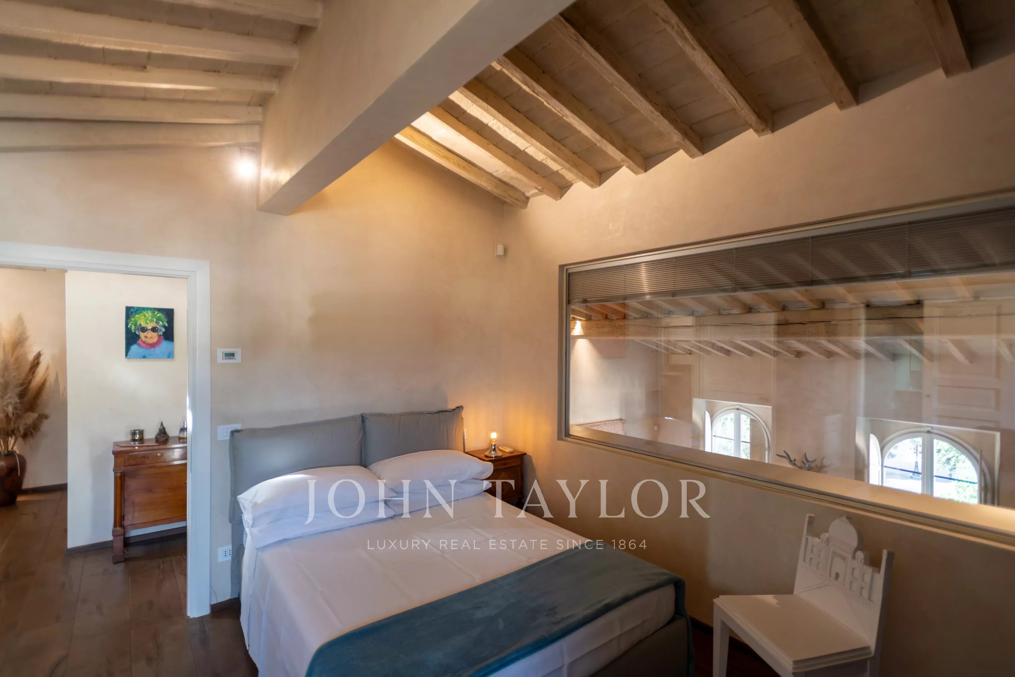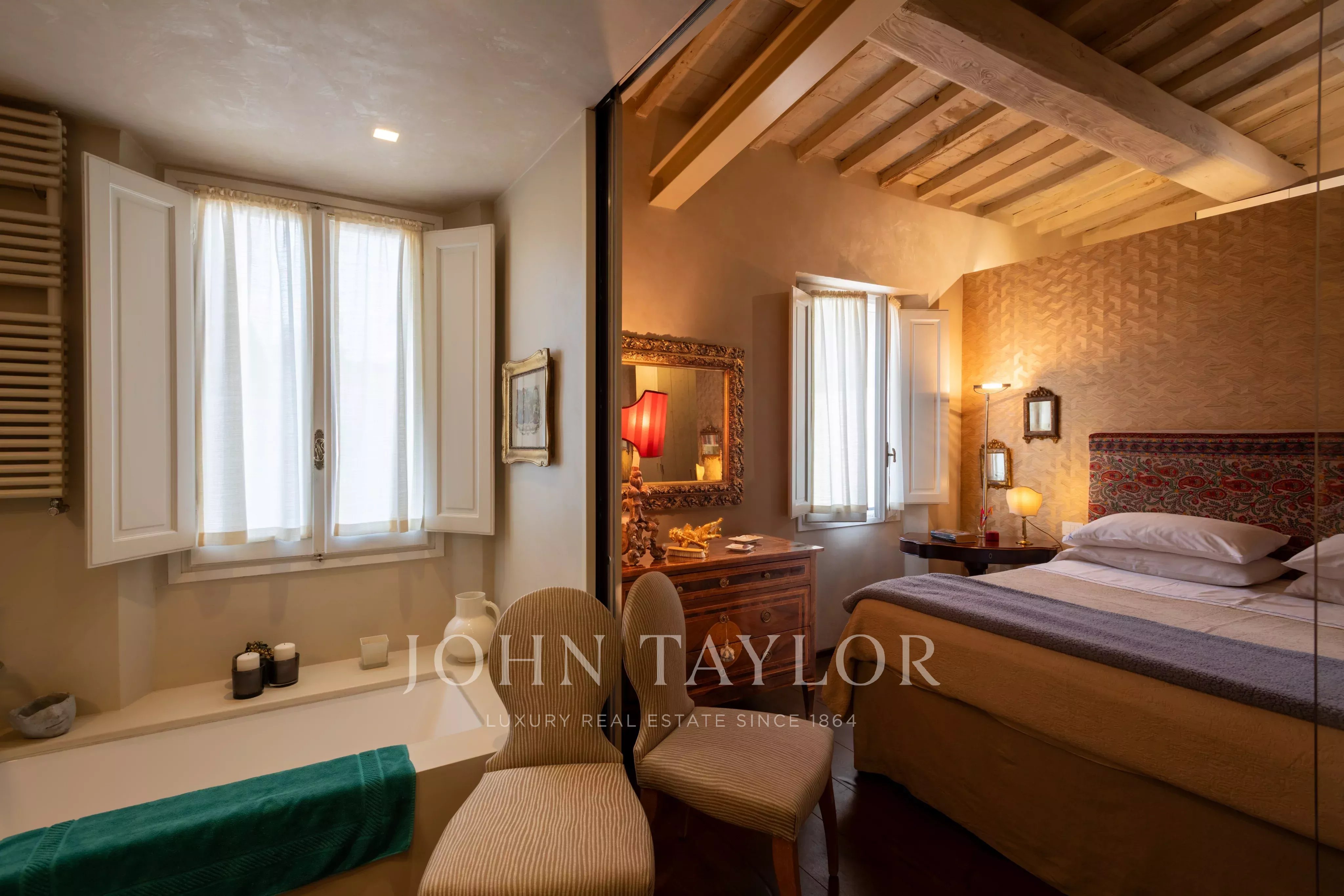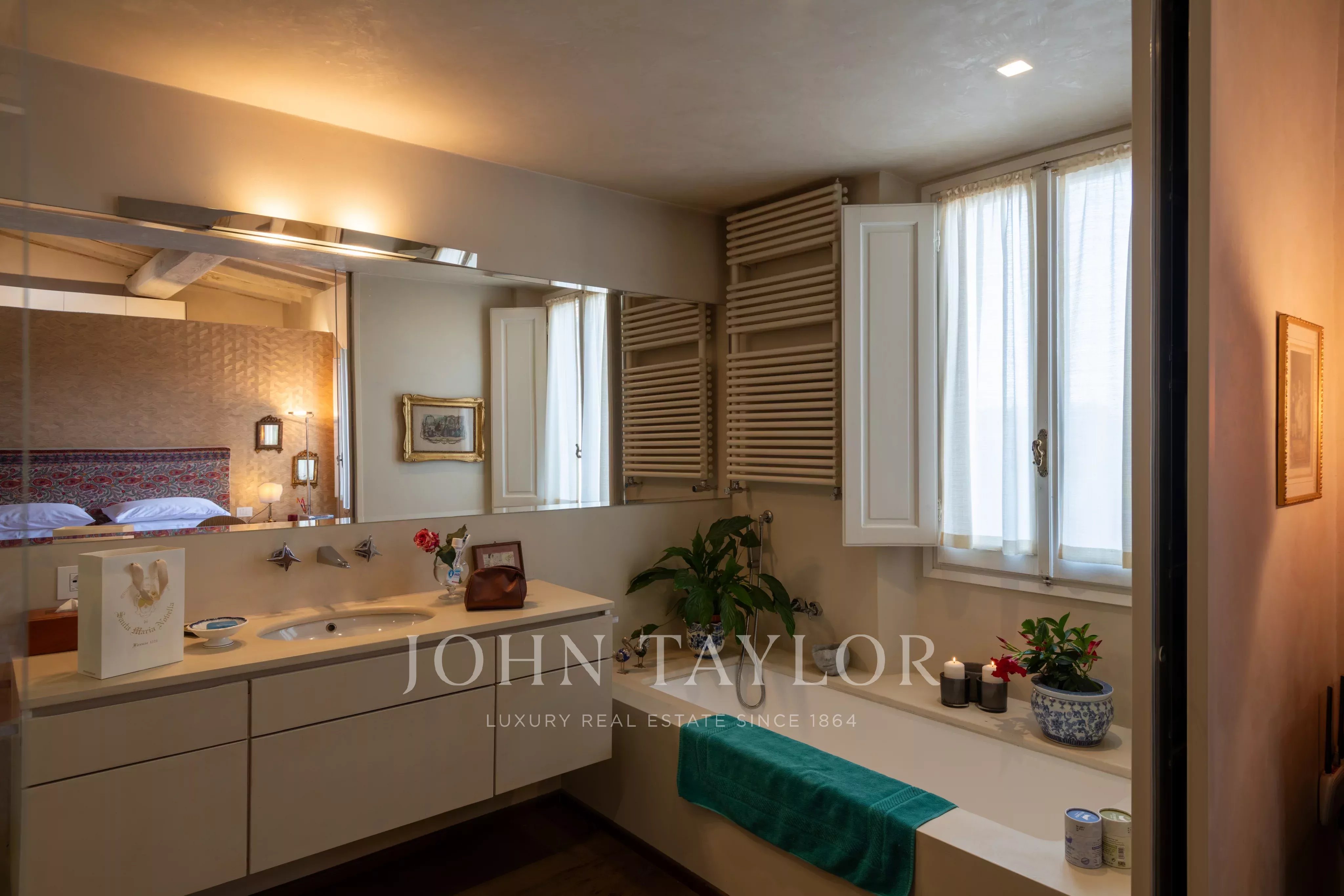 Sul livello principale si trova la camera padronale con letto matrimoniale king size (180x200) e bagno en suite dotato di vasca e doccia. Le finestre della zona notte e della sala da pranzo affacciano sul cortile interno, garantendo silenzio e privacy, mentre il soggiorno gode della vista sulla vivace piazza.
