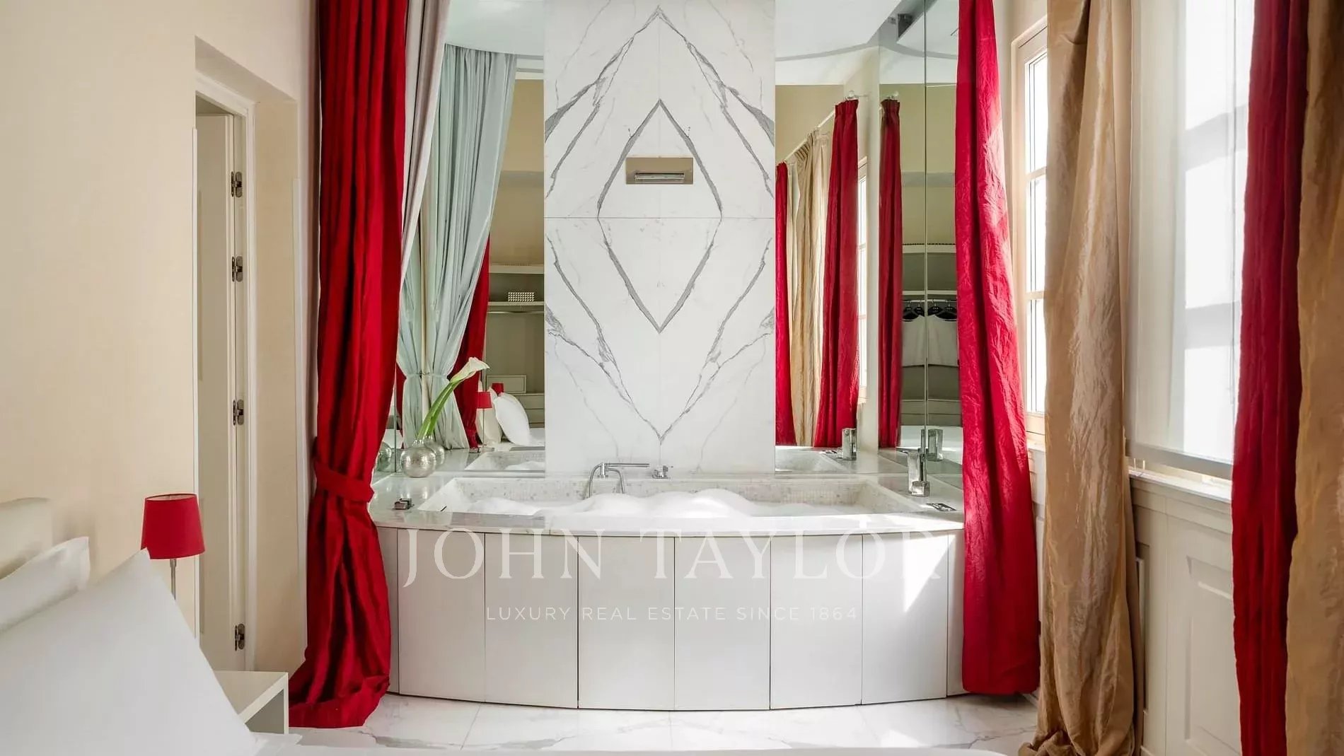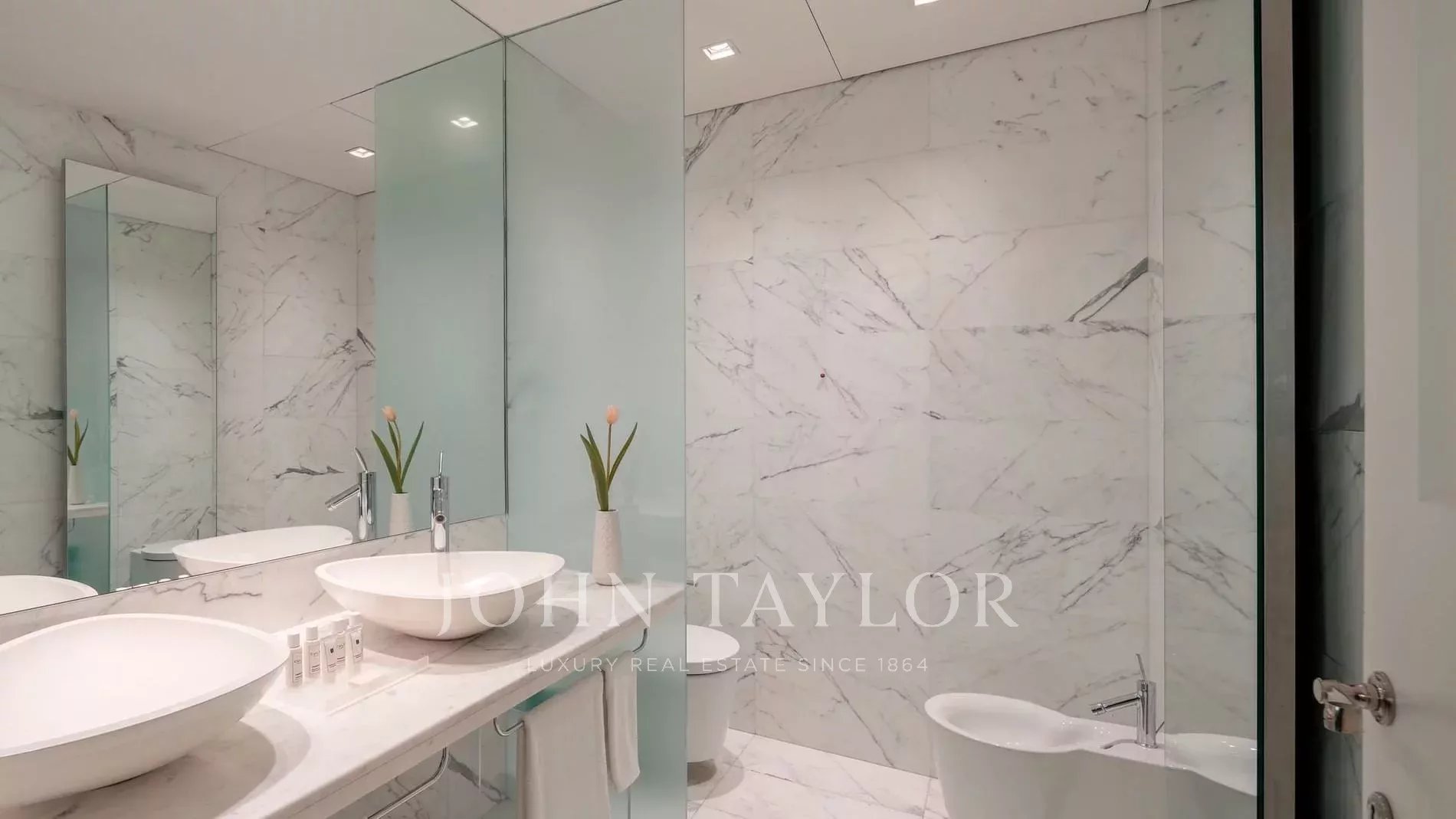 I due bagni in marmo bianco, uno en-suite con mini-jacuzzi e uno con doccia, includono un set di cortesia, accappatoio, asciugamani e asciugacapelli.