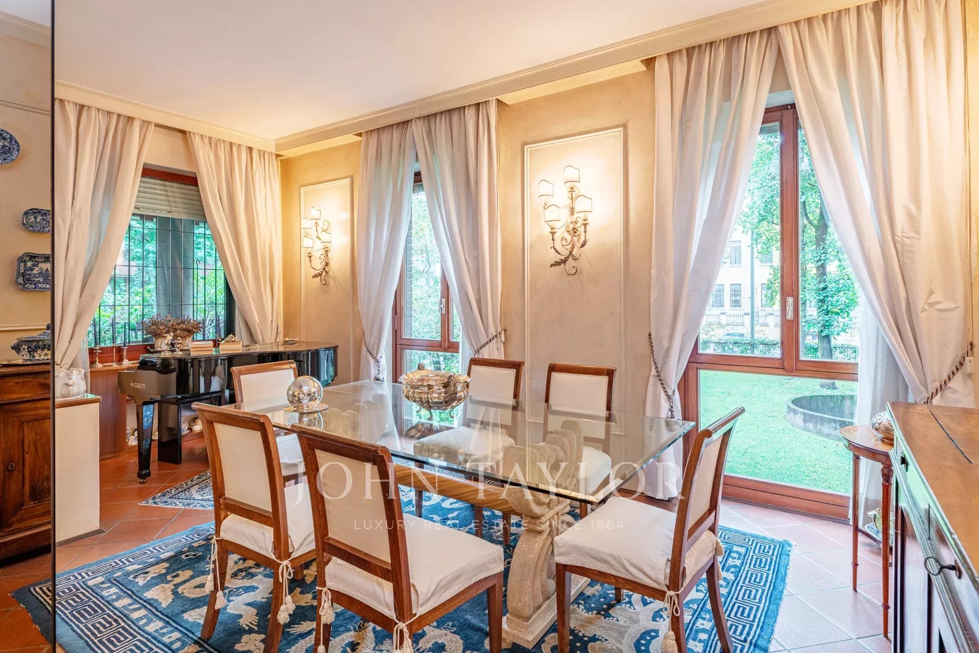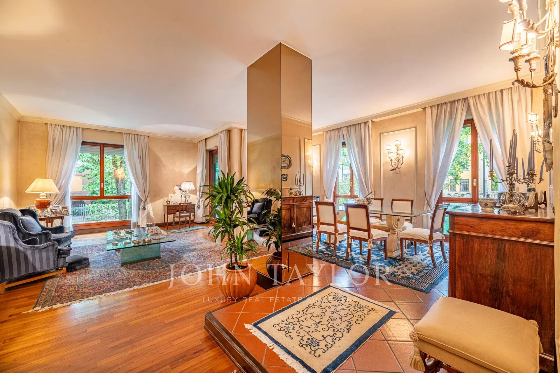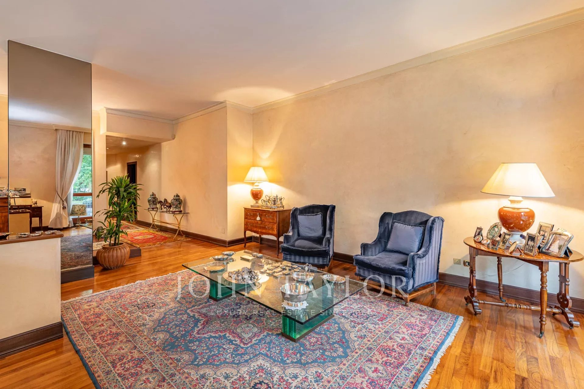 Elegant building from the 70s with all day concierge, wonderful condominium park, splendid 165 sqm apartment with terrace overlooking the garden consisting of entrance hall, large living room with dining area, eat-in kitchen with balcony, bathroom, 3 bedrooms and two bathrooms. Cellar. Possibility of garage. Quiet and bright. Class G
