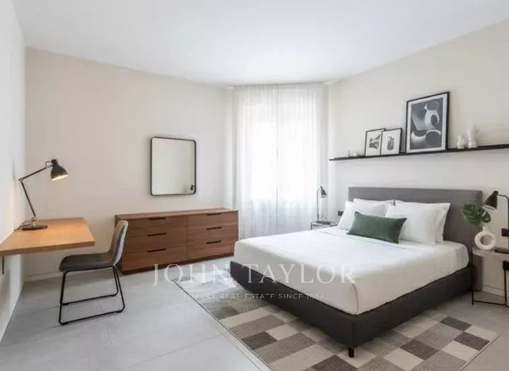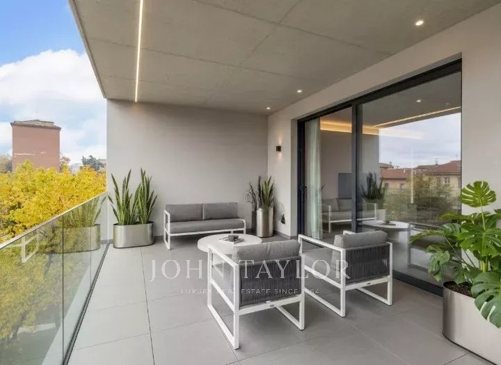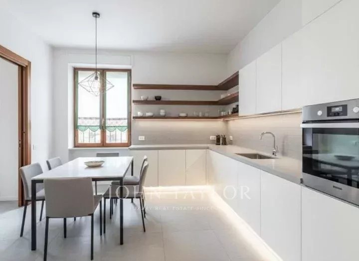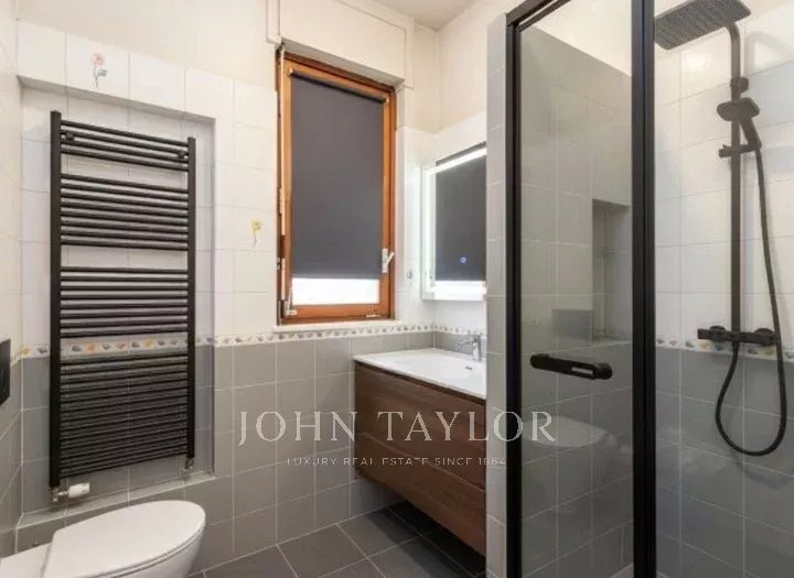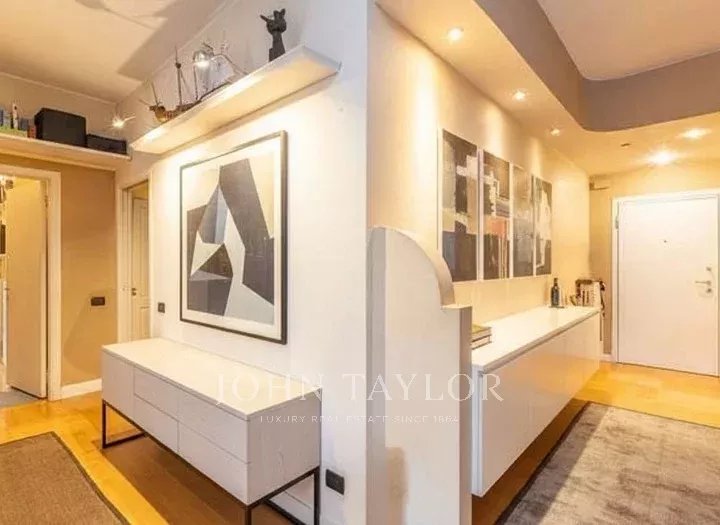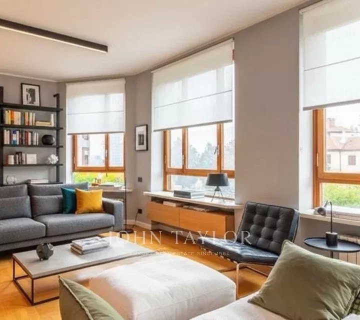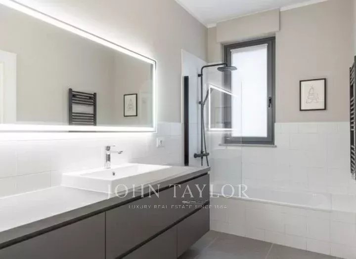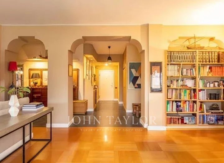 In an elegant, stately setting with a large communal garden and concierge service all day, high floor, bright and quiet apartment of great charm, approx. 200 sqm., excellently arranged, consisting of: large entrance hall, large eat-in kitchen, triple living room - dining room, four bedrooms, triple bathrooms. Two covered balconies. Cellar. Energy class G. The property is completed by a garage in the building with separate cost.
