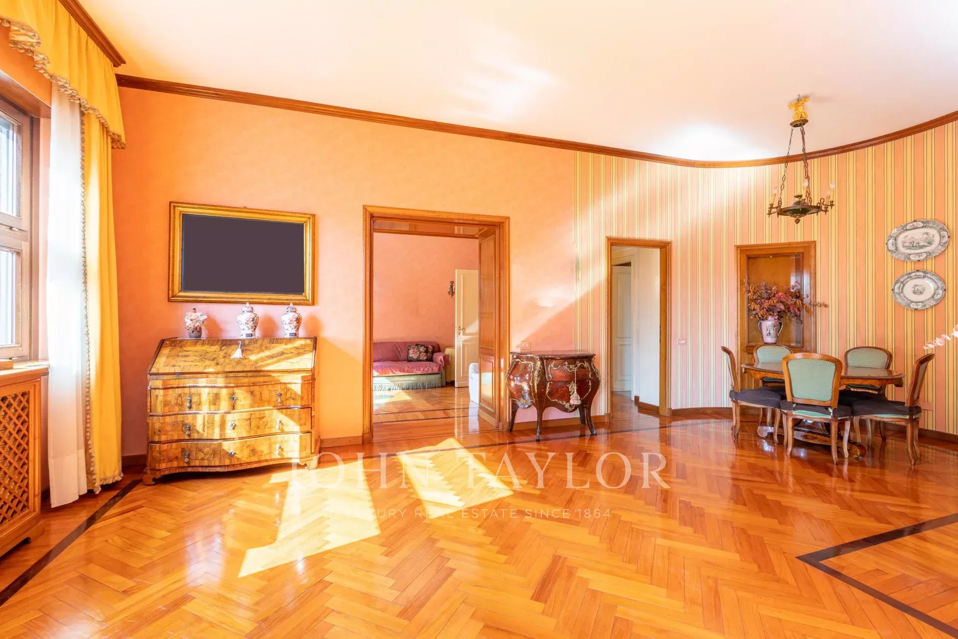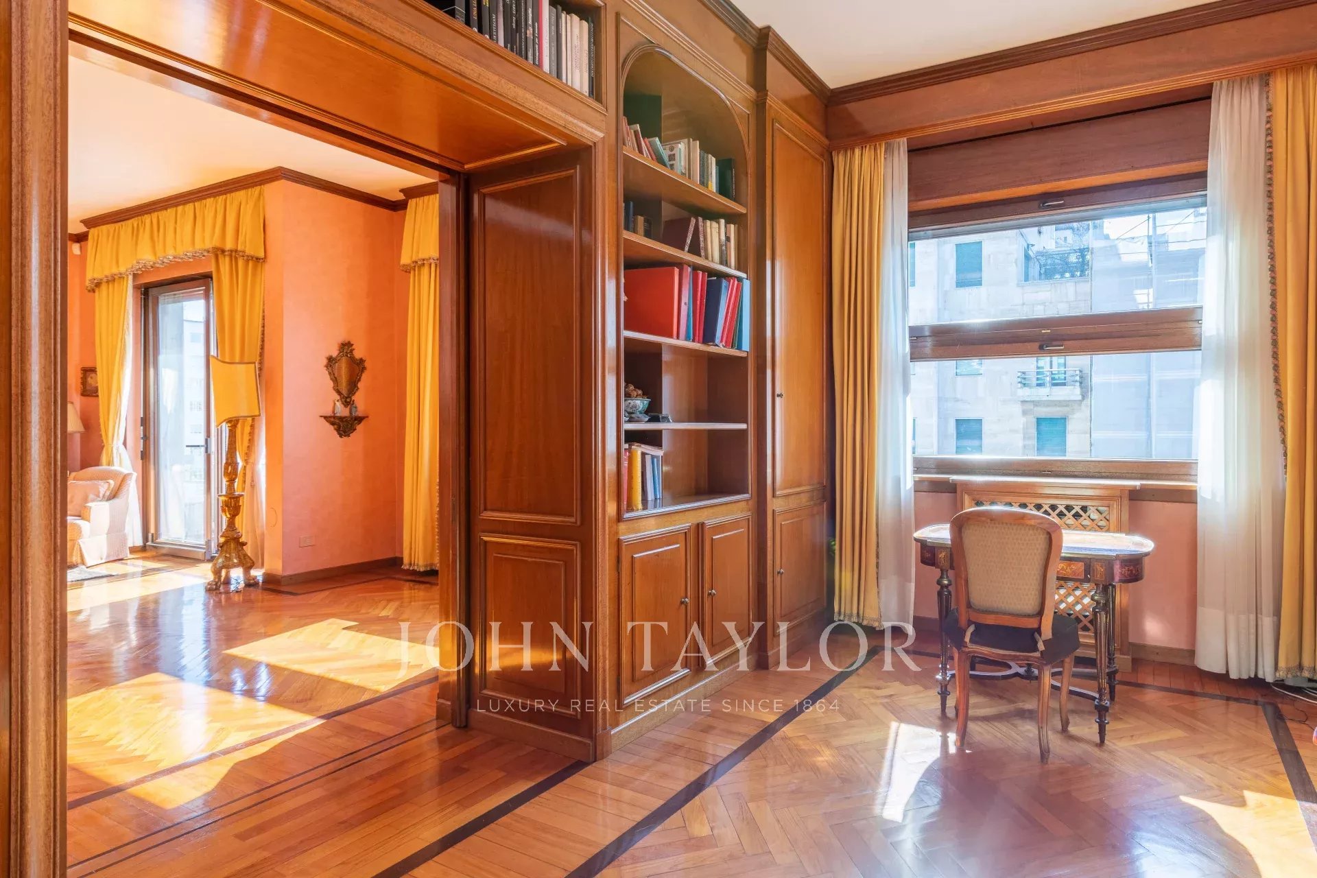 EXCLUSIVE TO JOHN TAYLOR, bright prestigious and elegant apartment, 170 sqm. approx. on the sixth floor of an elegant building with concierge and two lifts composed of a large entrance hall that opens onto the living room and dining room which leads to a large study in boiserie, parquet floors, spacious kitchen with laundry corner. The sleeping area consists of two double bedrooms with en-suite bathrooms and generous wardrobes. The property includes a cellar in the basement. Energy class G