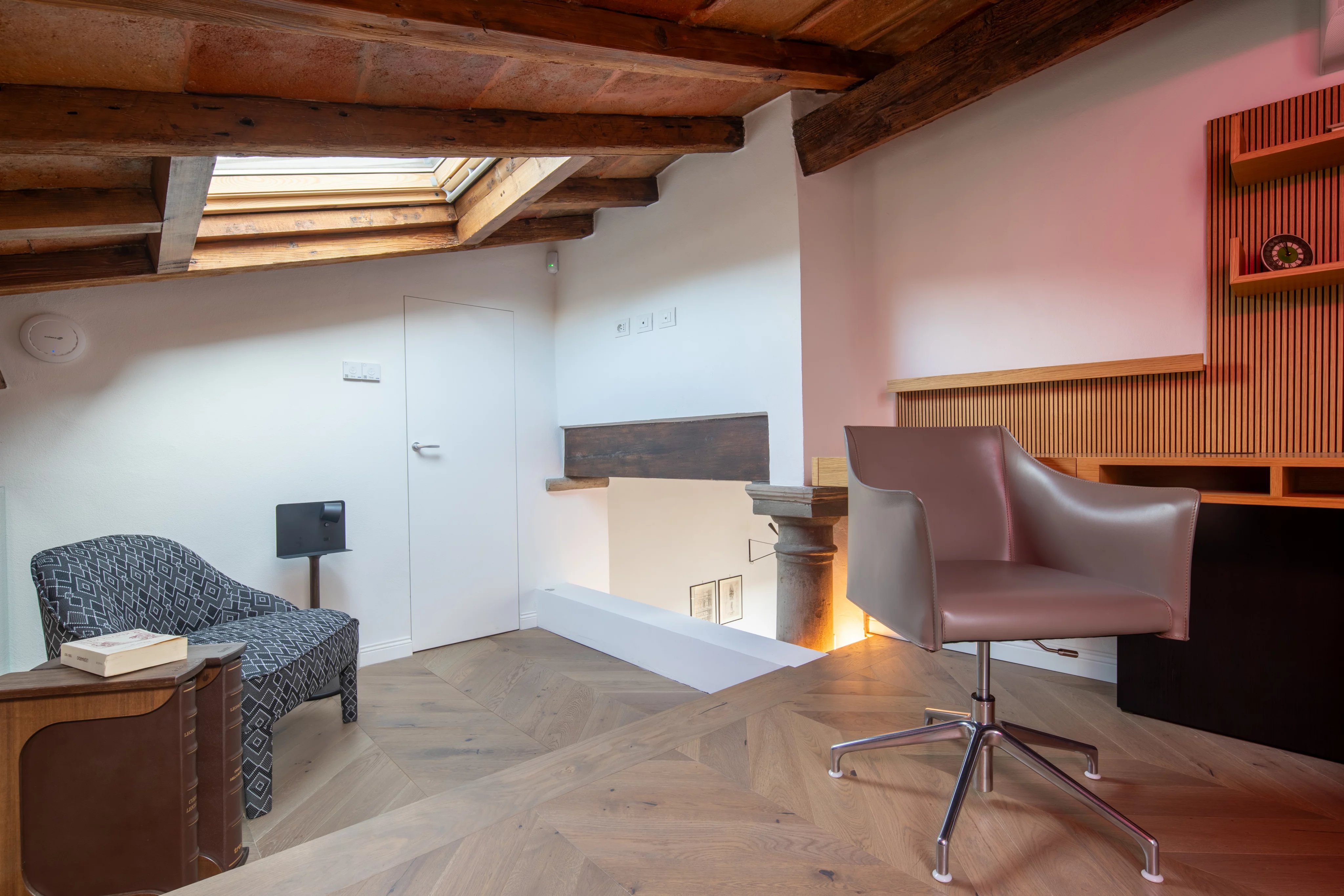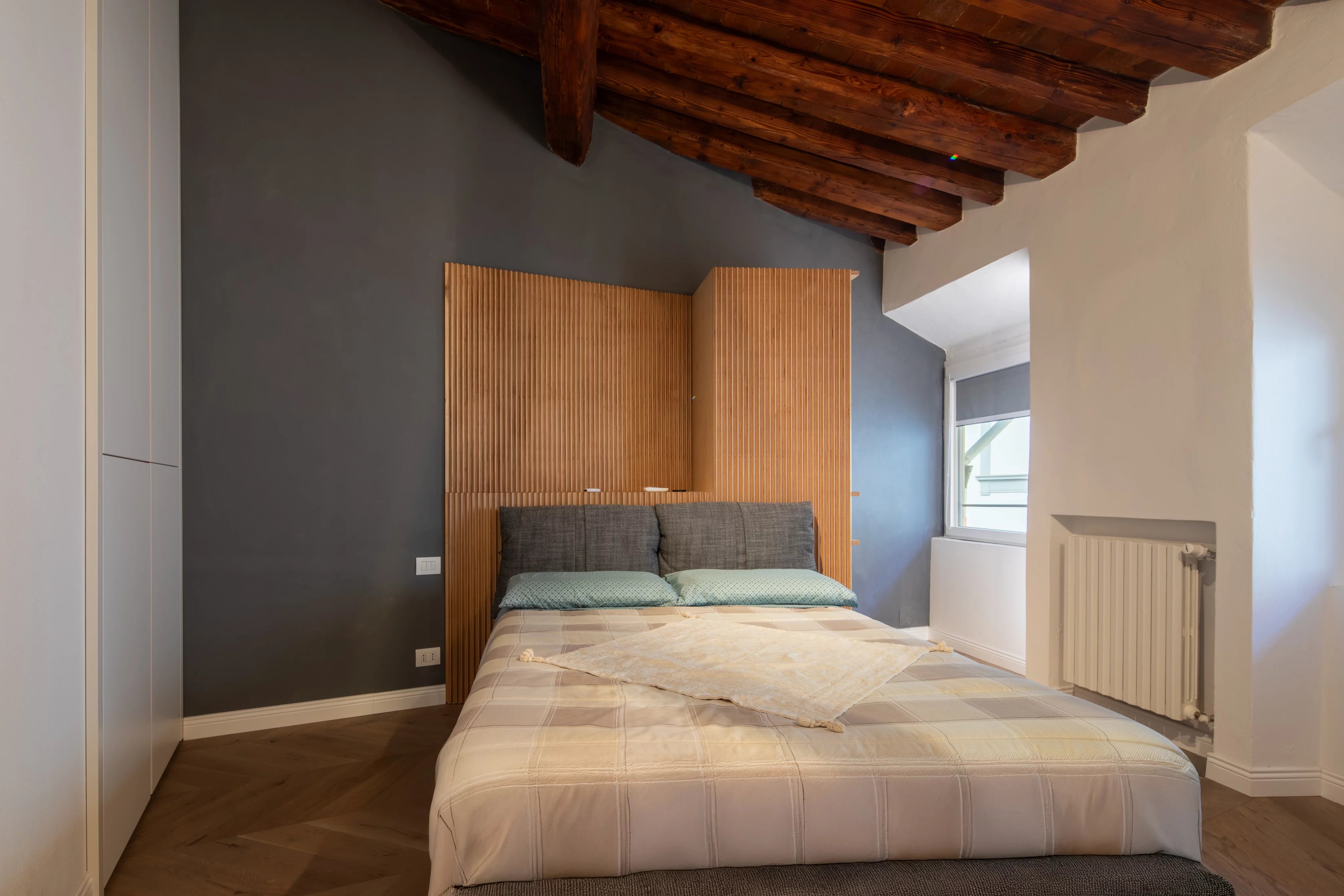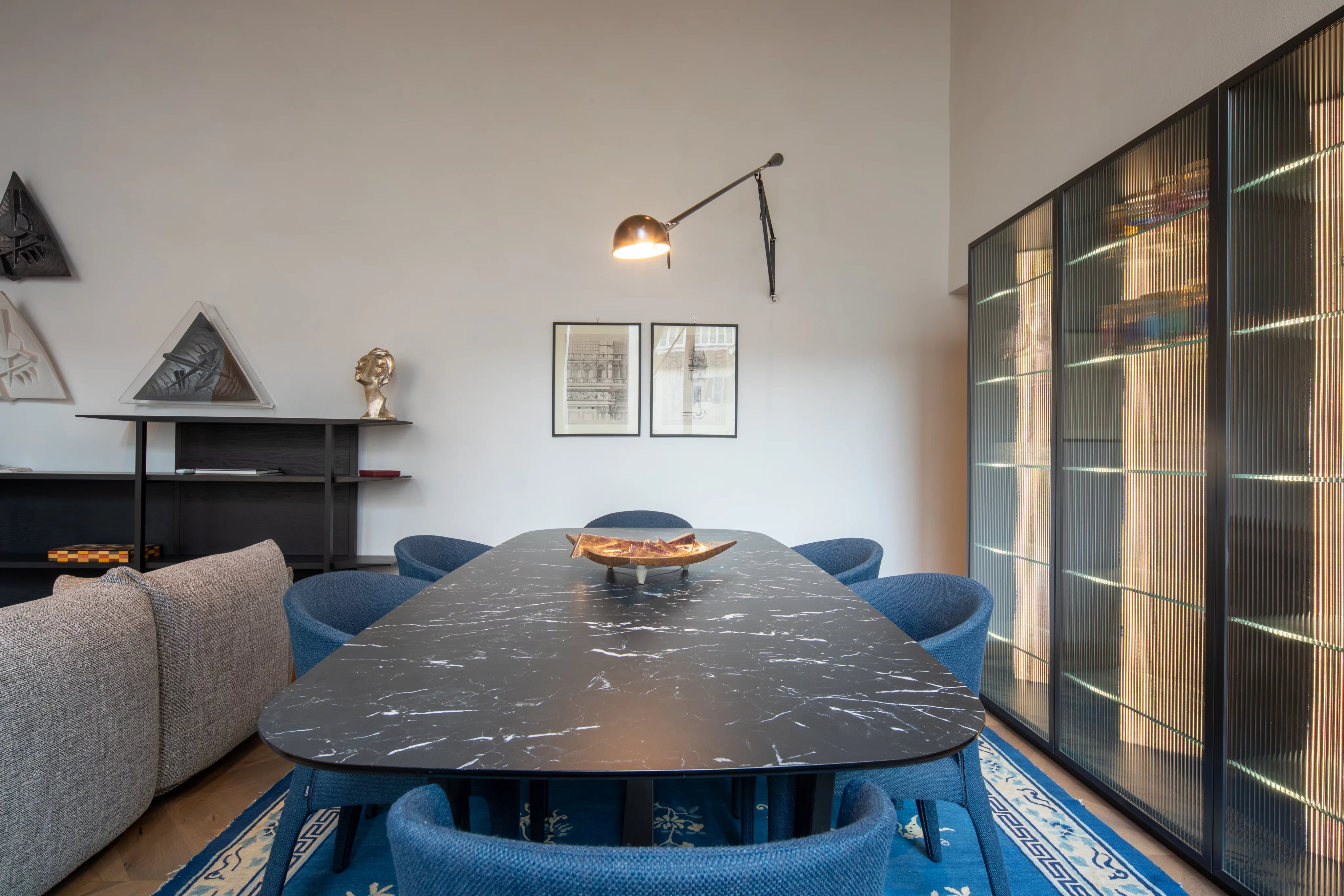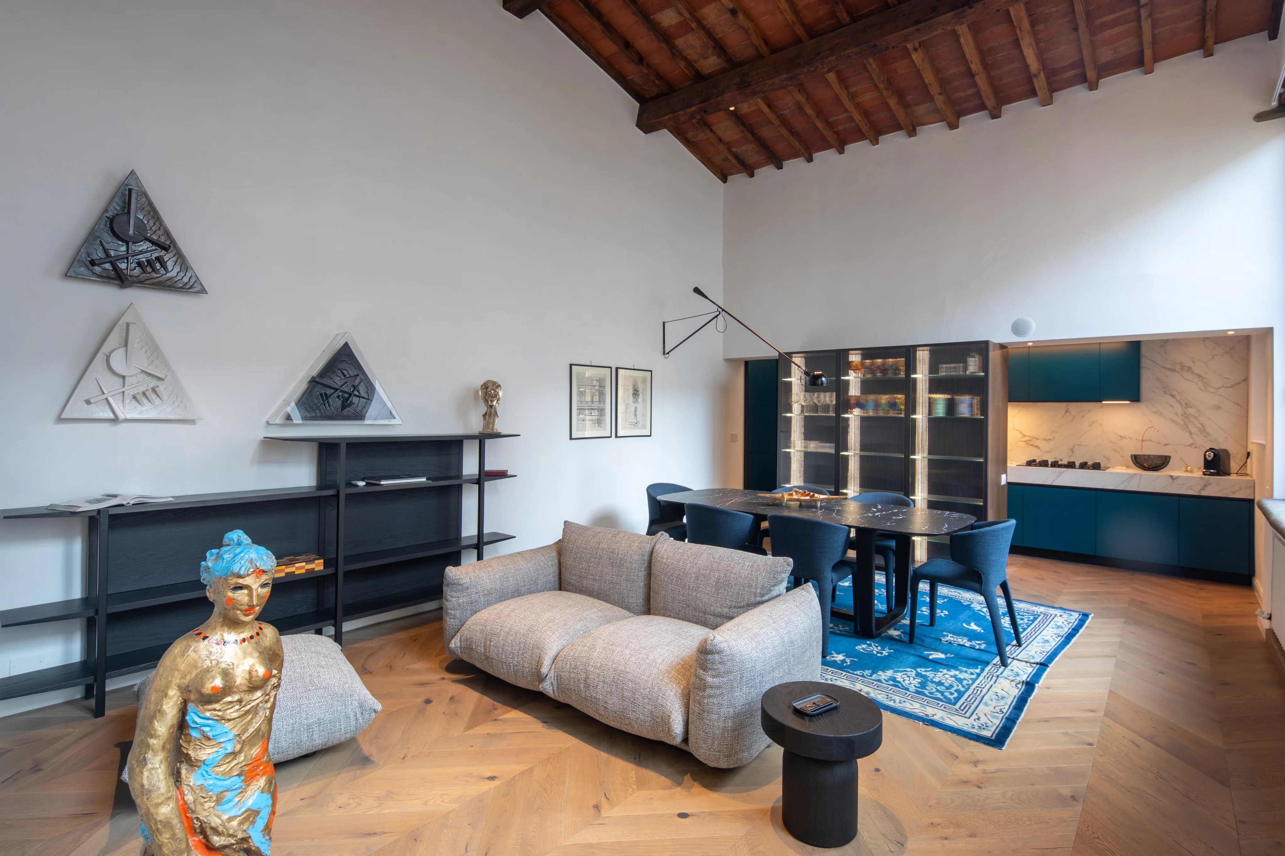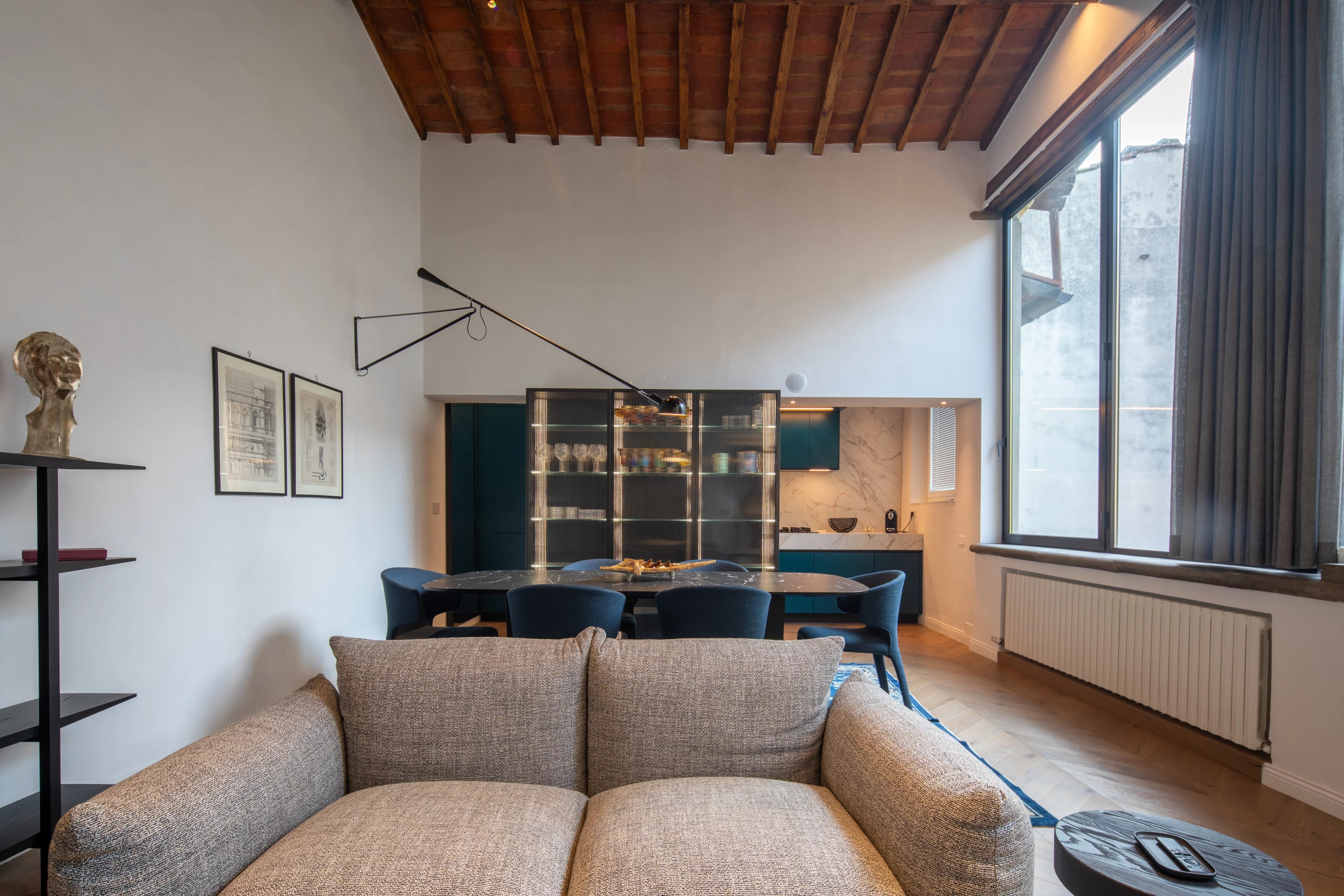 L'interno è composto da un'ampia zona living con cucina a vista, arricchita da dettagli di design che conferiscono carattere all'ambiente. Le due camere da letto sono spaziose e luminose, ideali per chi cerca tranquillità nel cuore pulsante della città. Il pavimento in legno a spina di pesce aggiunge un tocco di raffinatezza a tutto l'appartamento.