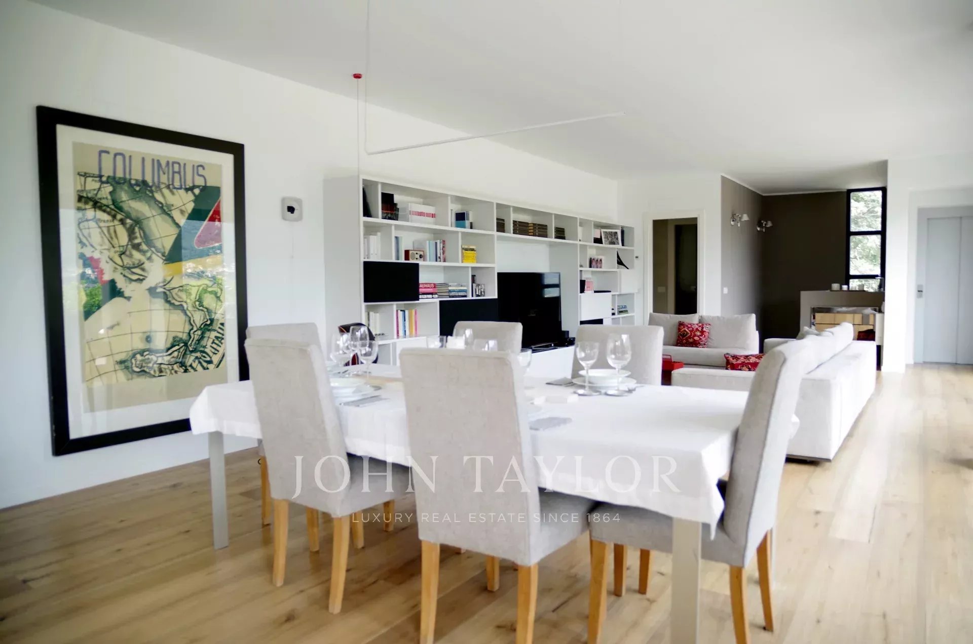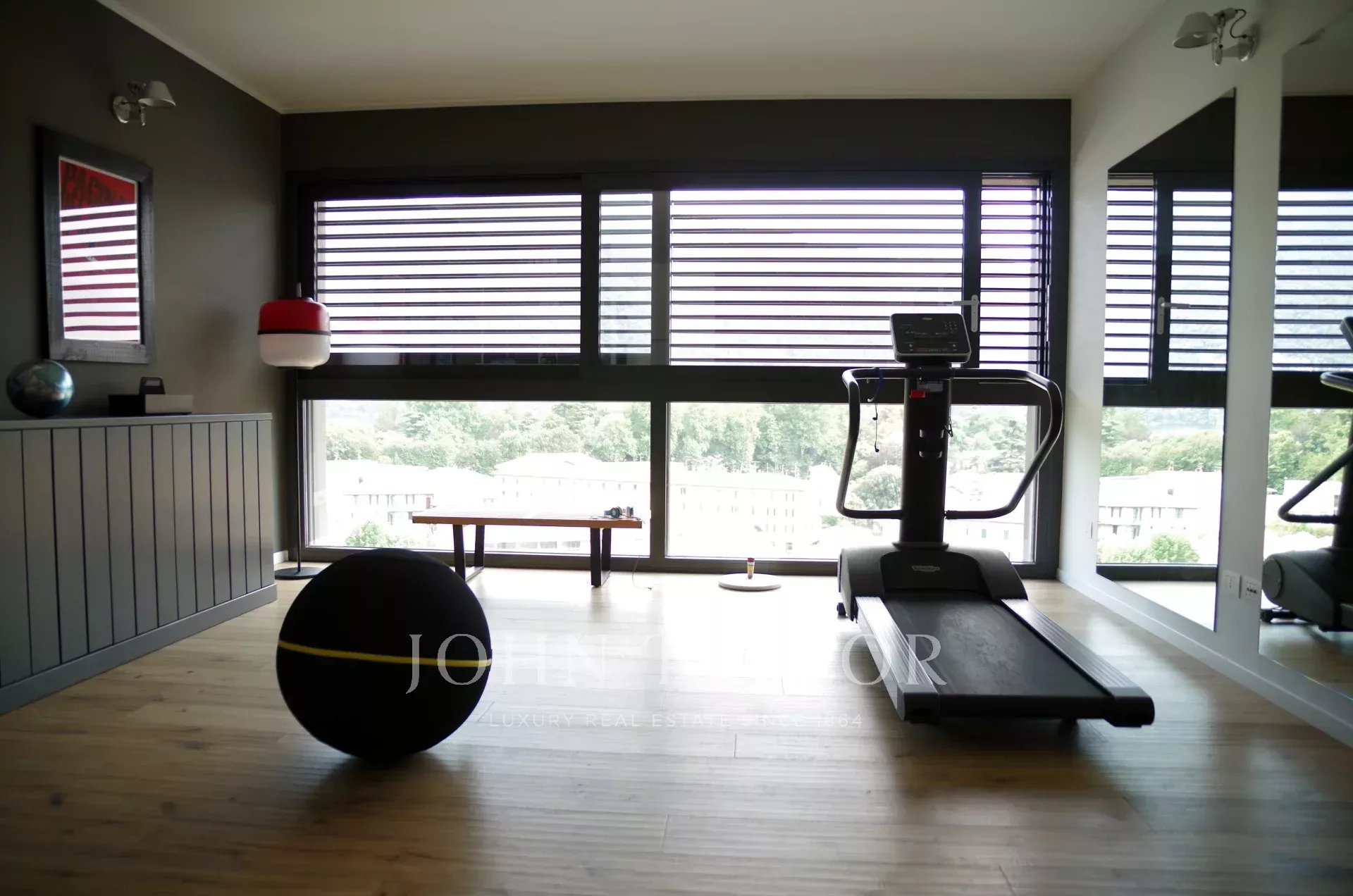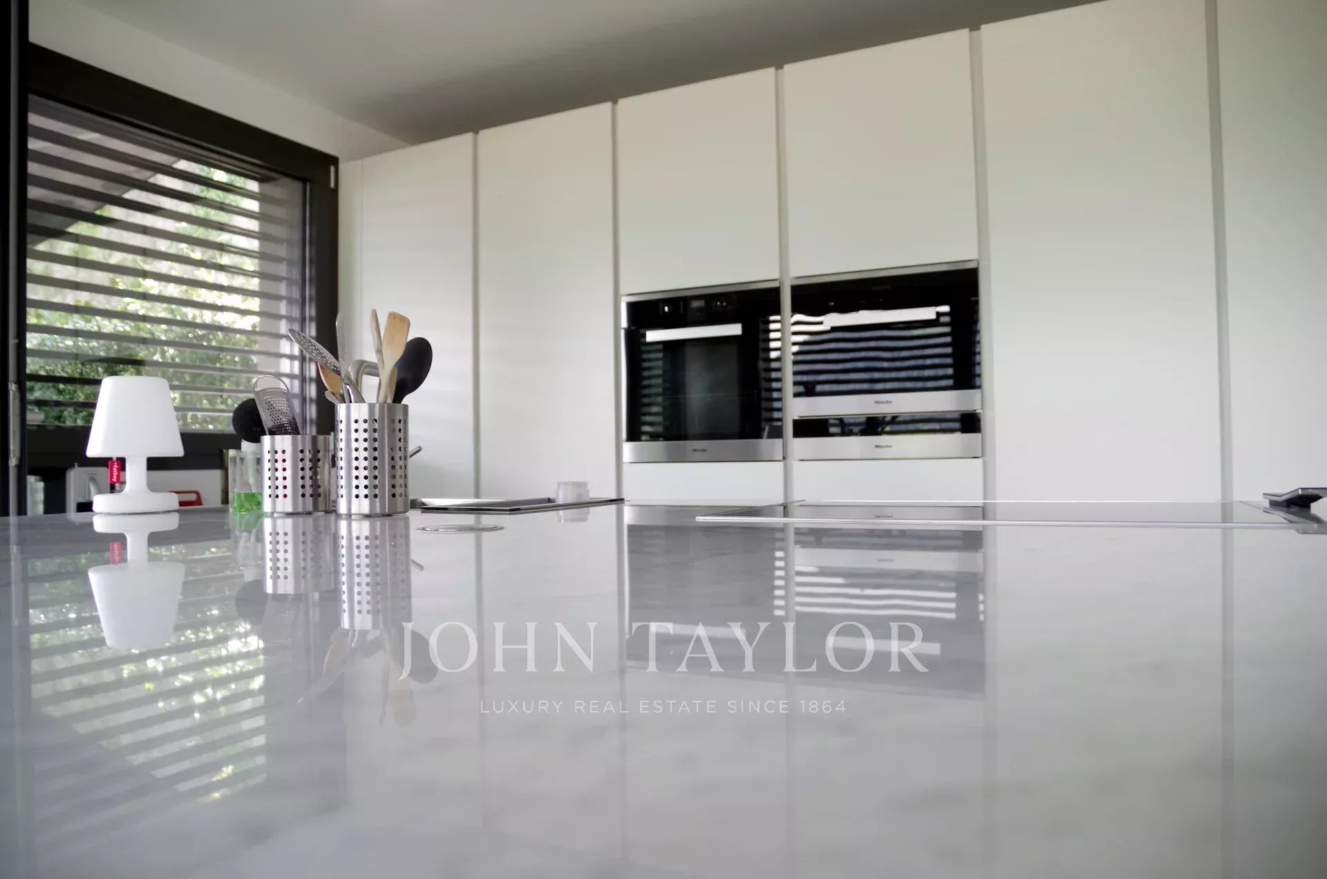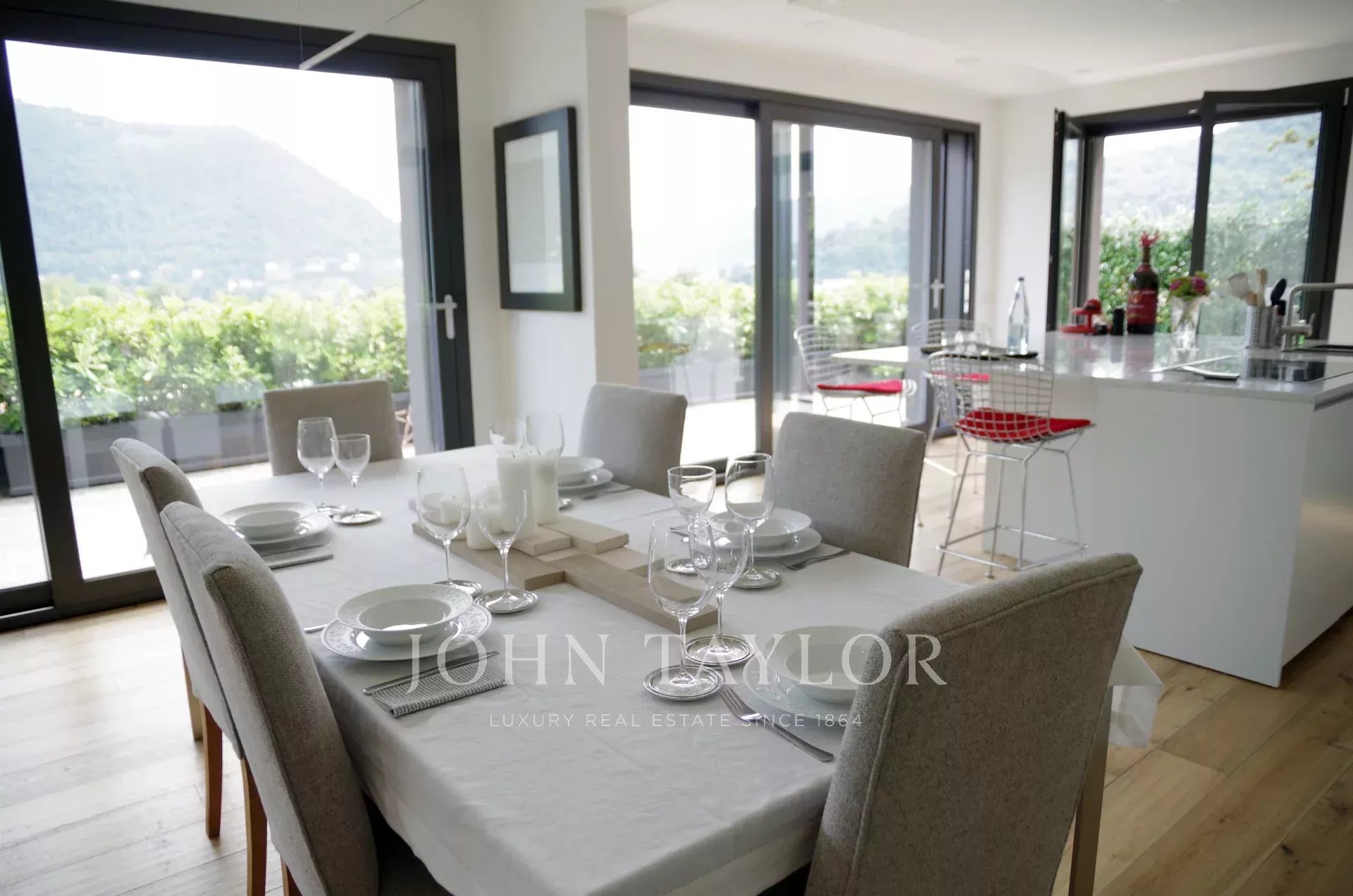 Set in a dominant, private, and strategic position, this contemporary villa represents a true statement of style: an architecture that converses with the landscape and transforms it into a daily experience. From one of the most panoramic areas of the first basin of Lake Como, the view opens into a dramatic 180-degree embrace, free of obstacles and disturbances, flooding every space with light and tranquility. A horizon that changes with the seasons yet never loses its majestic beauty. The splendid property is conveniently served by an internal elevator. The heart of the villa is a spacious open-plan living area of approx. 65 sqm, where the living room and custom-designed kitchen, crafted down to the smallest detail, blend into a spectacular, bright, and welcoming space. The large windows open onto an 80 sqm panoramic terrace: a natural extension of the living area, perfect for relaxing breakfasts, sunset aperitifs, or dinners under the stars, with the lake as the only soundtrack. The sleeping area is conceived as a retreat of elegance and well-being. The master bedroom unfolds along a private area composed of a hallway, walk-in closet, large, windowed bathroom, and a spacious 18 sqm bedroom overlooking the view. A second double bedroom, also 18 sqm and equally bright, shares a balcony of about 12 sqm. The floor is completed by a second bathroom and a private 45 sqm gym: an exclusive space to regenerate without ever leaving the comfort of home. On the second floor, an independent apartment with a separate entrance offers the ideal solution for guests, staff, or as a ready-to-use investment. It features a living room with kitchen, double bedroom, bathroom, and porch: a reserved, versatile space ready to be adapted to different needs. The surrounding land, approximately 900 sqm, is fully landscaped and includes two covered parking spaces and five additional outdoor ones, offering complete functionality without sacrificing elegance. Its strategic location ensures convenient connections to Milan City, Switzerland, and Milan Malpensa International Airport, making this villa perfect both as a primary residence and as an exclusive second home. A property designed for those who recognize the true value of rare things. For those seeking luxury—modern, yet never ostentatious.