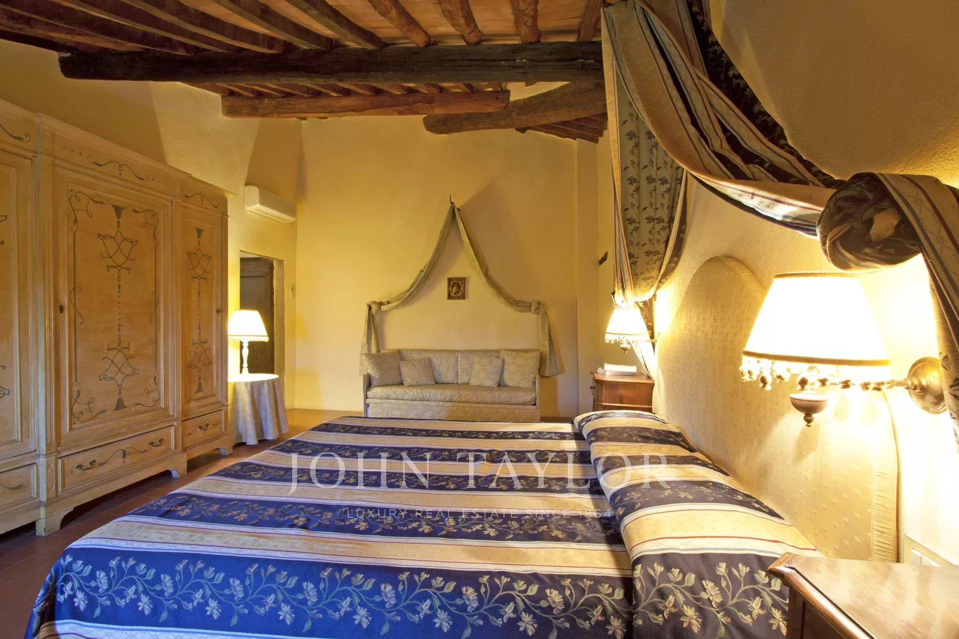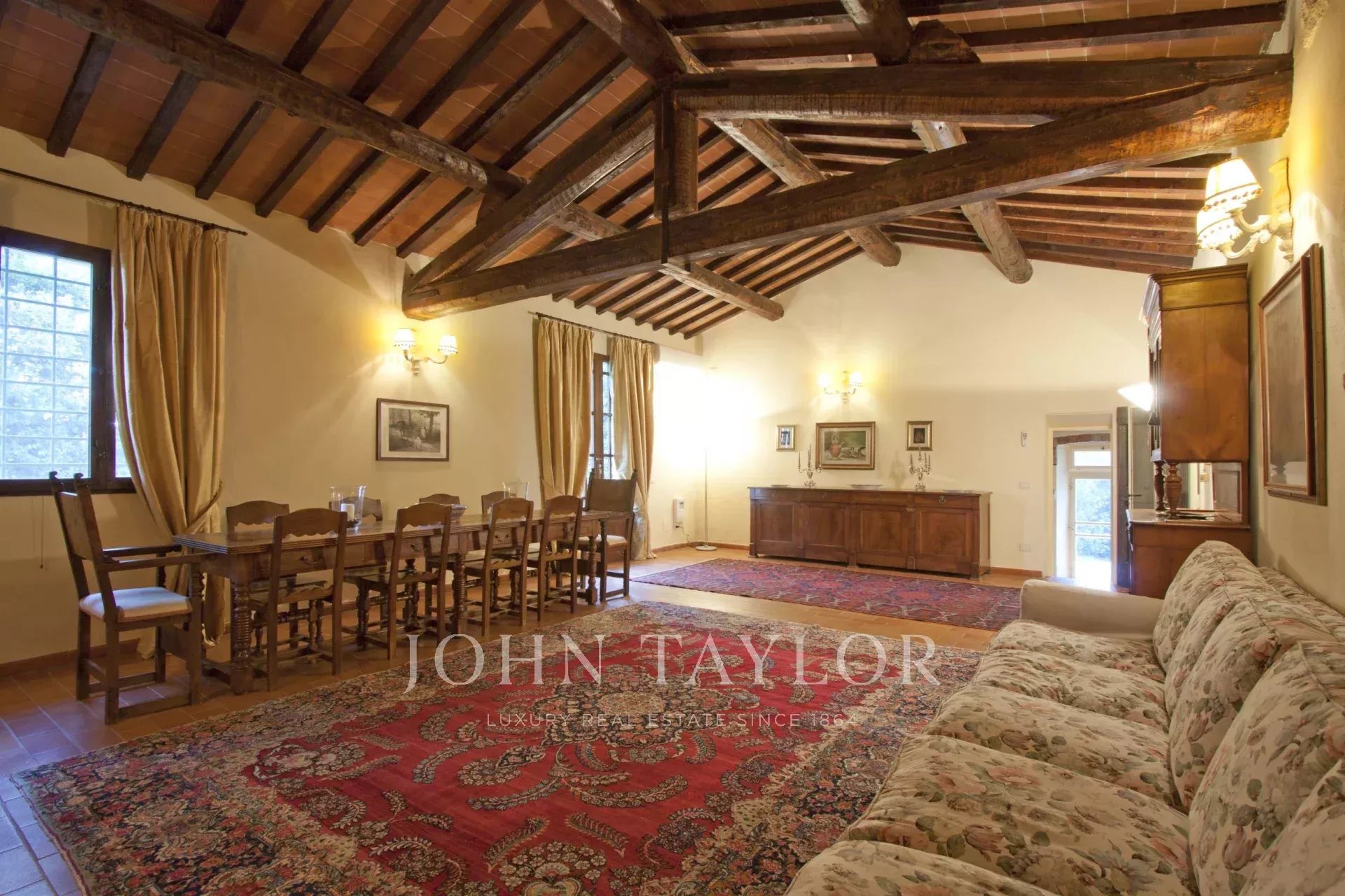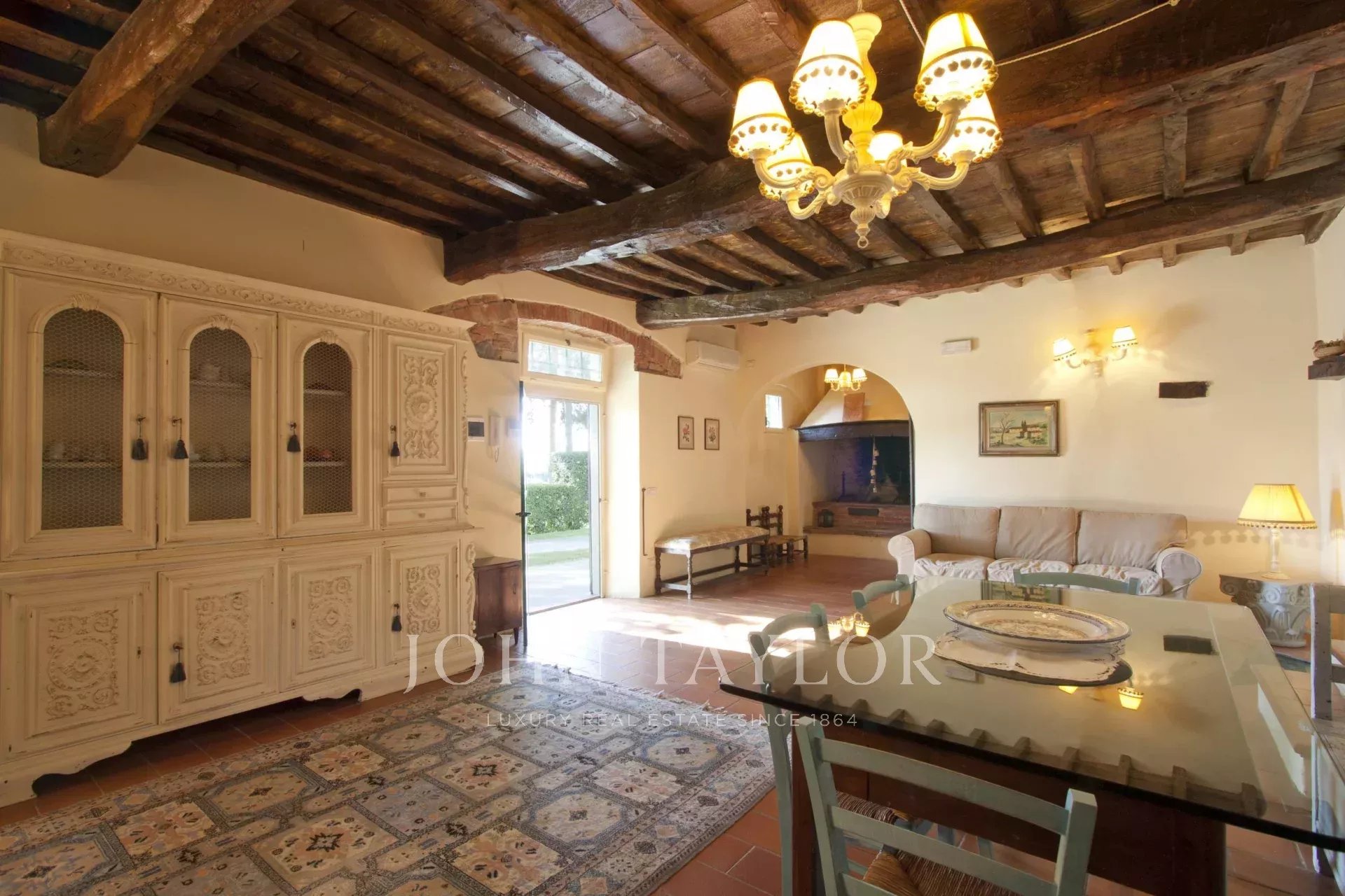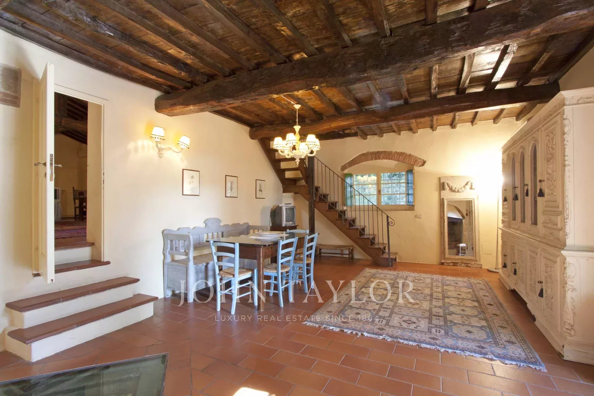 La proprietà di circa 250 mq si sviluppa su due livelli: al piano terra, due cucine, due salotti con camini, una spaziosa sala di rappresentanza con un imponente camino, e due camere da letto, oltre ai servizi. Salendo al primo piano nella troviamo due ampie camere da letto e due bagni.
