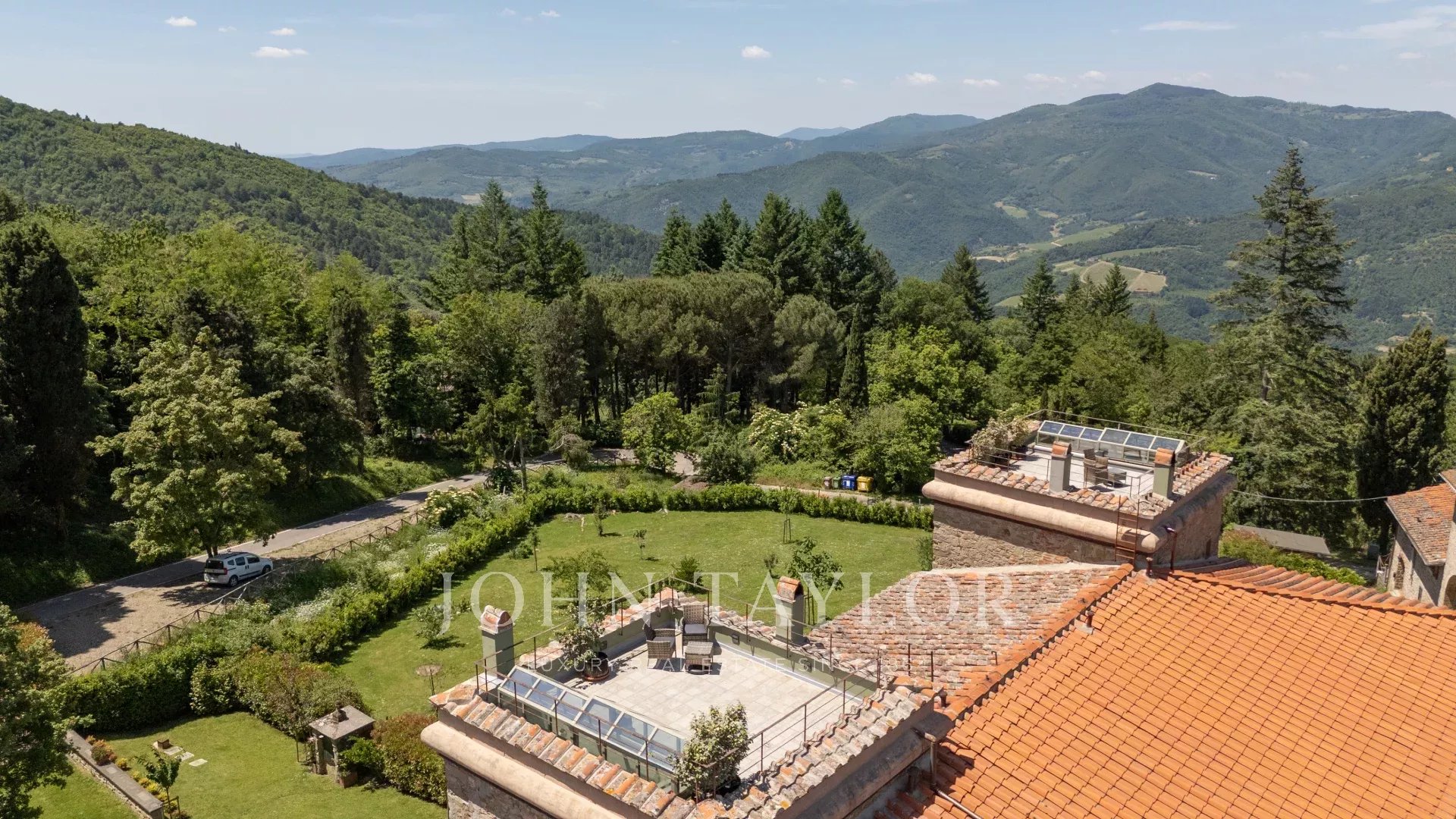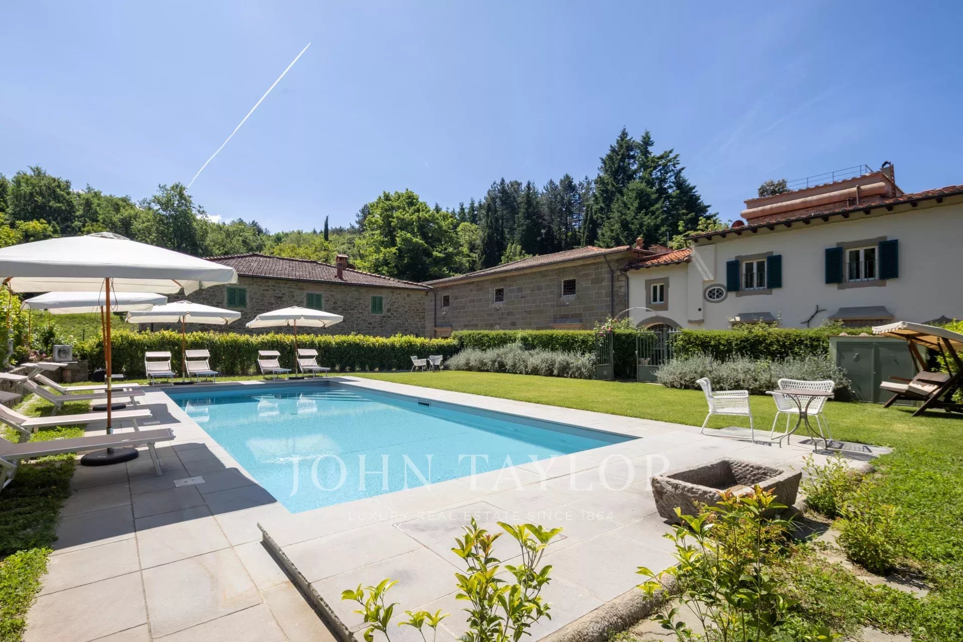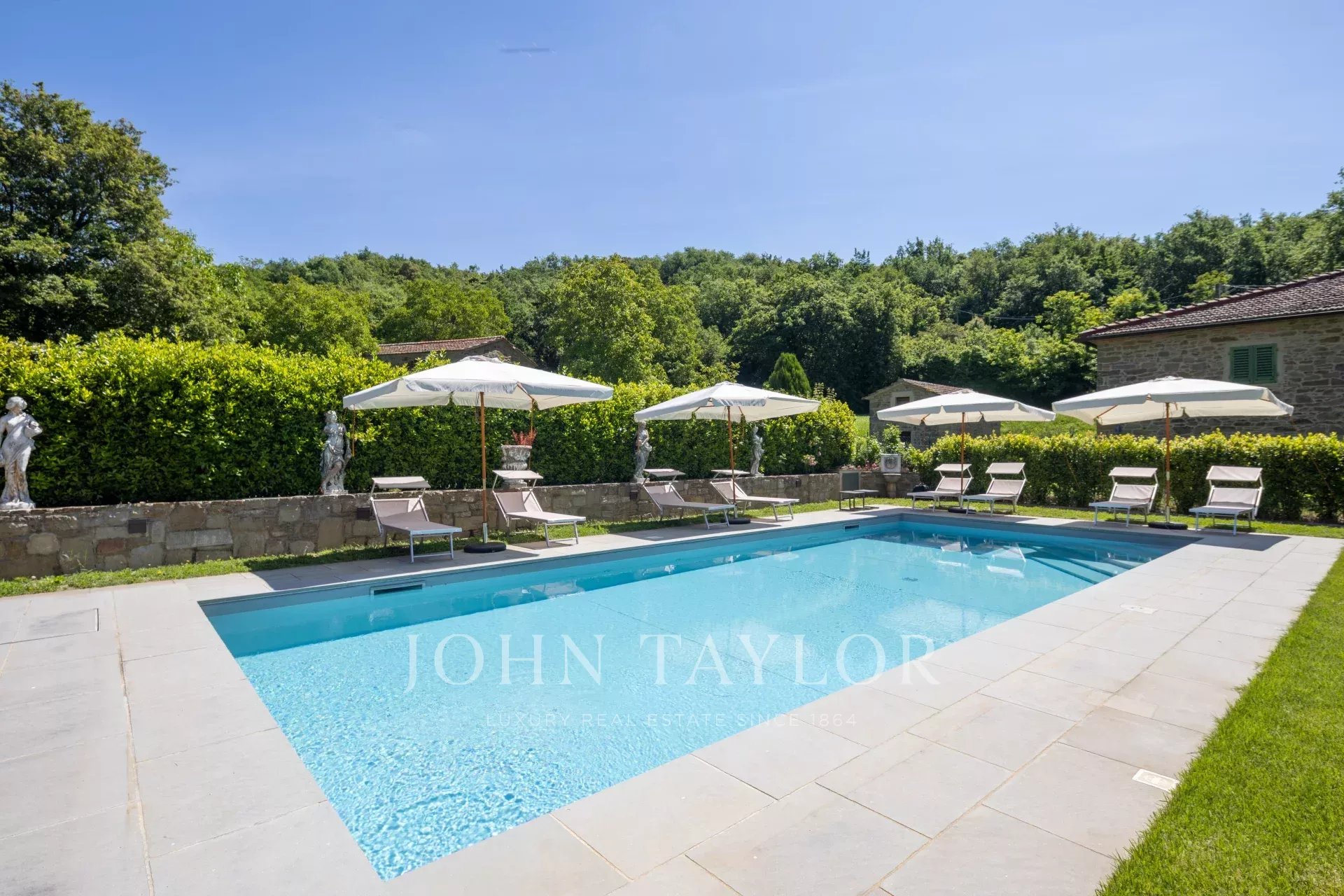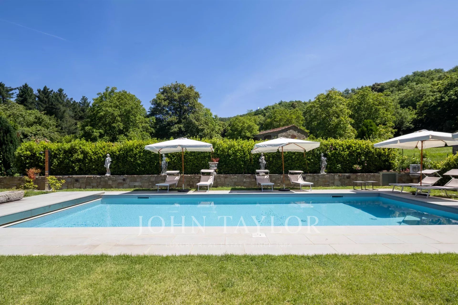 All’esterno, la villa è circondata da giardini privati, uliveti e terreni immersi nella natura, con una piscina privata che offre momenti di puro relax con vista mozzafiato sul paesaggio toscano.
