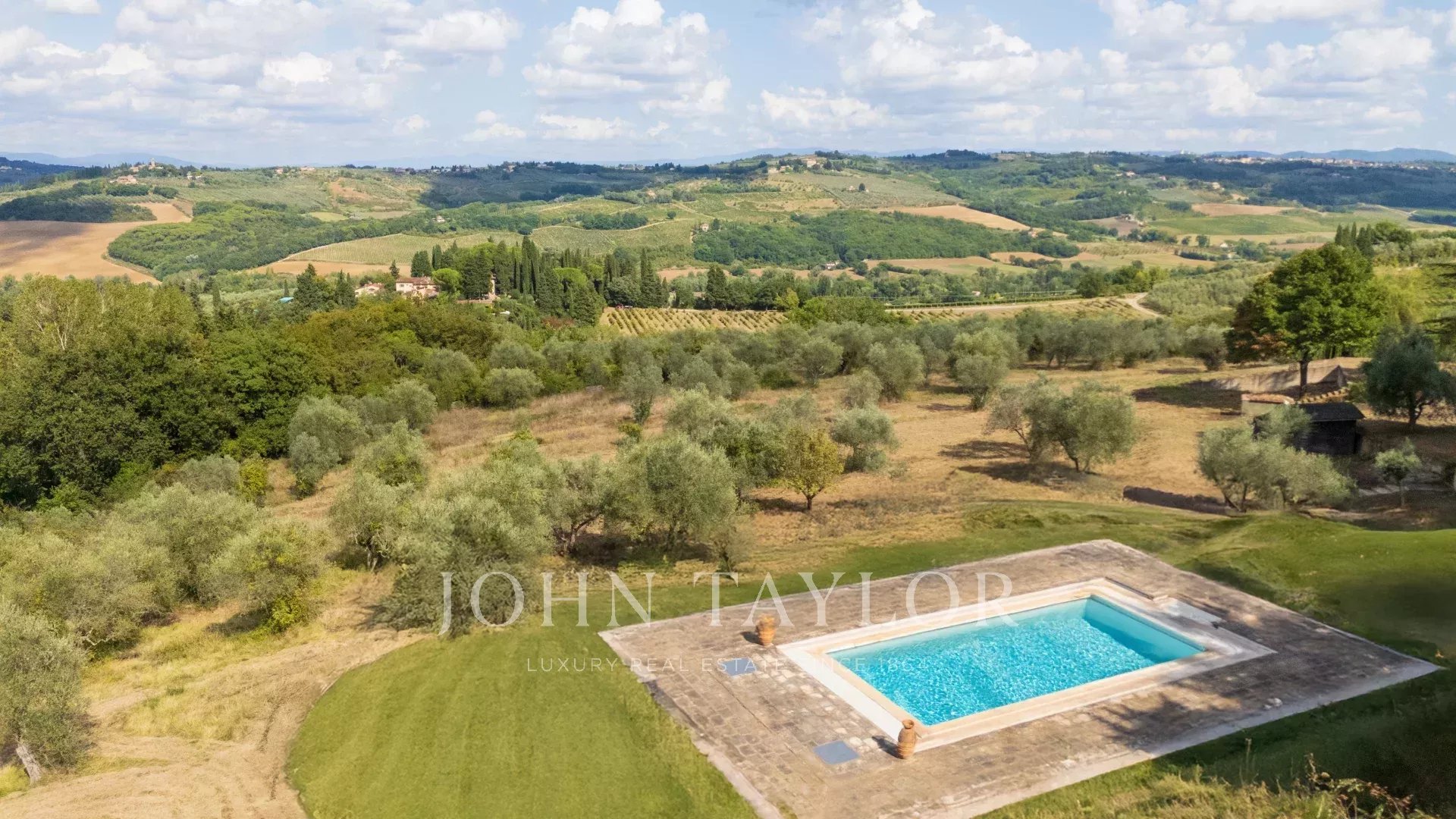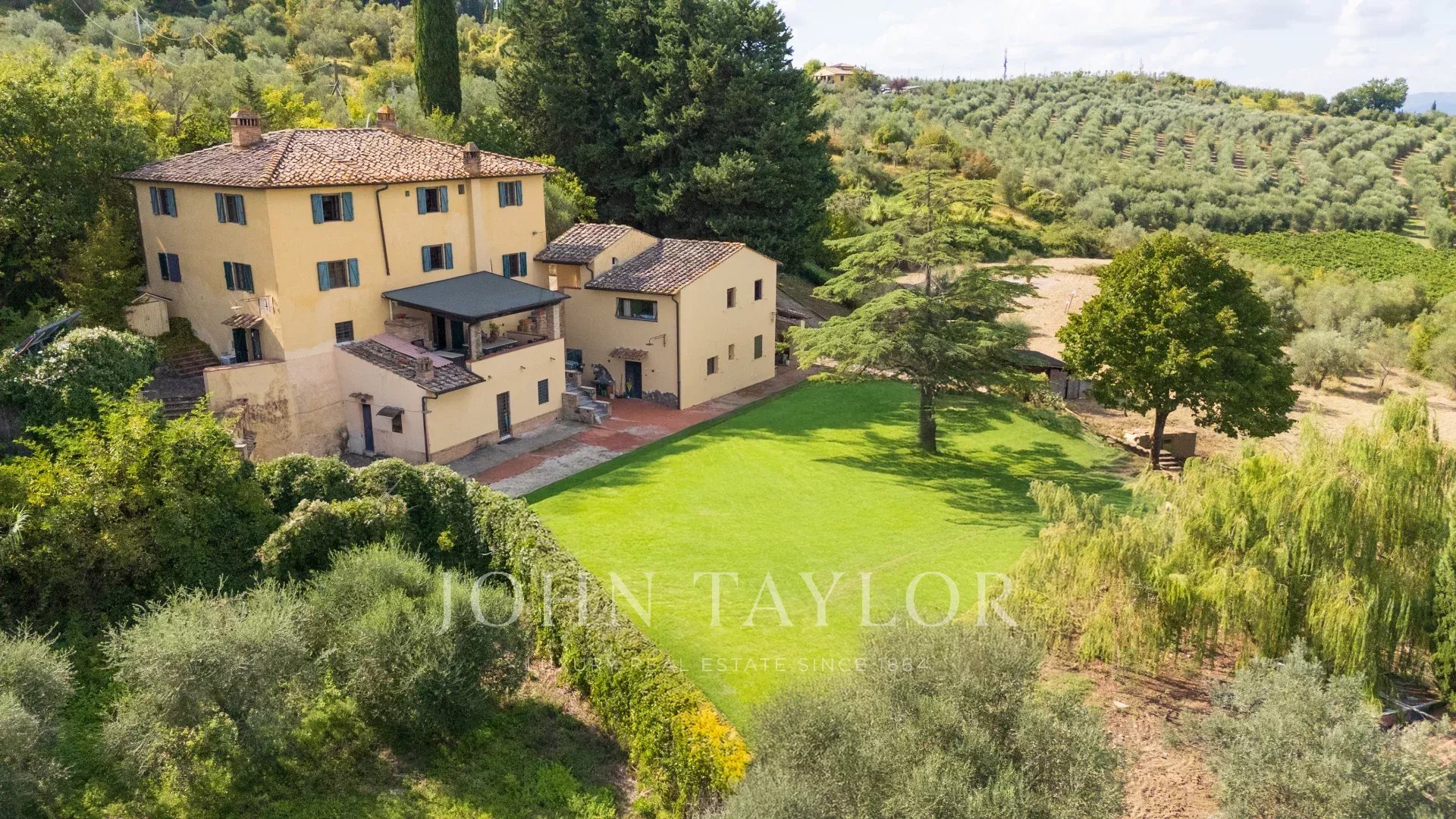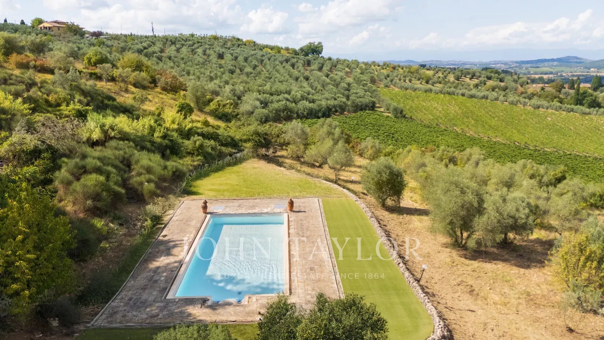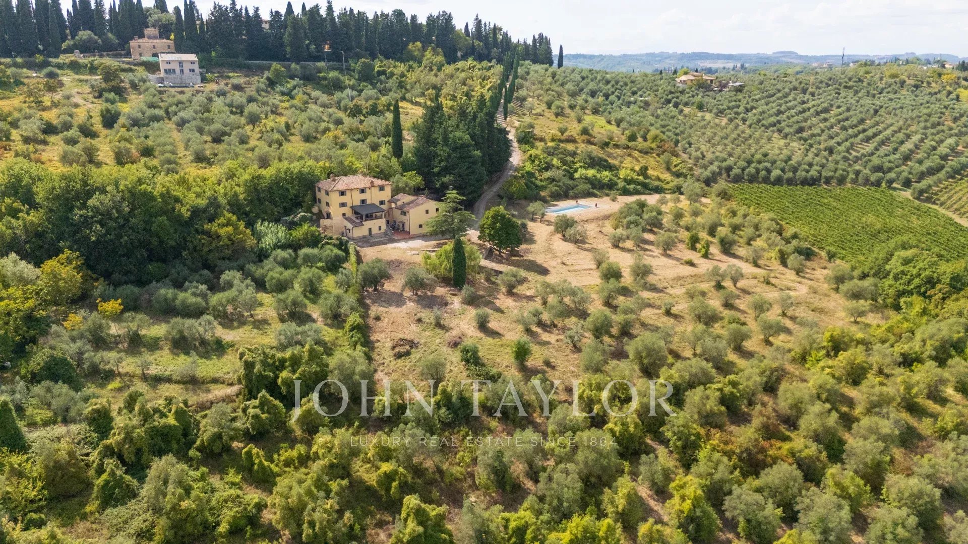 Il complesso è circondato da ampi giardini con piscina privata e da terreni per oltre 6,6 ettari coltivati a uliveto e seminativo arborato, ideali per hobby agricoli o produzione propria di olio.