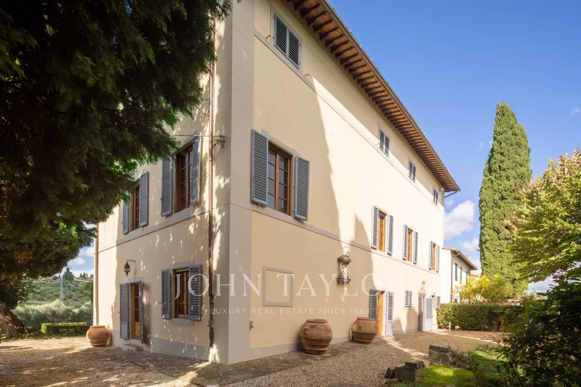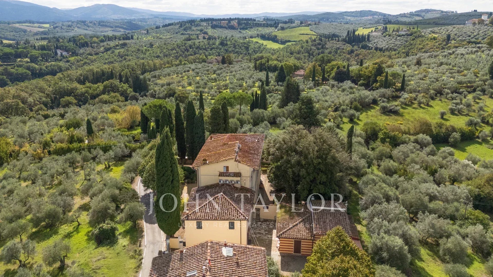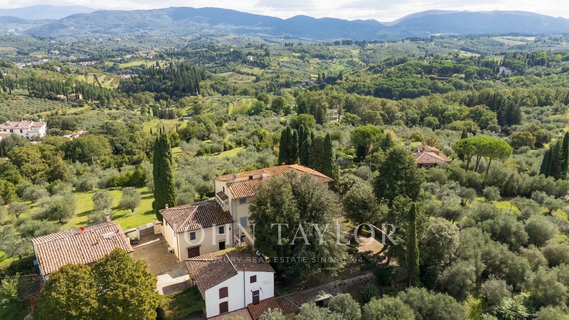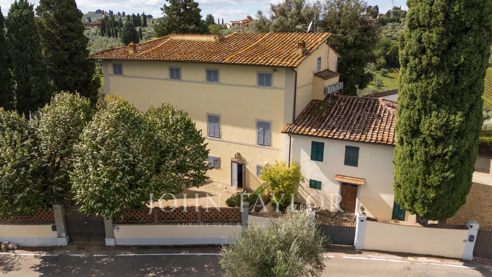 A soli 12 km dal centro di Firenze, immersa nelle dolci colline toscane, questa prestigiosa tenuta si estende su 3,5 ettari di uliveti privati e comprende una villa storica principale e due abitazioni indipendenti, perfettamente armonizzate con il paesaggio circostante.