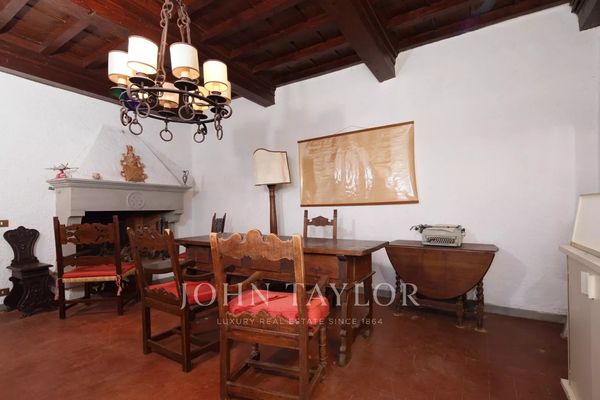 Al piano terra si aprono ampie stanze, tra cui un grande salone con affaccio sulla corte interna, due accoglienti sale con camino, uno studio e vari locali di servizio.