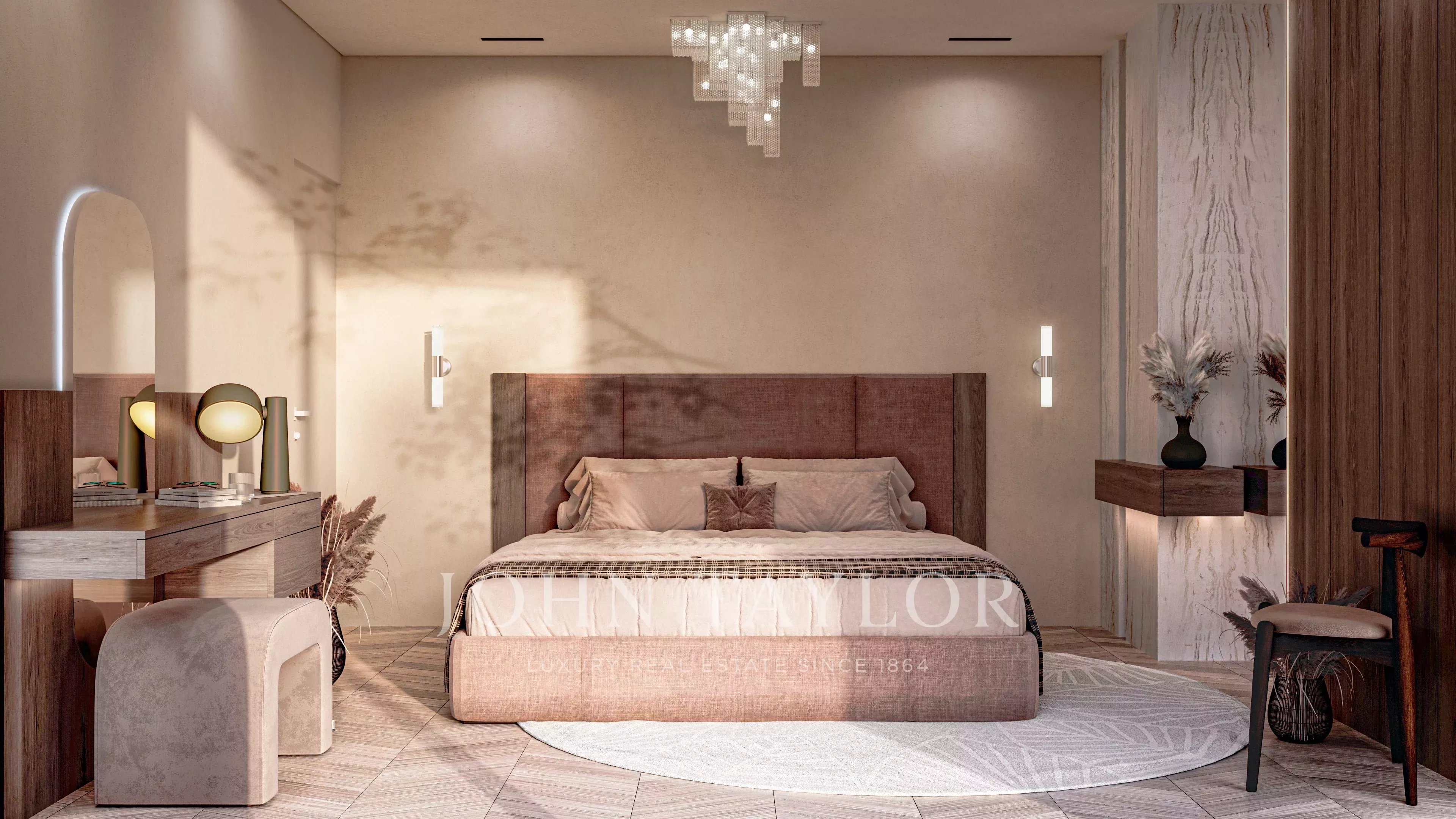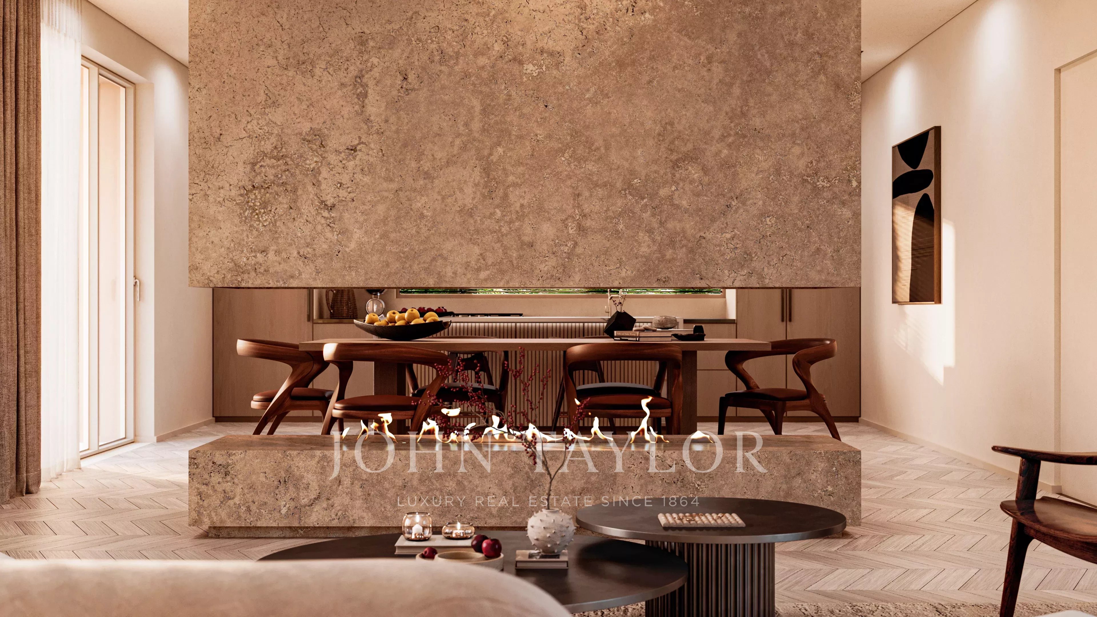 La zona living, ampia e luminosa, si apre sul paesaggio attraverso grandi vetrate e spazi esterni dedicati, tra terrazze e loggiati pensati per vivere l’esterno come naturale estensione della casa. La zona notte, più riservata e intima, si affaccia su cortili e giardini privati, offrendo quiete, privacy e un’atmosfera di autentico benessere.
