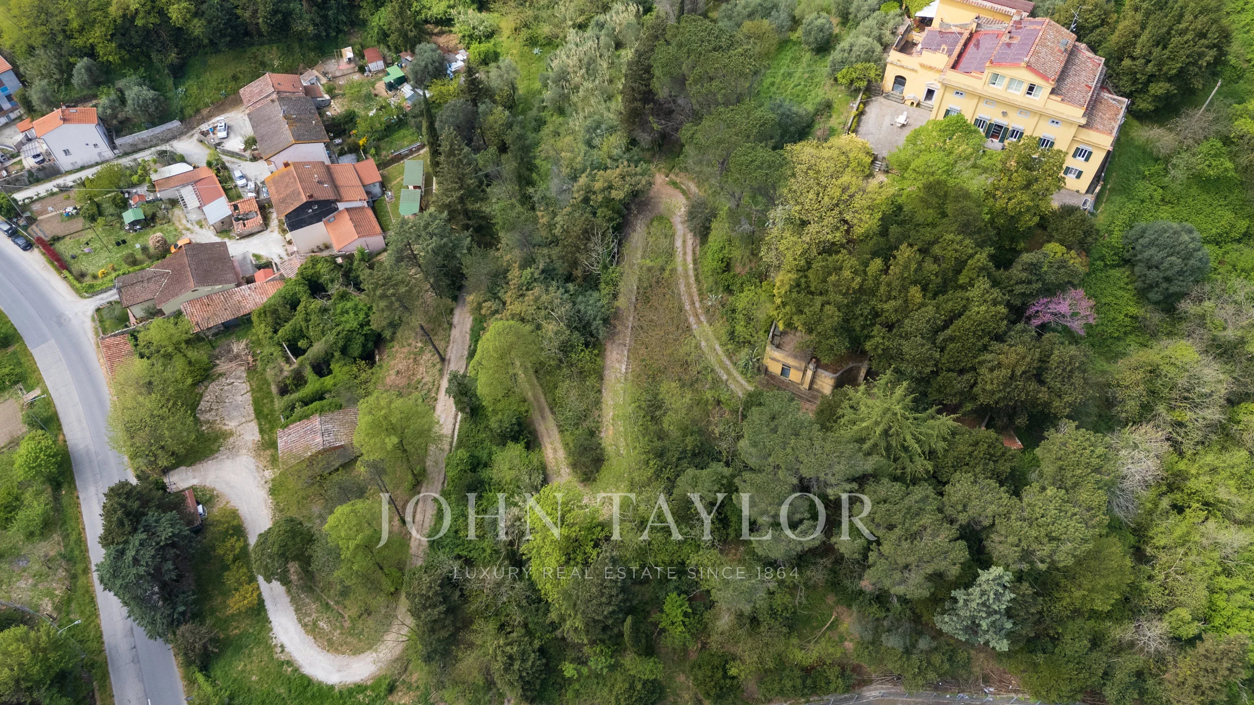 La villa principale, di circa 850 mq, gode di una posizione dominante e panoramica ed è disposta su tre livelli. L’accesso avviene attraverso un viale immerso nel parco privato, costeggiato da alberi ad alto fusto, fino al loggiato d’ingresso.